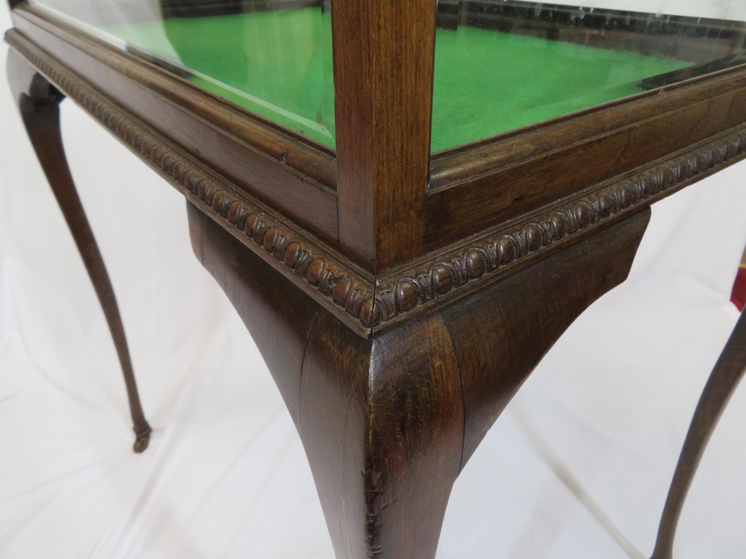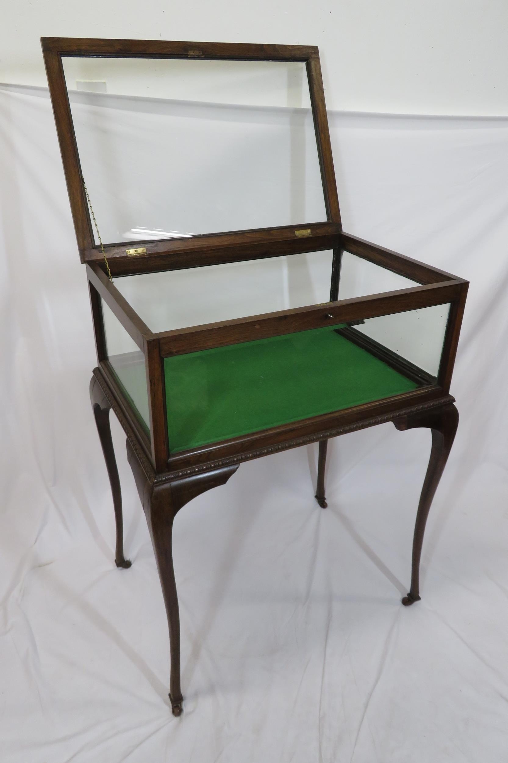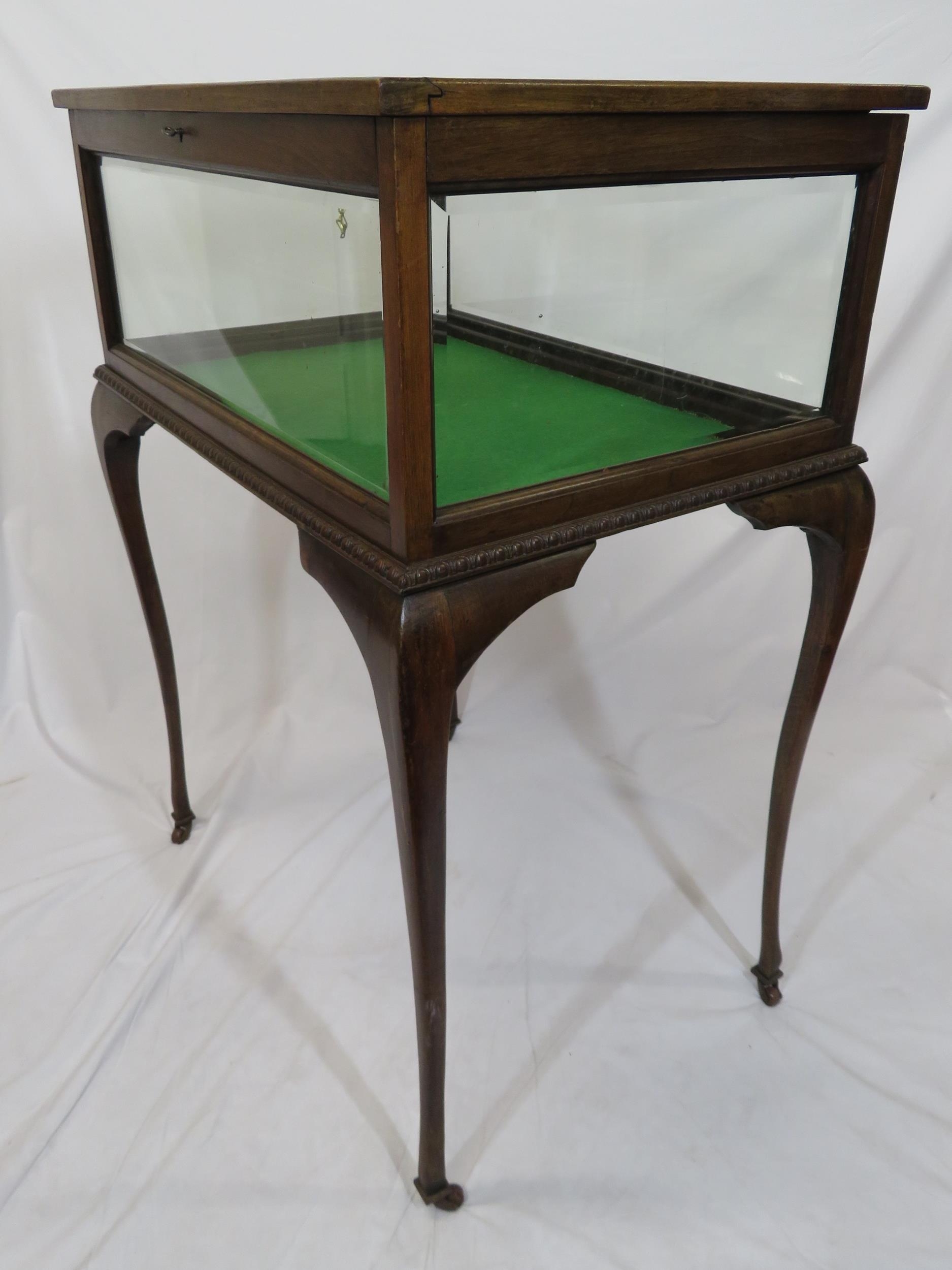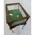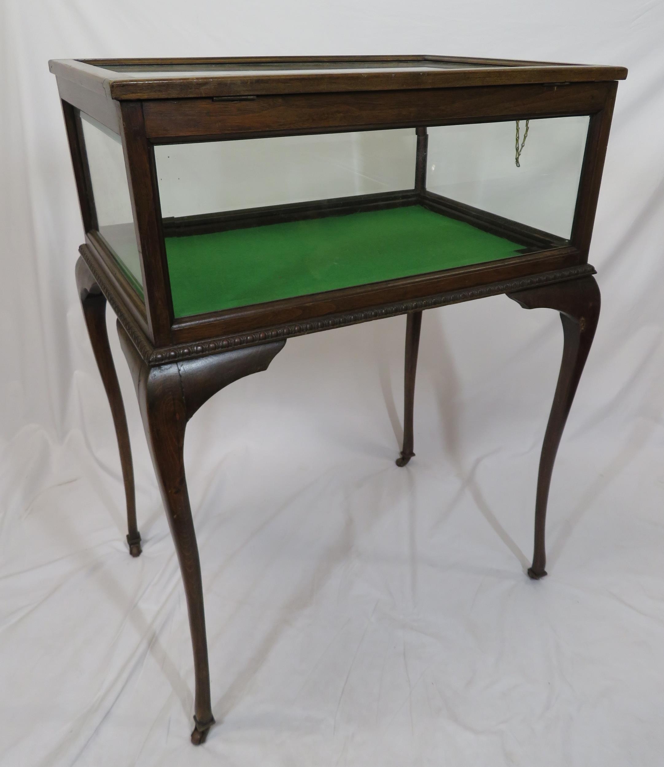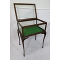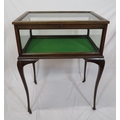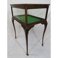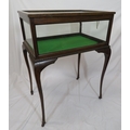 Edwardian mahogany bijouterie table with glazed top and sides, lift-up lid, lined base, on cabriole legs with castors