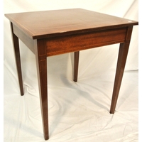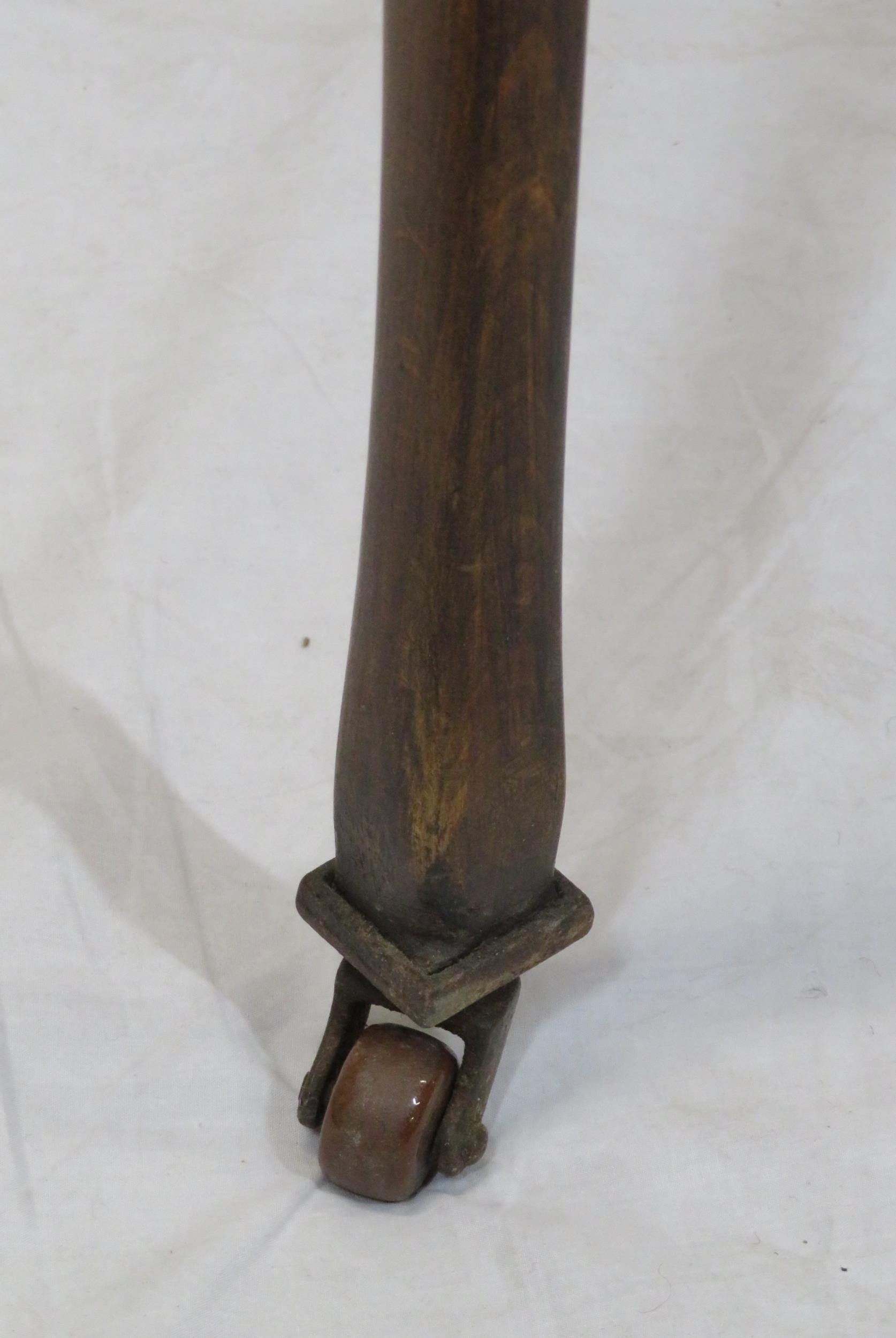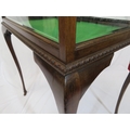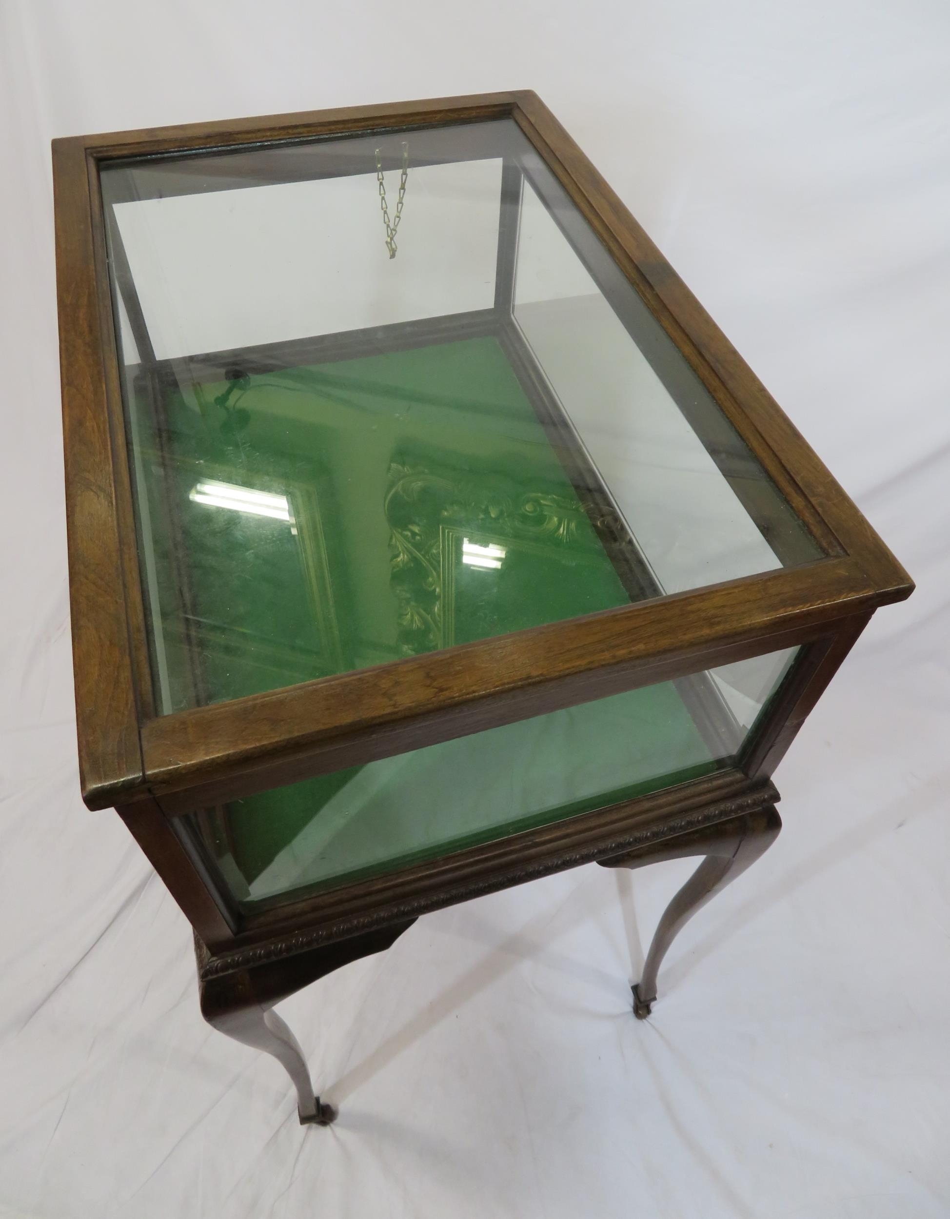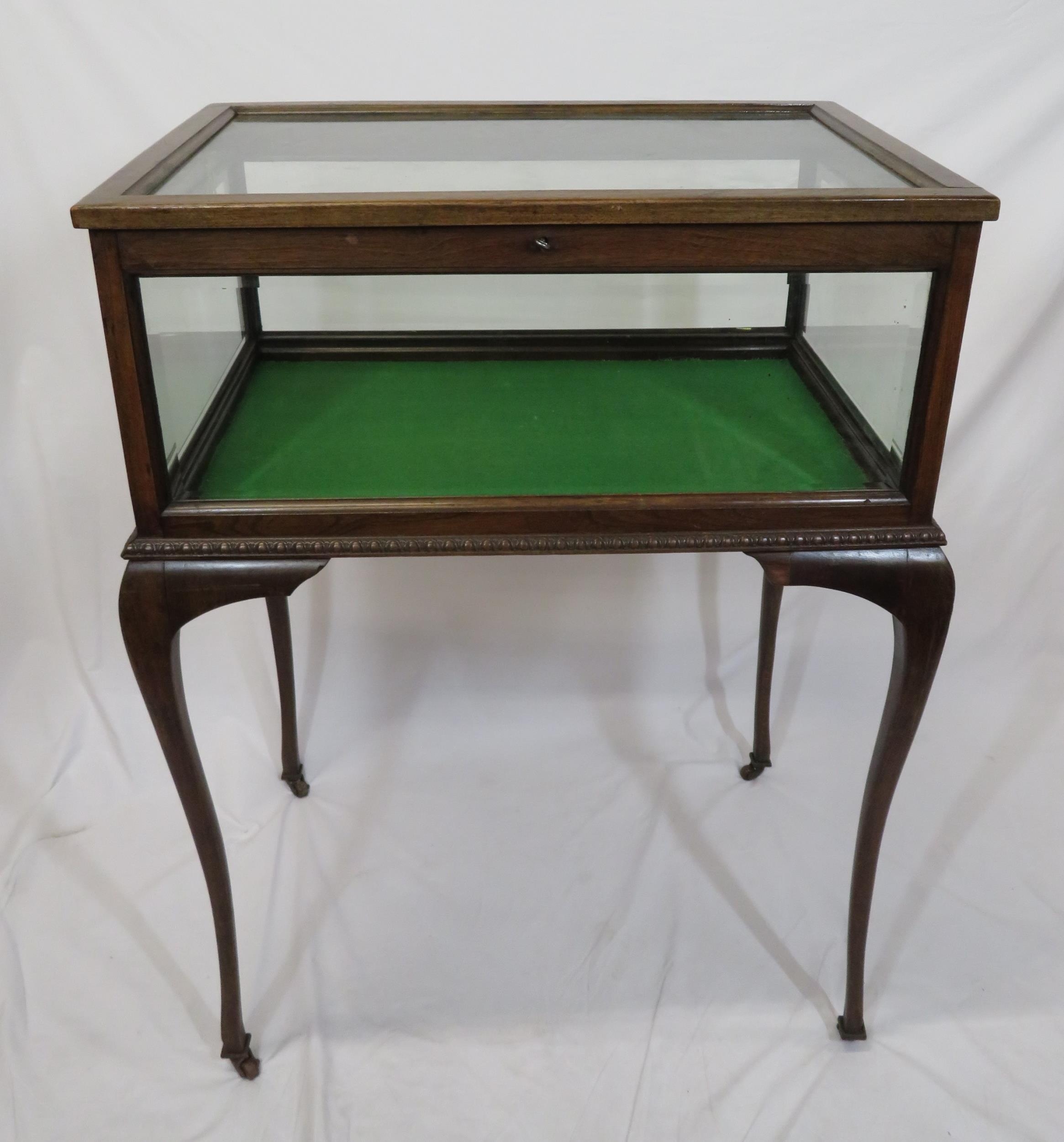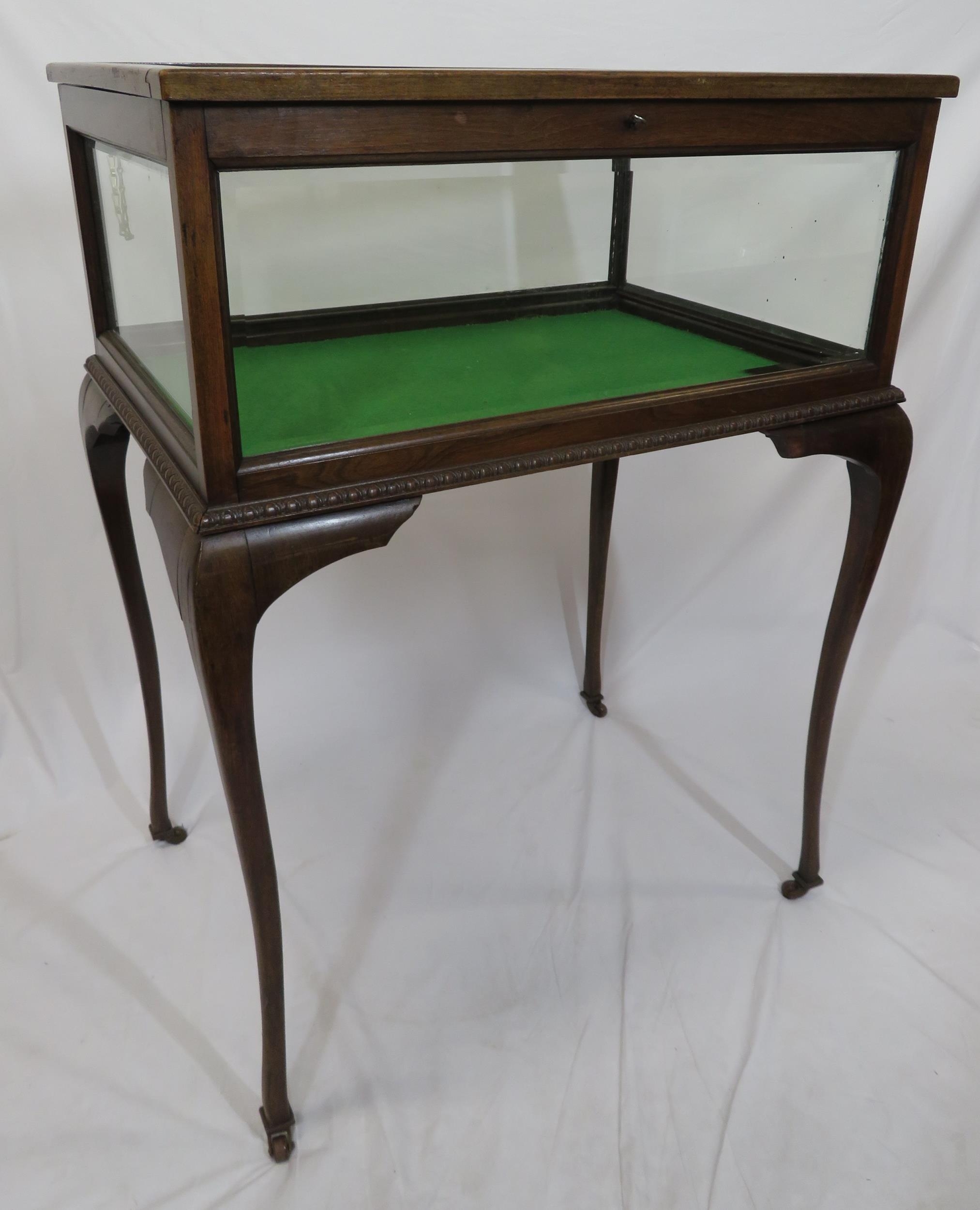 Edwardian mahogany bijouterie table with glazed top and sides, lift-up lid, lined base, on cabriole legs with castors