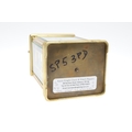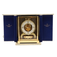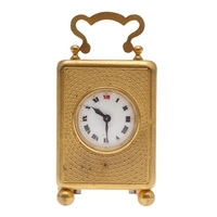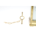 Winds but striking mechanism malfunctions - does not strike on the hour/half hour but continually strikes when wound until run down. Surface wear to metal case, retailer's name partially worn to dial.