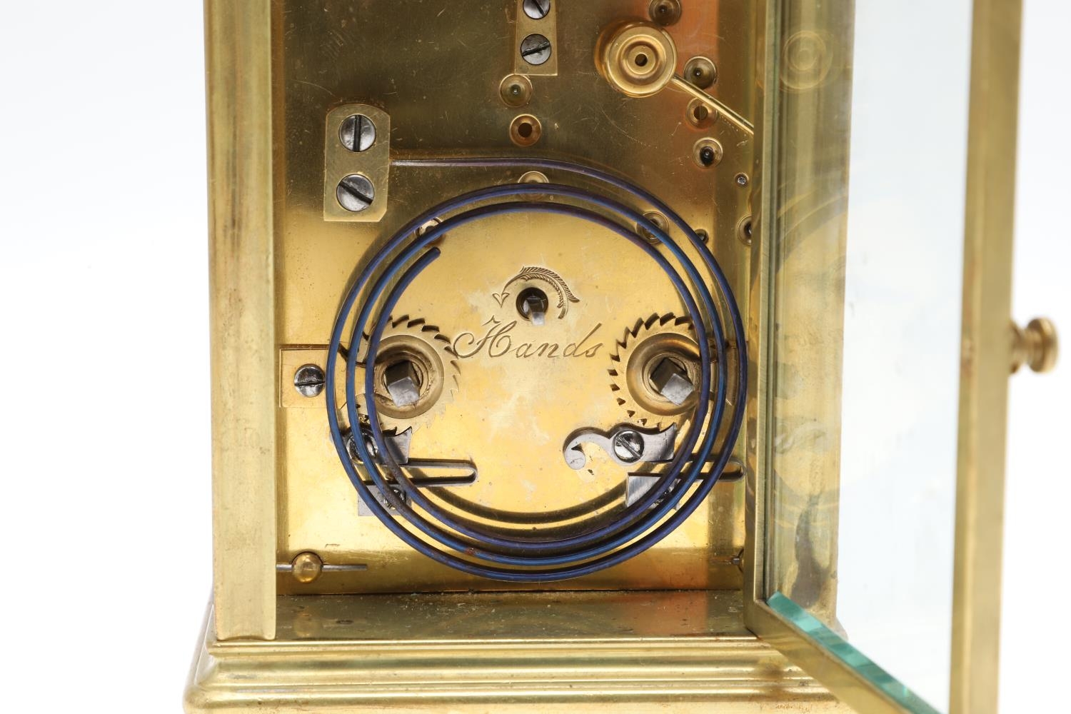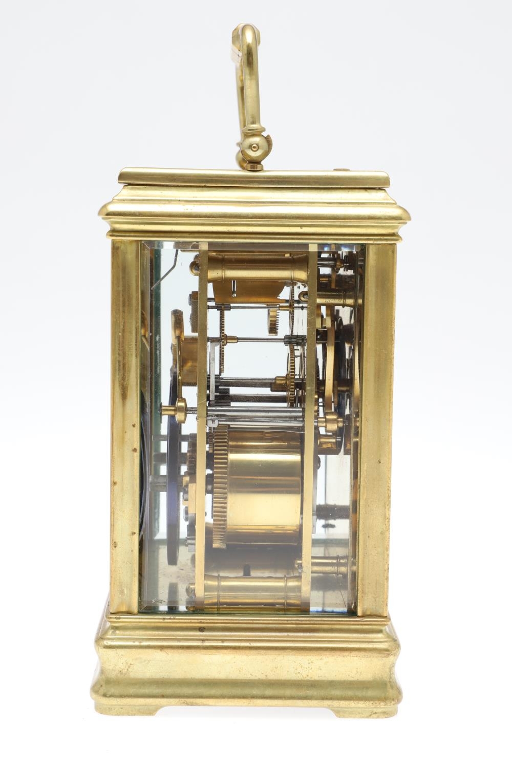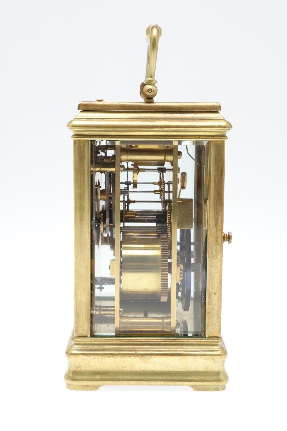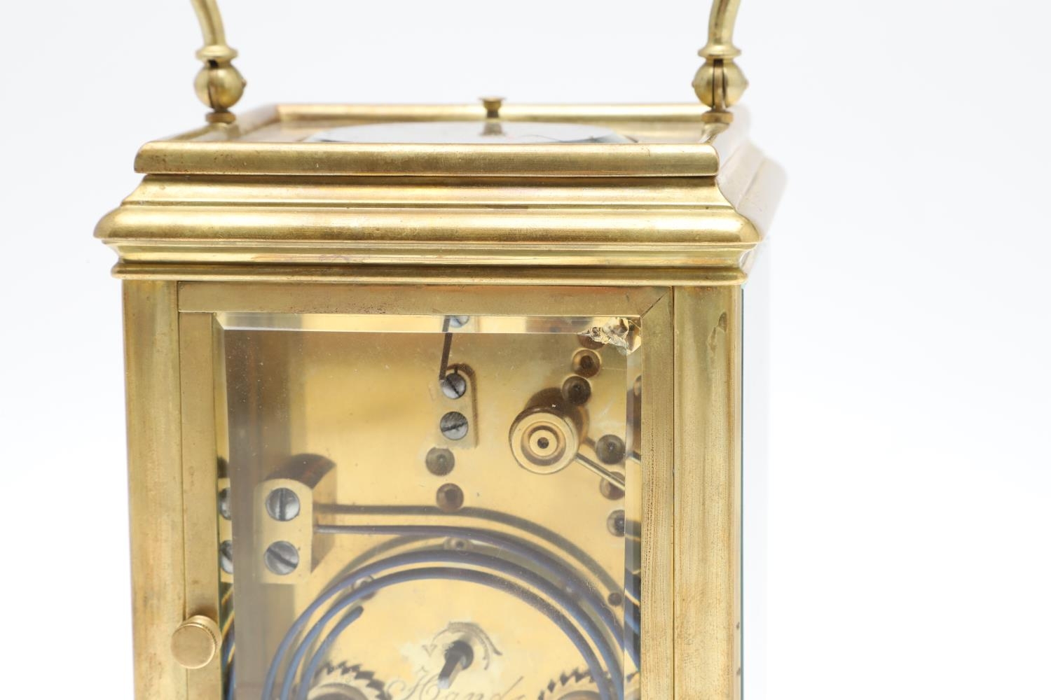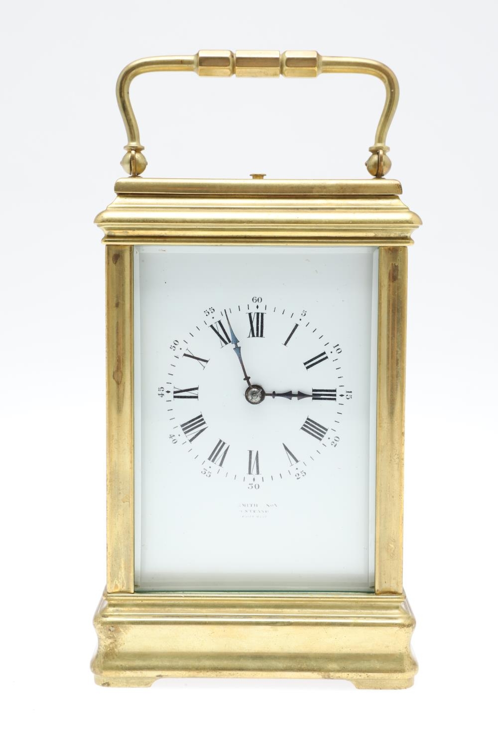 A LATE 19TH CENTURY FRENCH REPEATER CARRIAGE CLOCK. the plain five-glass case with swing carrying handle, the white enamel dial with black Roman numerals, indistinctly signed ...smiths & Son, ...Strand, London, spring-driven movement with platform escapement, height 18.5cm inc. handle.