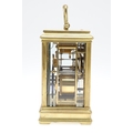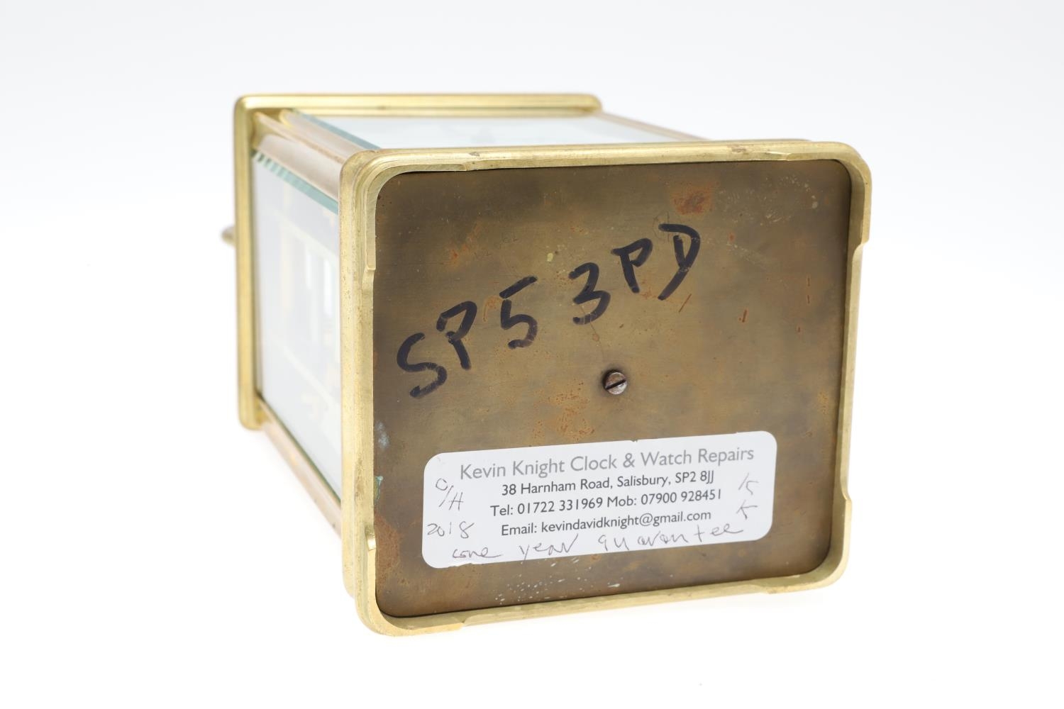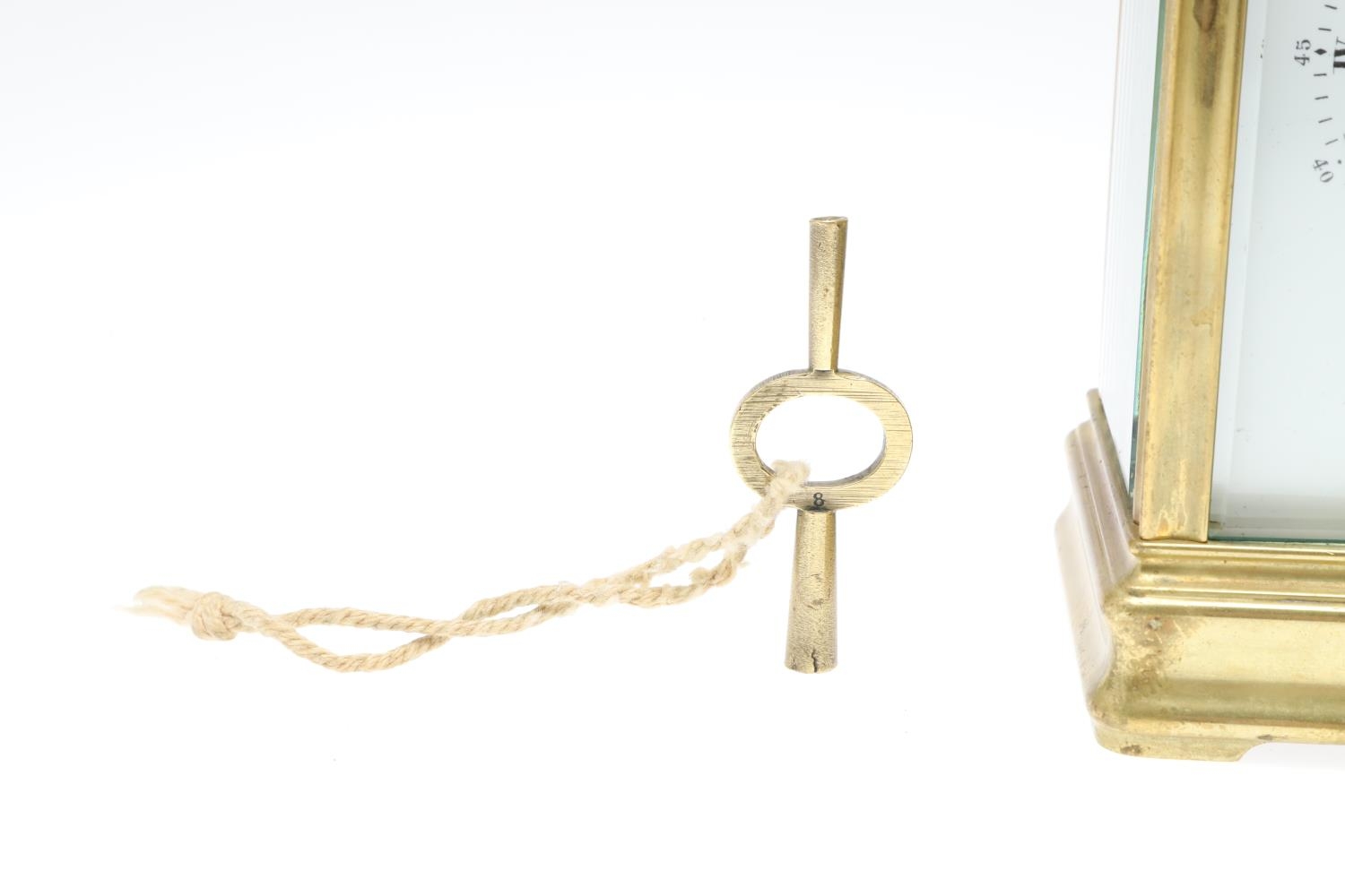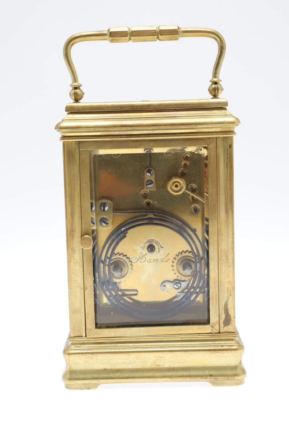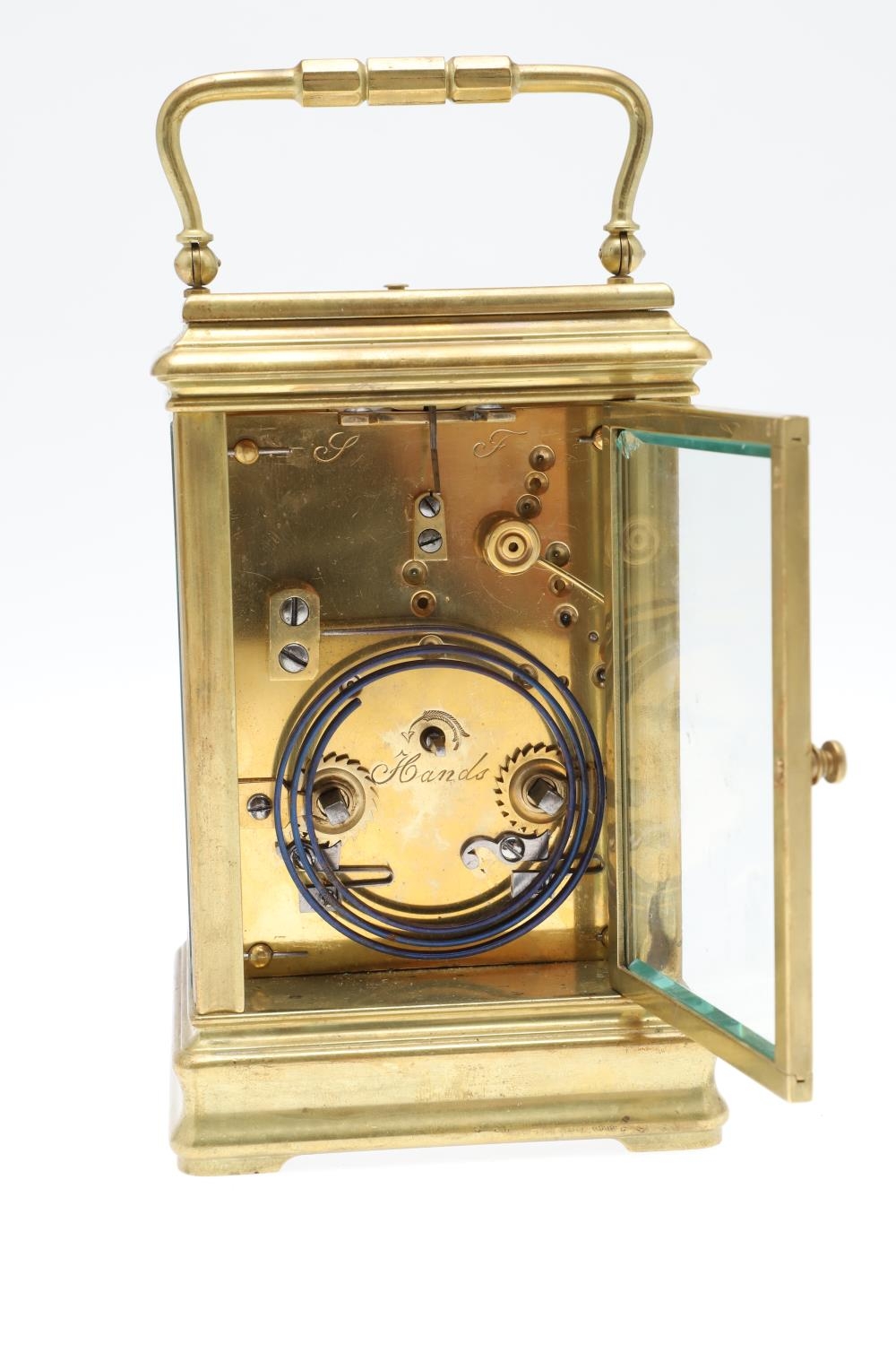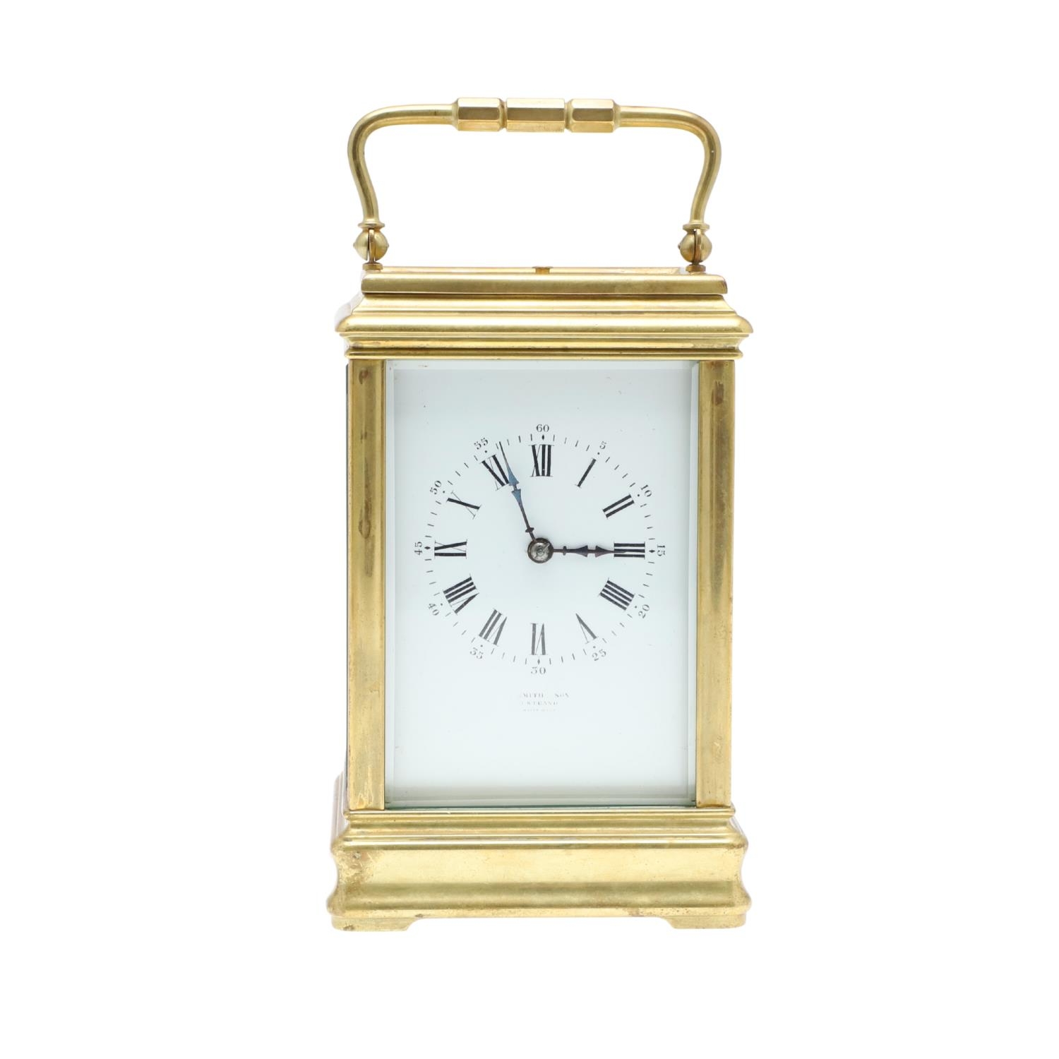 A LATE 19TH CENTURY FRENCH REPEATER CARRIAGE CLOCK. the plain five-glass case with swing carrying handle, the white enamel dial with black Roman numerals, indistinctly signed ...smiths & Son, ...Strand, London, spring-driven movement with platform escapement, height 18.5cm inc. handle.