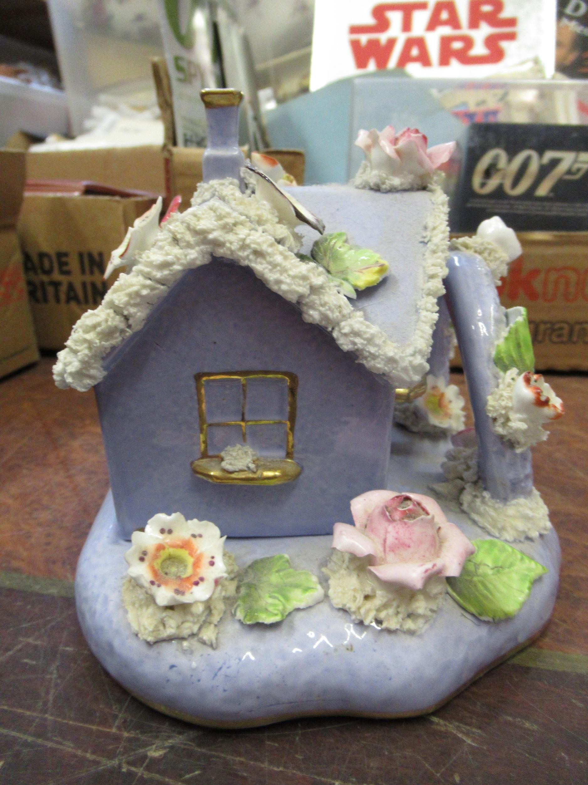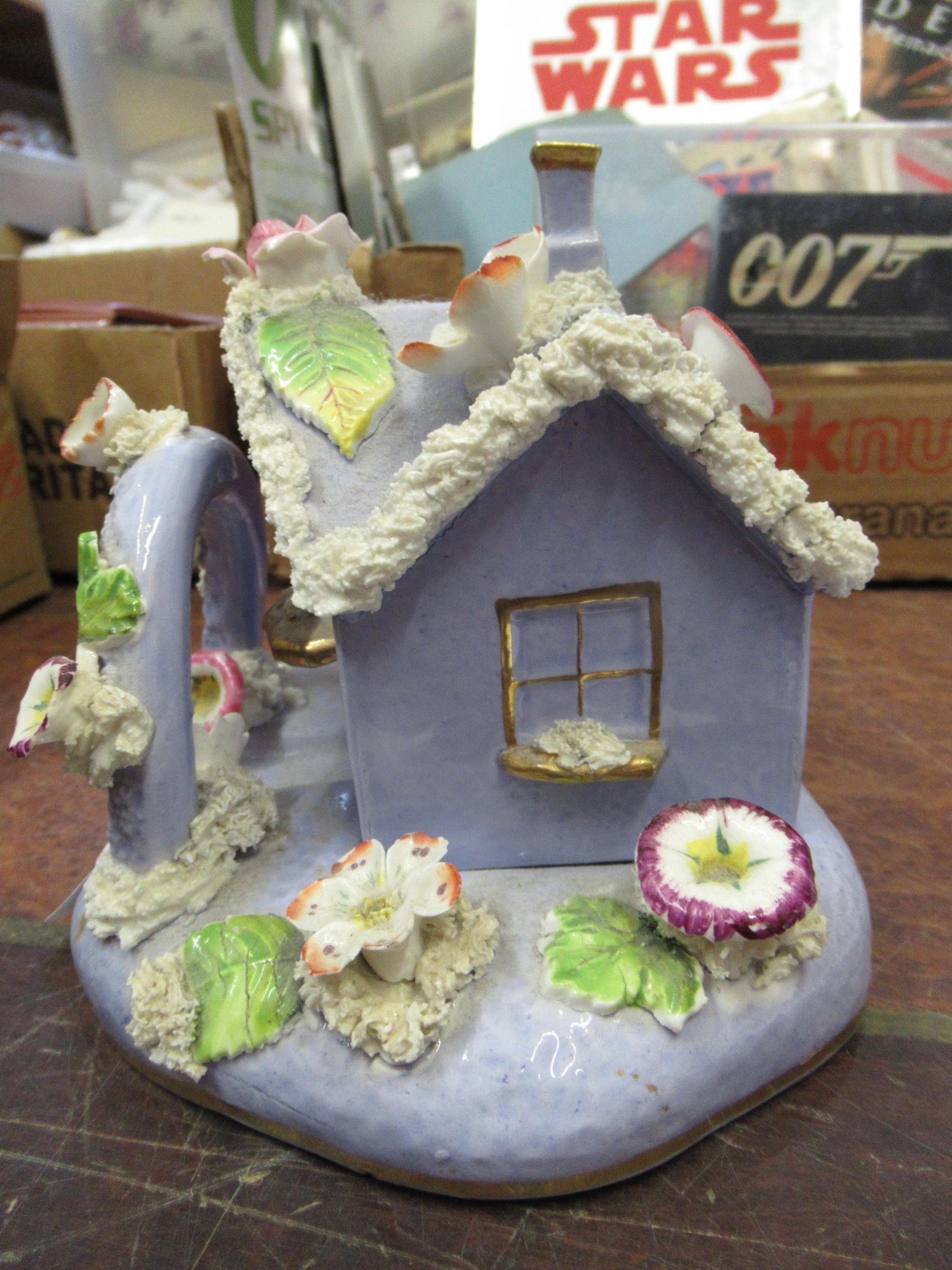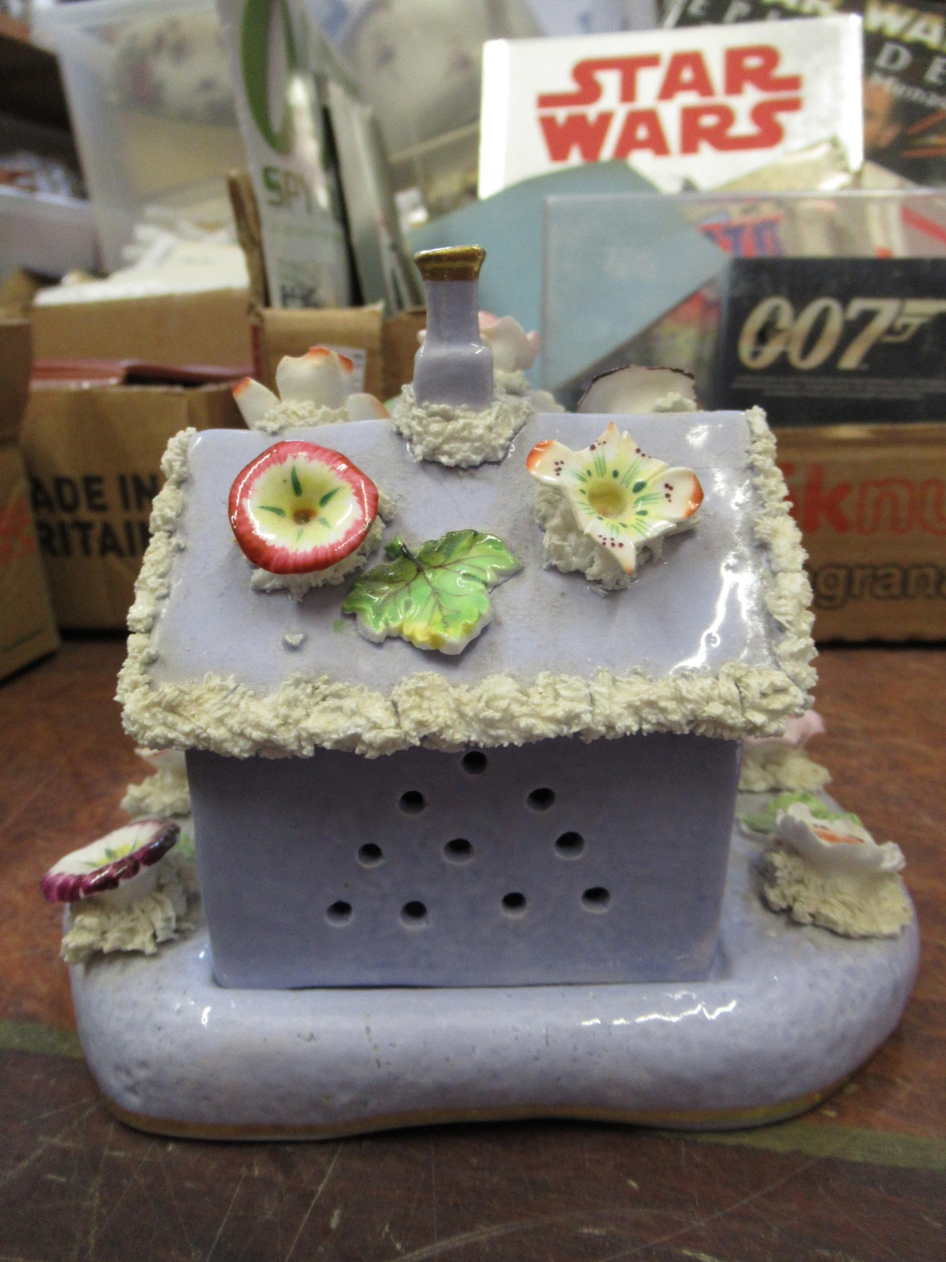19th Century English floral encrusted pastille burner cottage with stand, and a small quantity of other 19th / 20th Century English porcelain and pottery