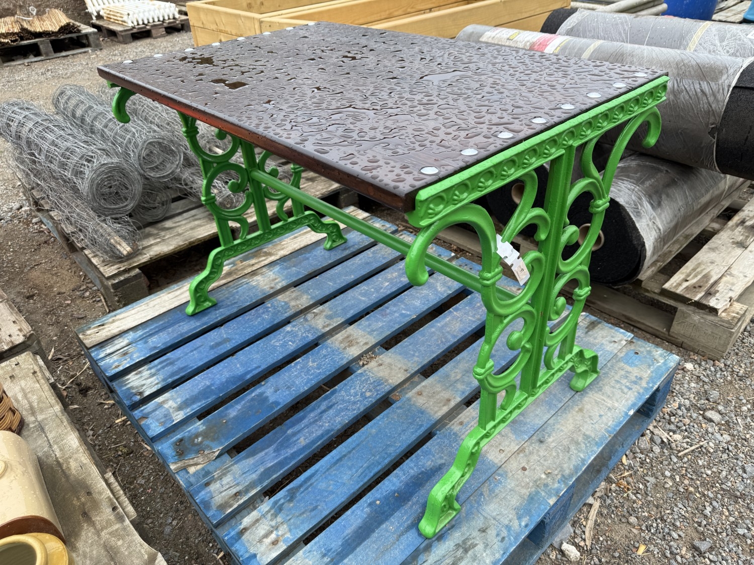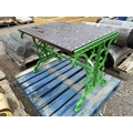 A cast metallic and wooden garden table modelled in the Victorian style