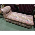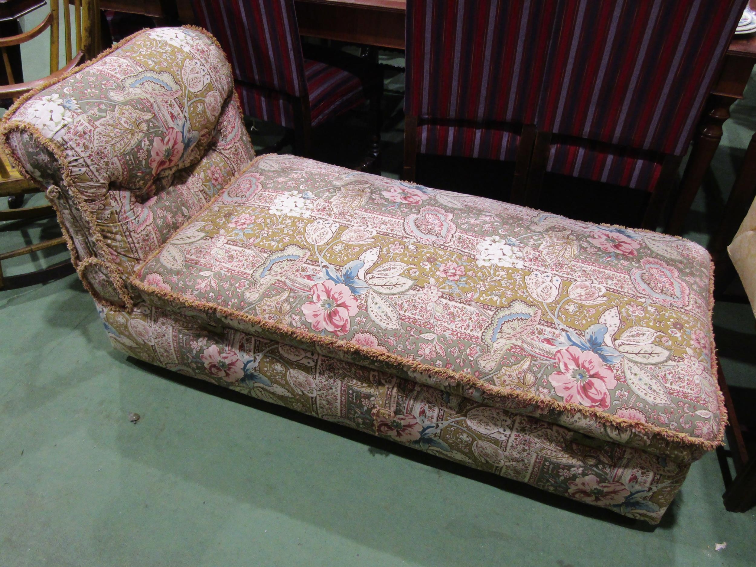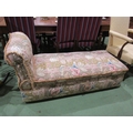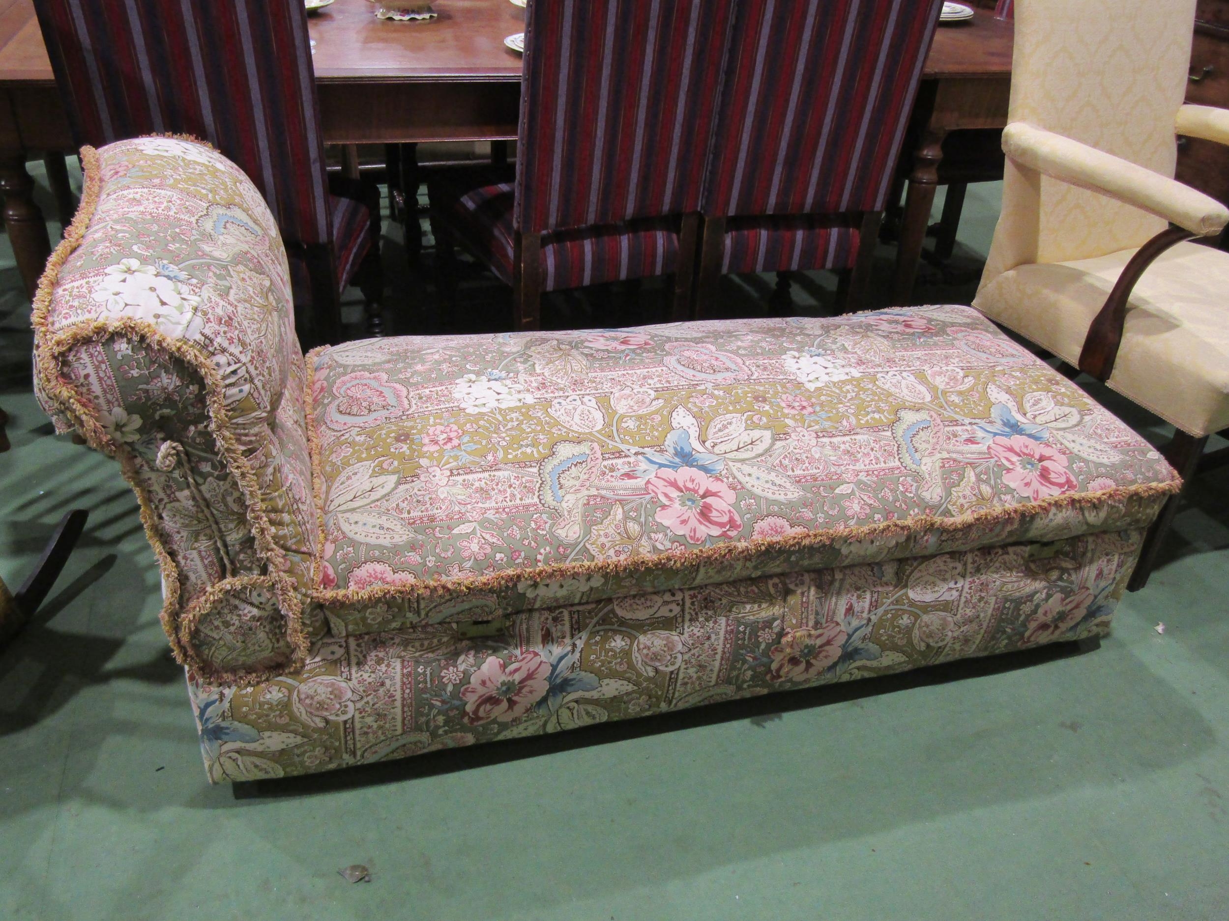 An upholstered day bed in floral fabrics on castors, with lift up storage compartment,