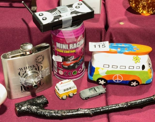 Collectibles Incl Micro RC Car, Vintage Die Cast Car, VW Camper Ceramic Moneybox, Hip Flask & Shillelagh