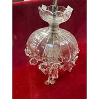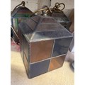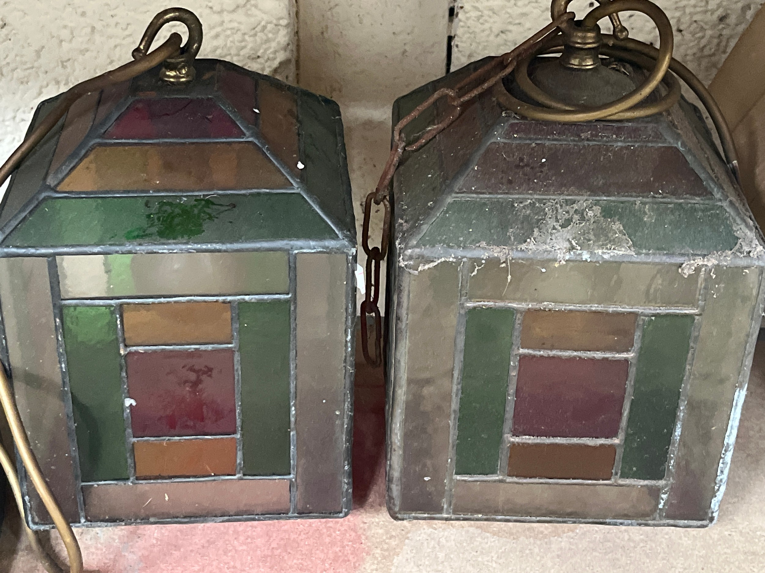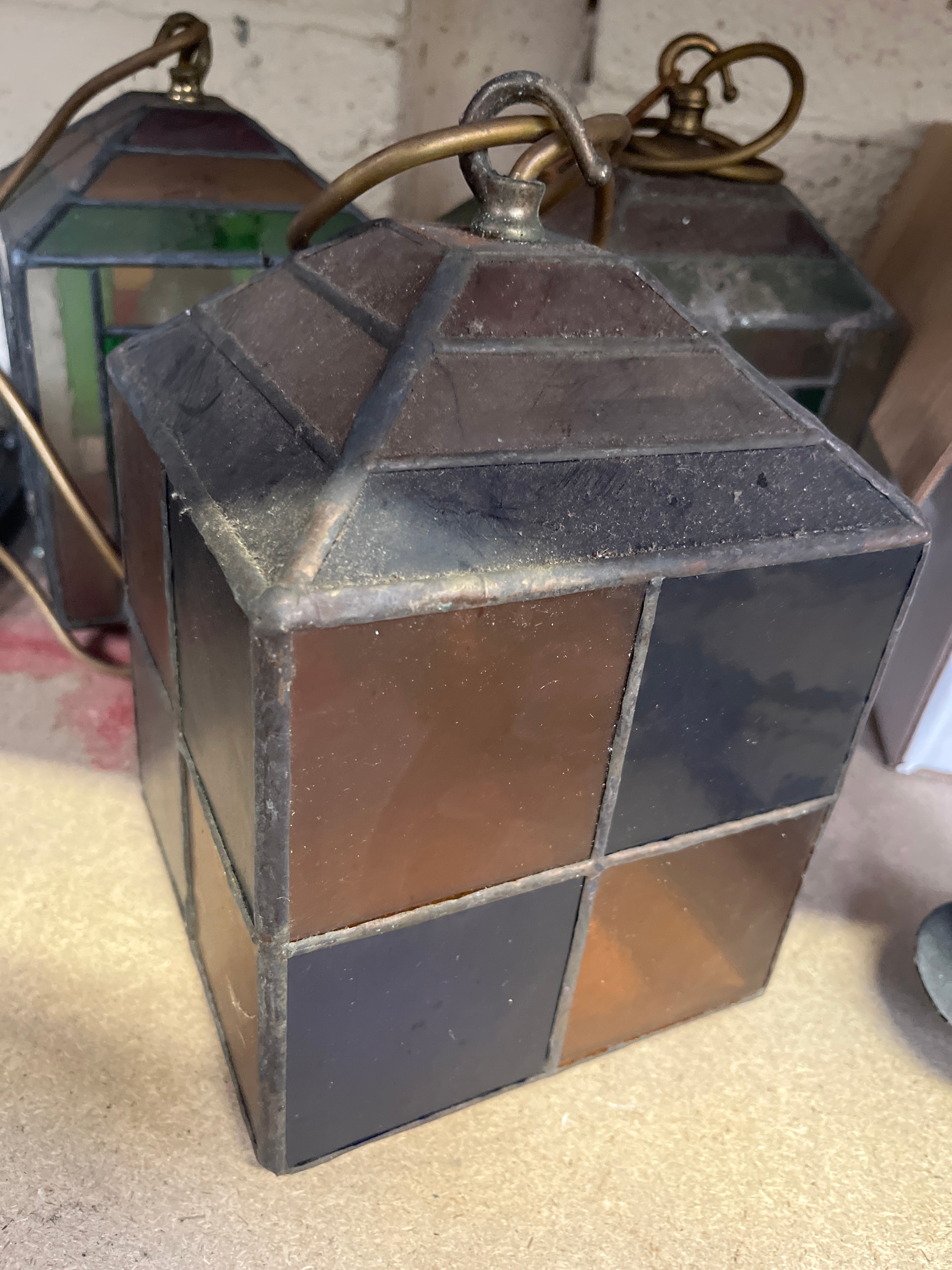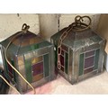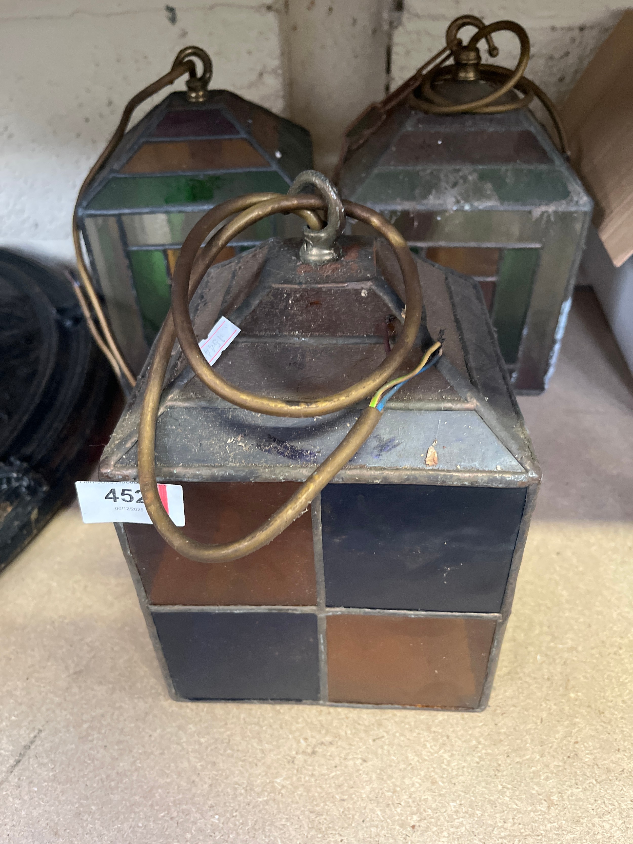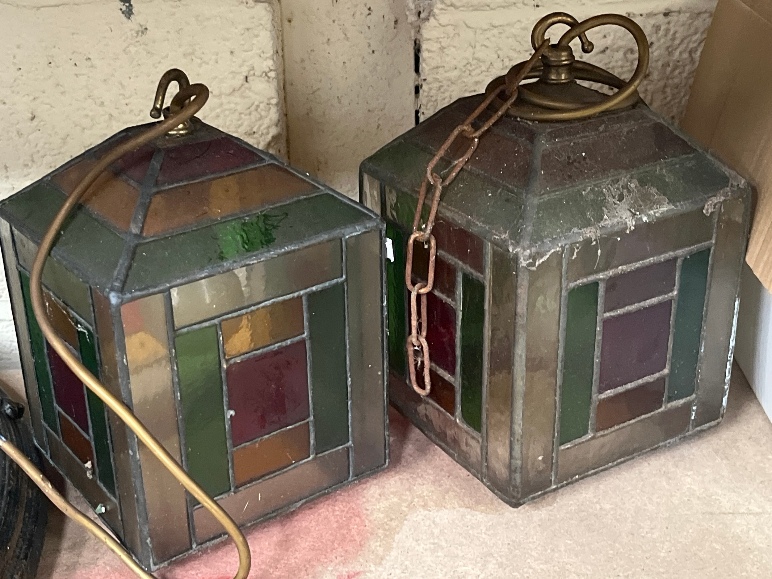 Three early 20thC leaded glass pendant lamp shades, wired to electric with brass fittings and stained glass panels. Including a pair with green, red and yellow panels and a further individual with blue and orange panels. Approx 16cm square.