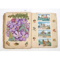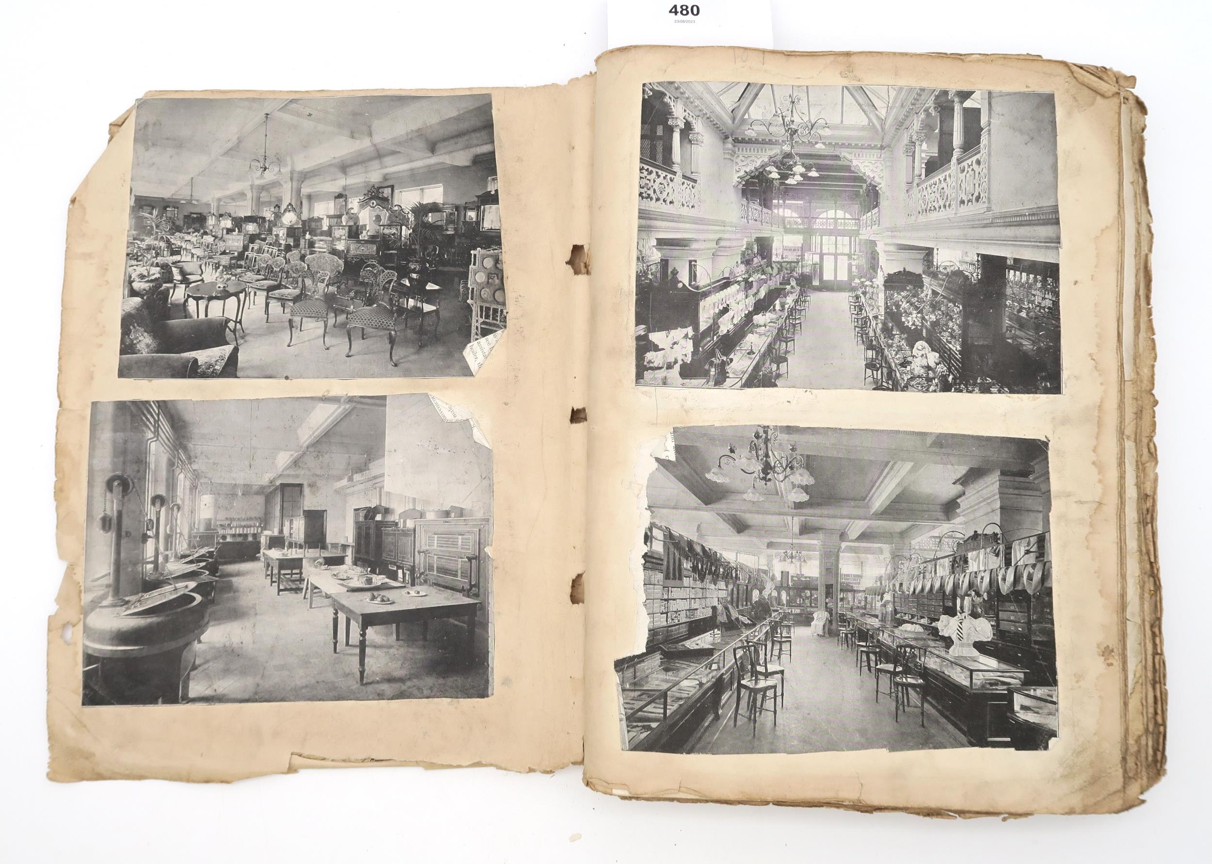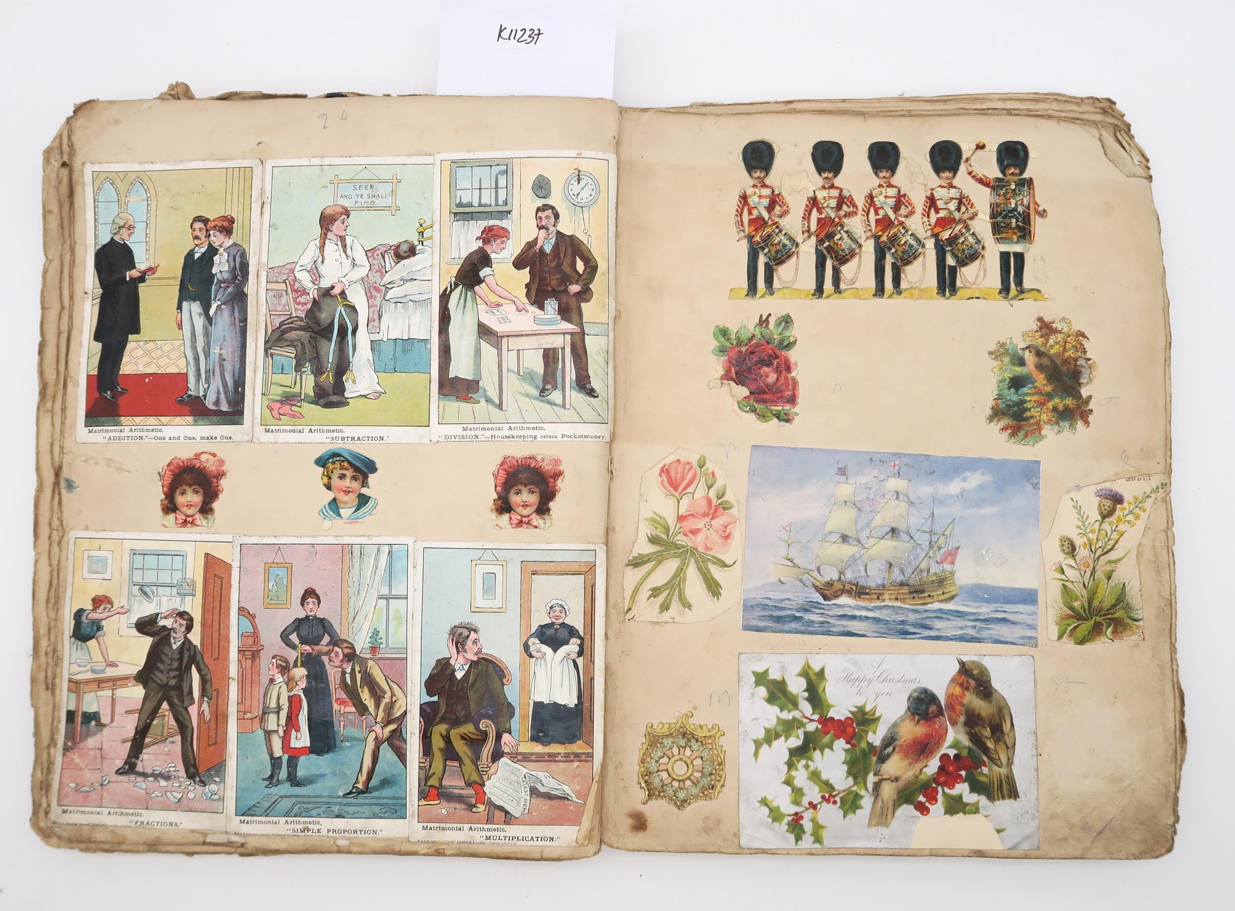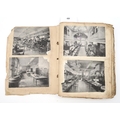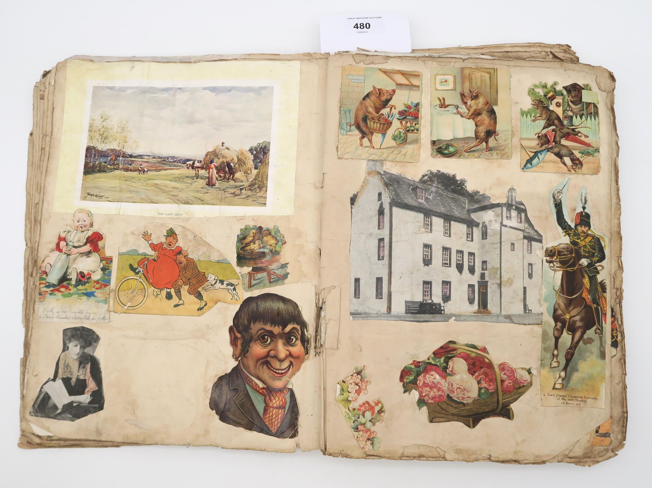 A scrap book, circa 1910, with varied contents to include royalty, seaside postcards, cartoons, photographs of department store interiors etc.