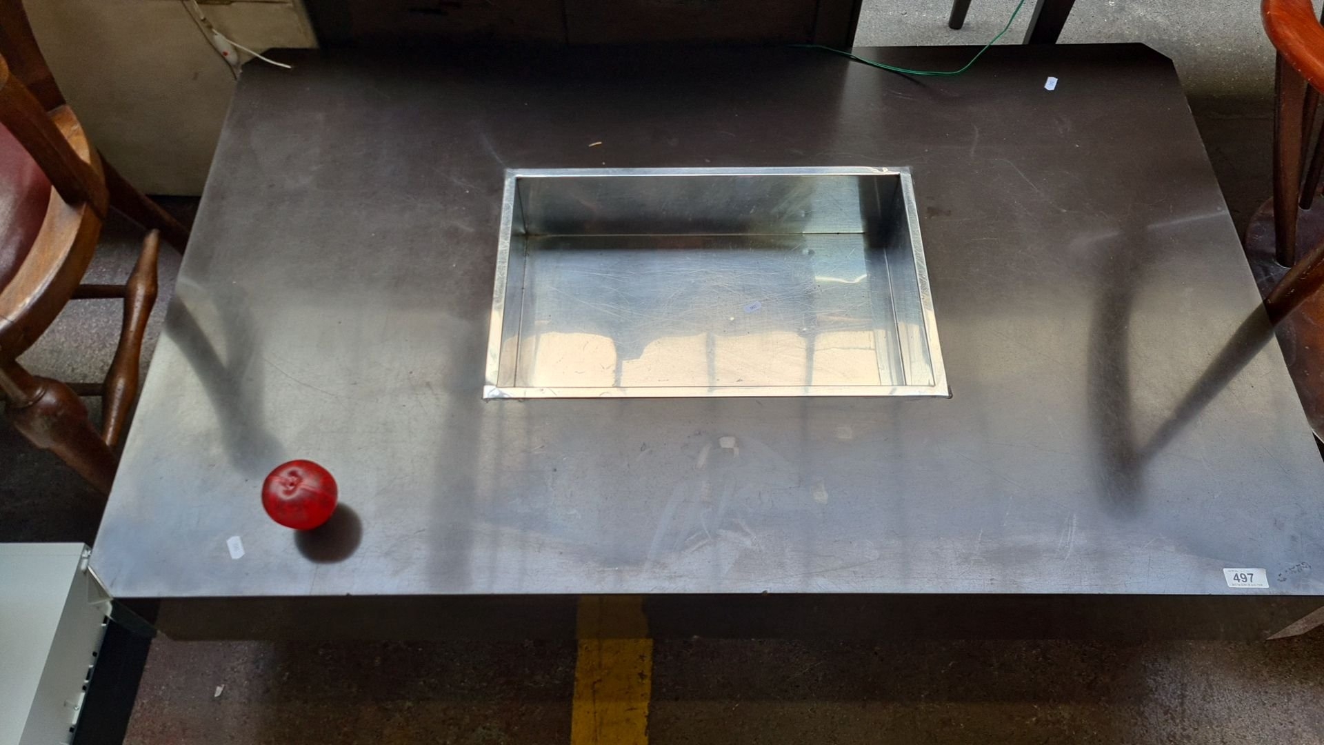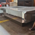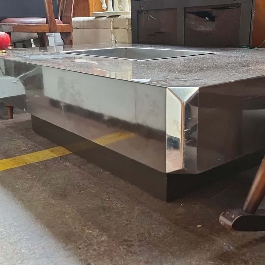 Star lot : A fabulous Mid-Century Modern coffee table with Stainless Steel corners and a central Stainless Steel reservoir for Ice and cold drinks. Very mid century chic.