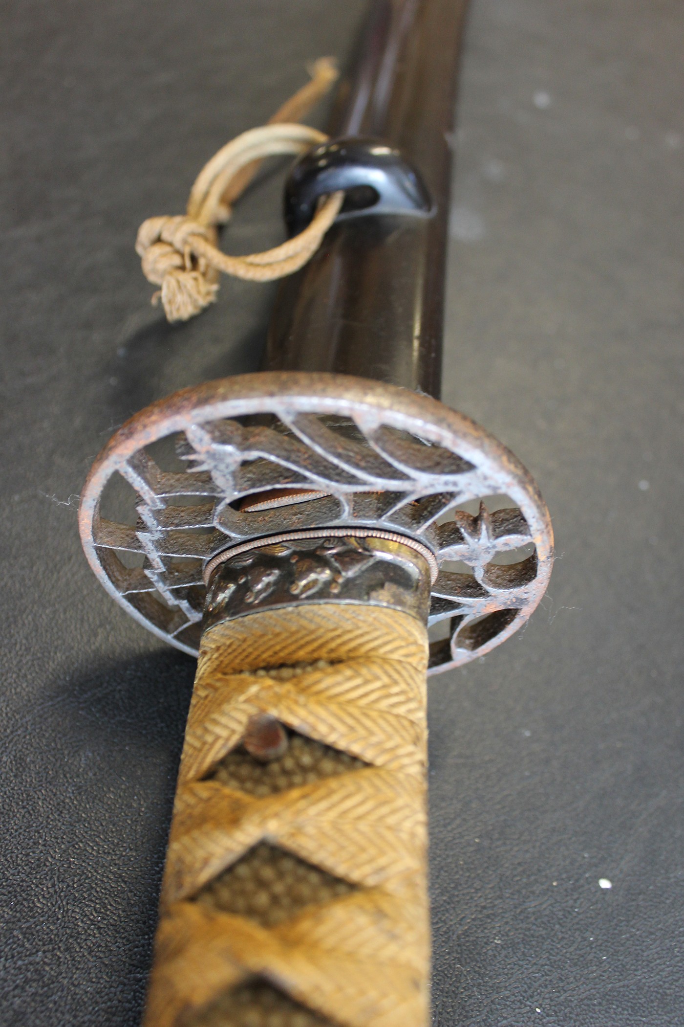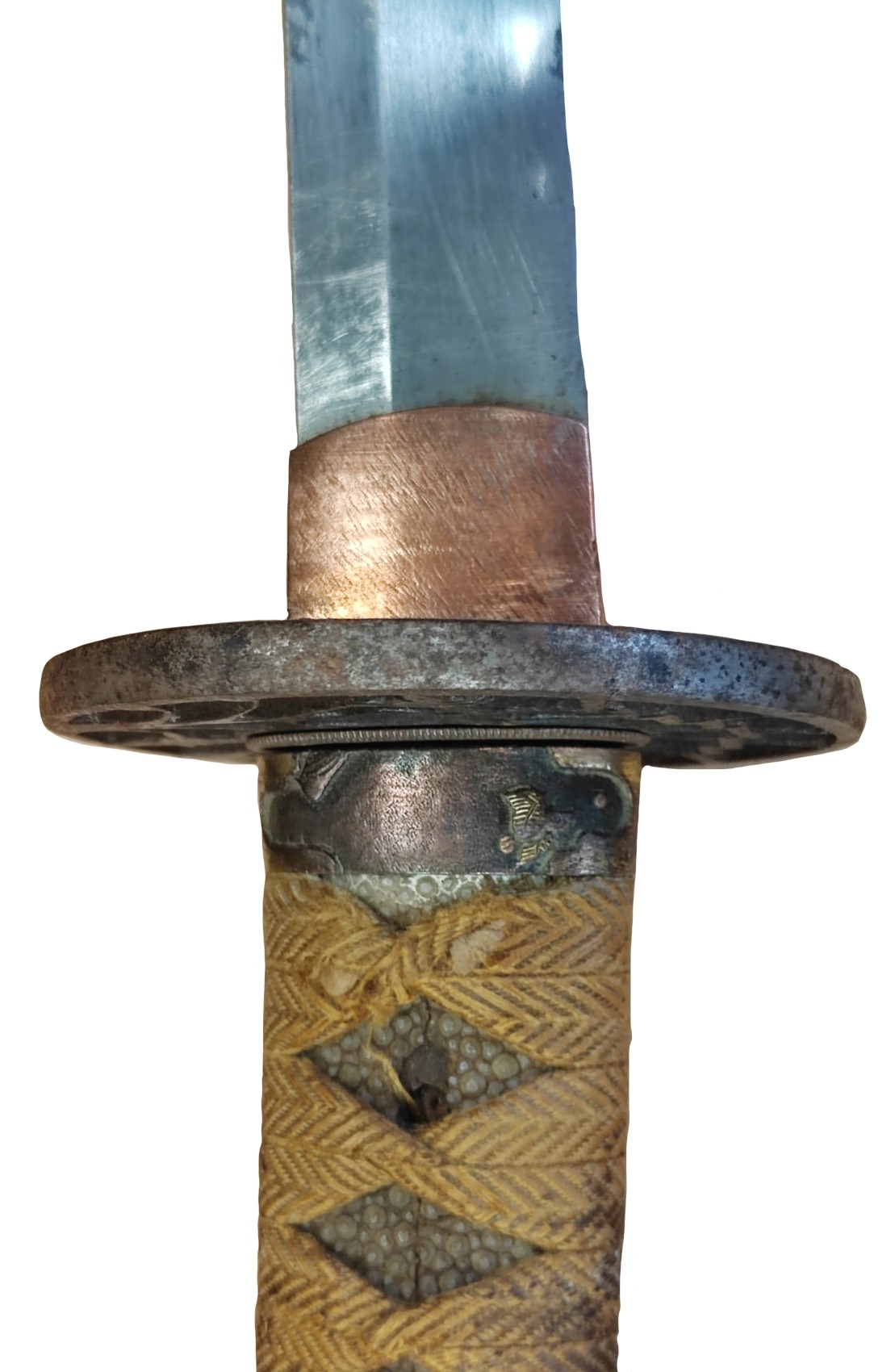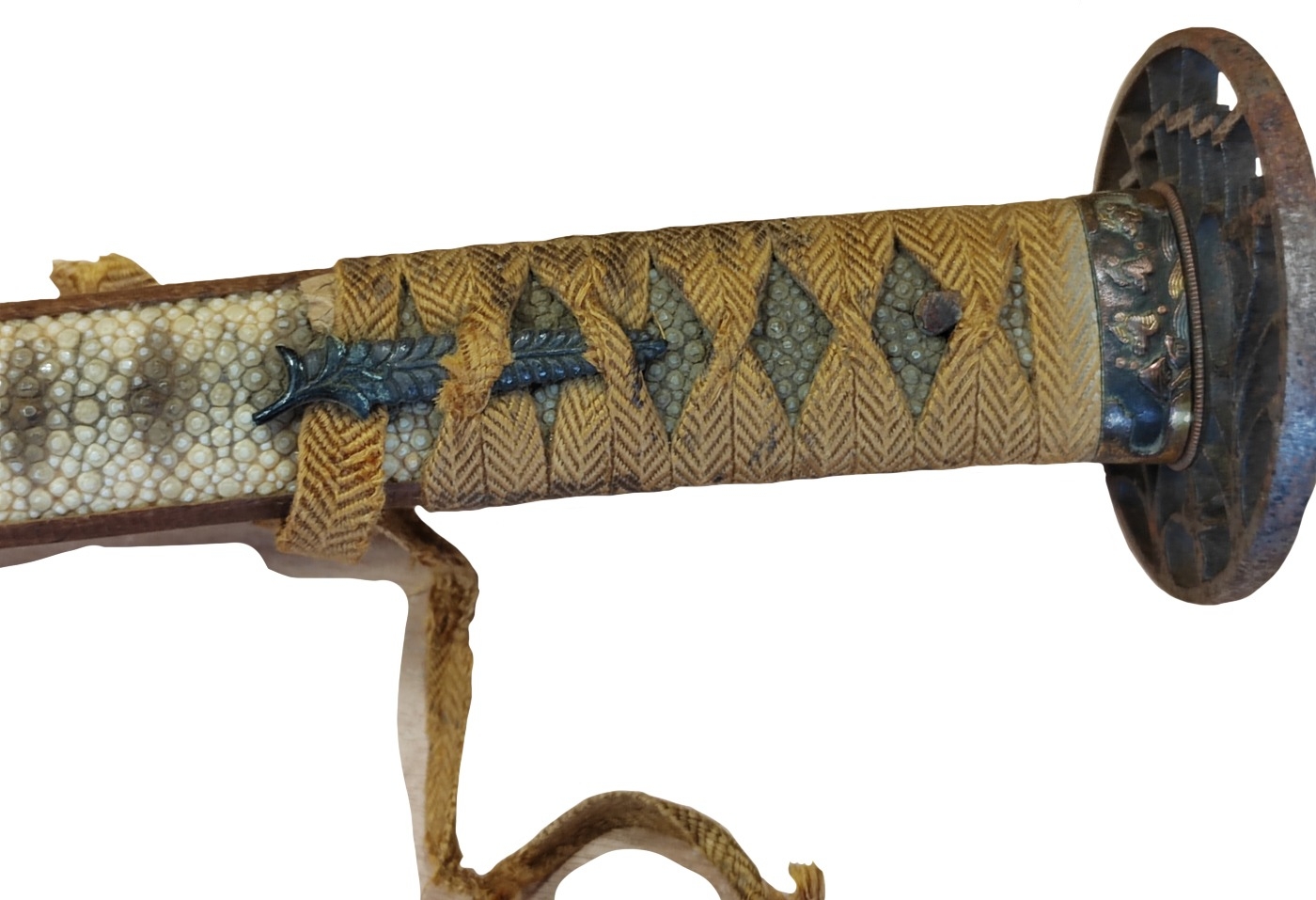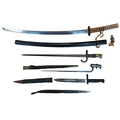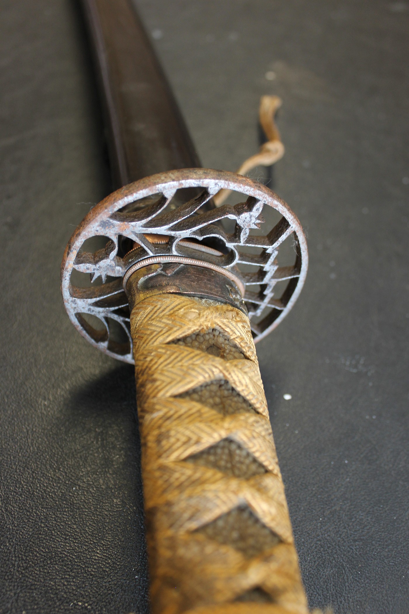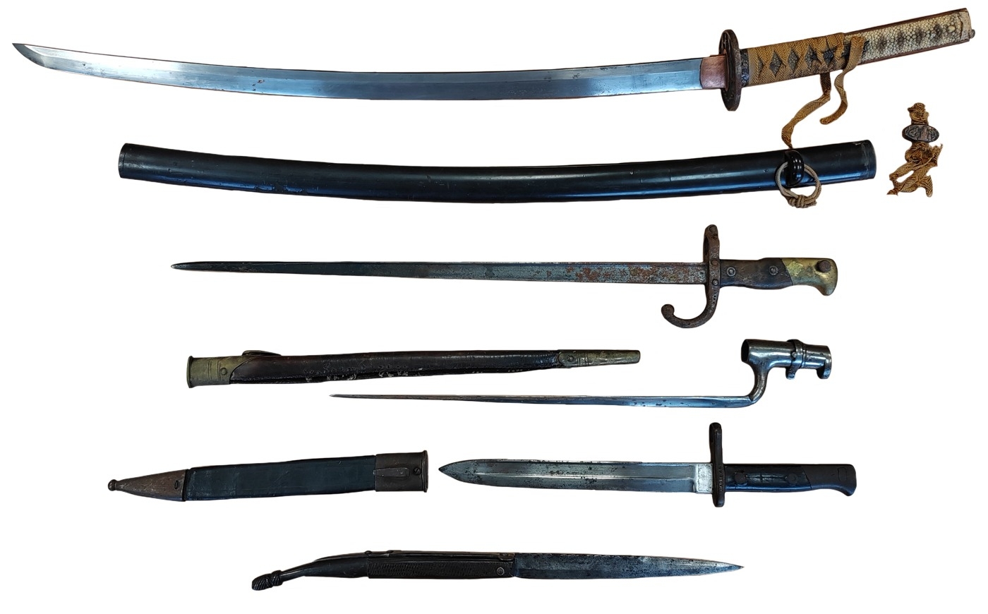 Edged weapon range with Japanese Katana with scabbard, some light pitting and discolouration to blade otherwise extremely fine, subtle Hamon line, loose tsuba, fuchi, seppa, ray skin grip with loose ito wrap, Kashira broken off but present, plus 1907 bayonet with scabbard, 1876 bayonet with leather scabbard, Gras bayonet and a Spanish Navaja, pitting to all blades, overall mixed condition plus Hitler Youth armband in near excellent condition. BUYER MUST COLLECT (B)
