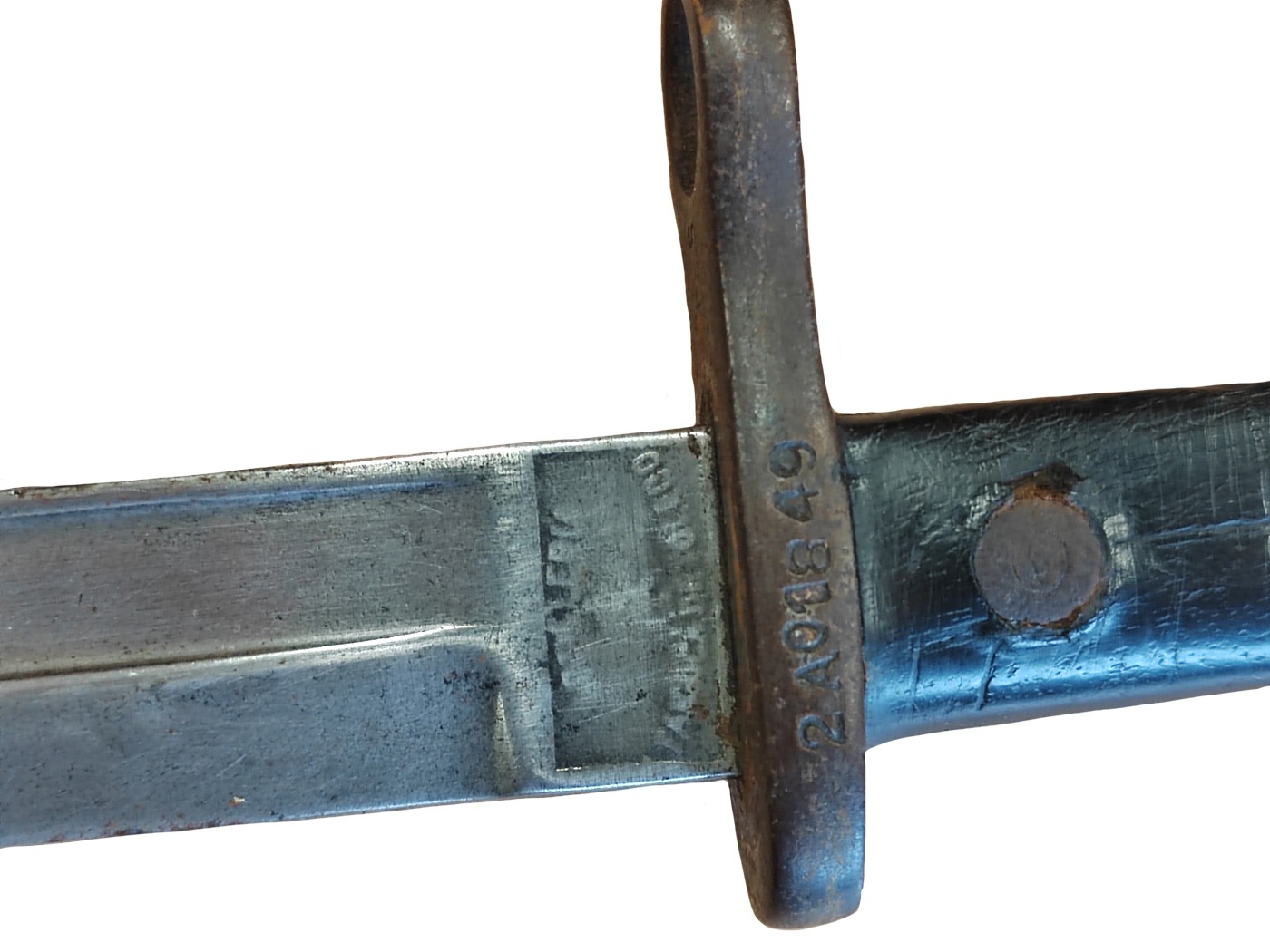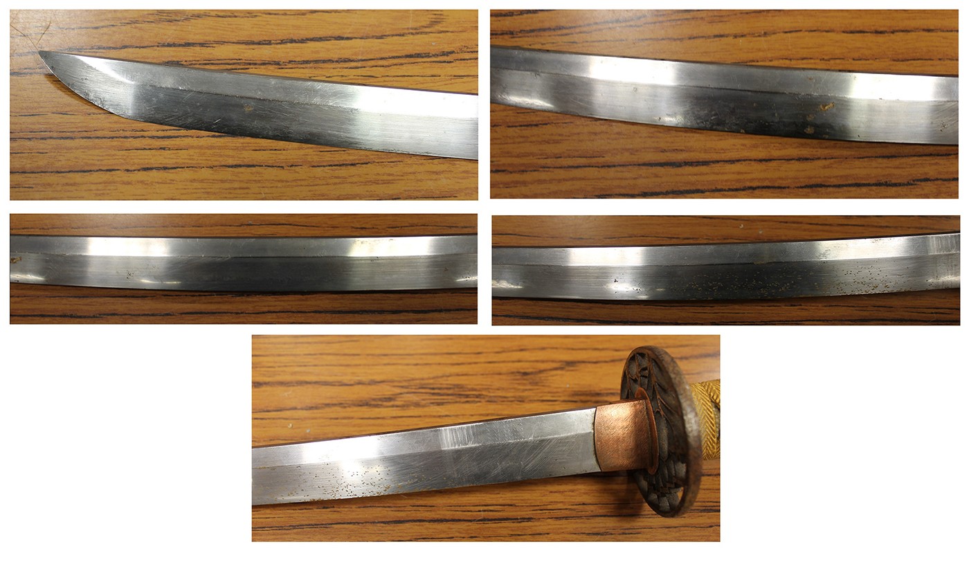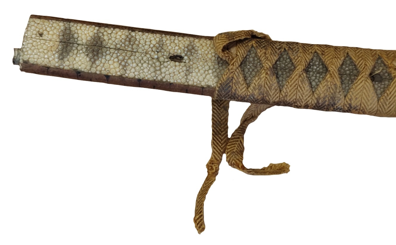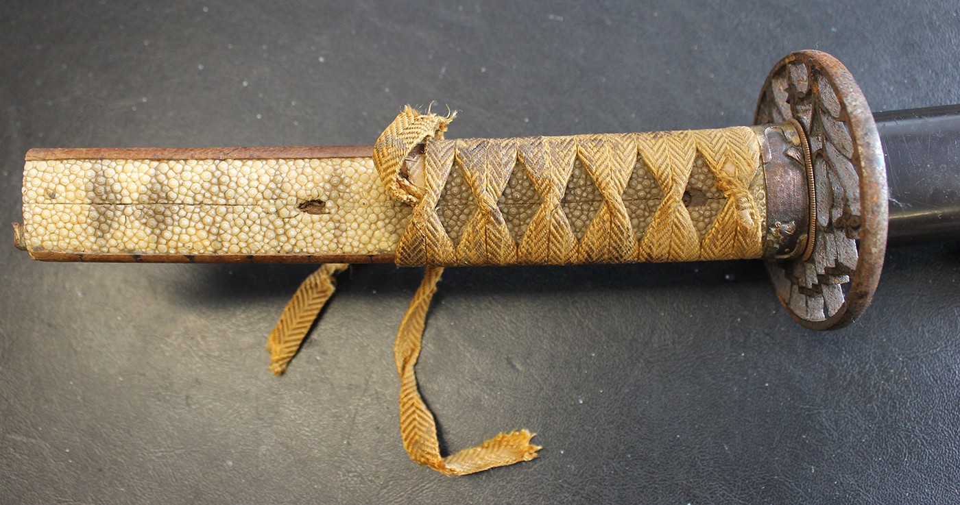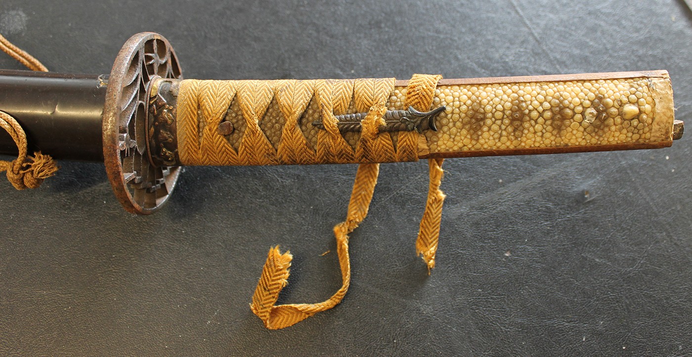 Edged weapon range with Japanese Katana with scabbard, some light pitting and discolouration to blade otherwise extremely fine, subtle Hamon line, loose tsuba, fuchi, seppa, ray skin grip with loose ito wrap, Kashira broken off but present, plus 1907 bayonet with scabbard, 1876 bayonet with leather scabbard, Gras bayonet and a Spanish Navaja, pitting to all blades, overall mixed condition plus Hitler Youth armband in near excellent condition. BUYER MUST COLLECT (B)
