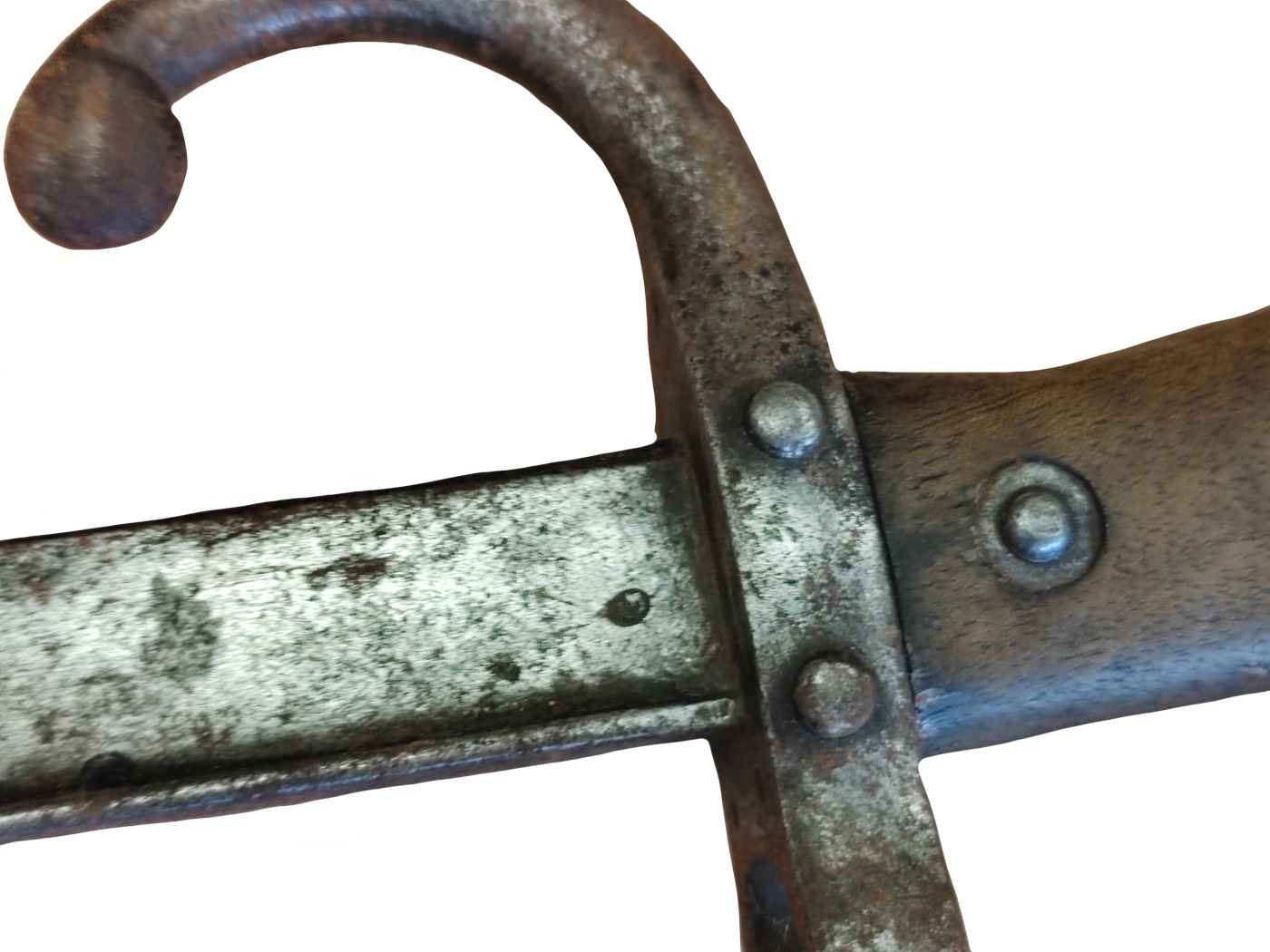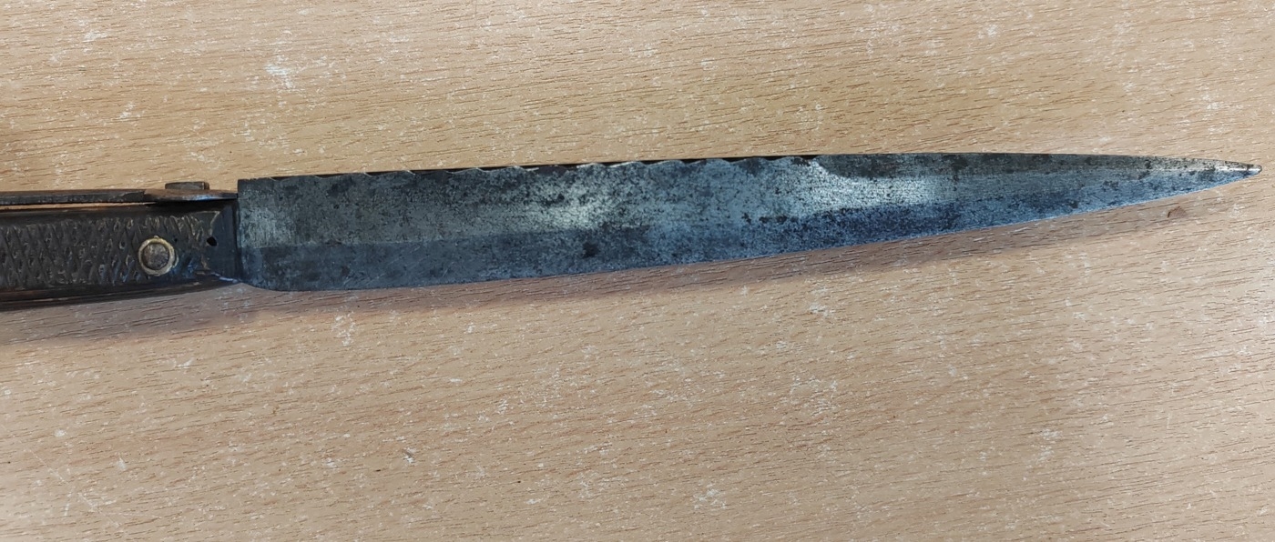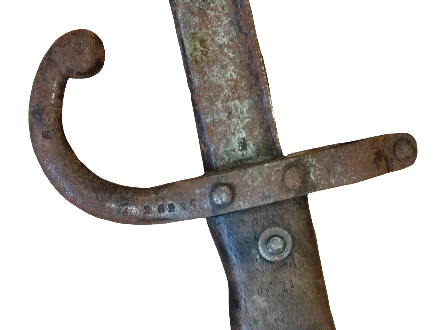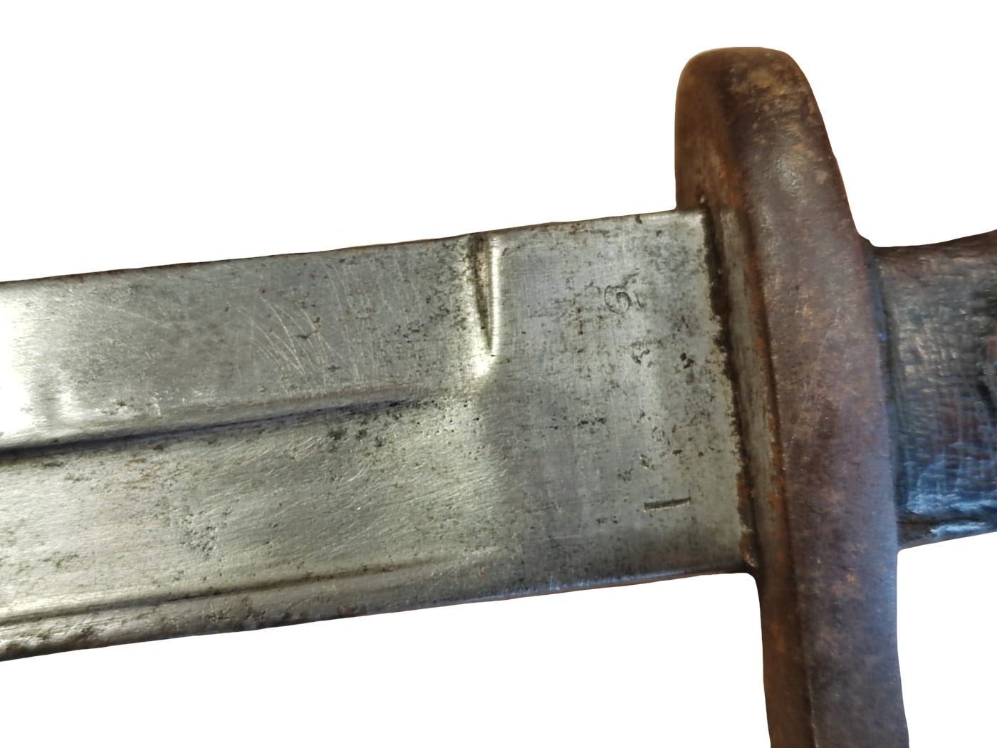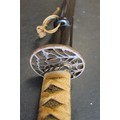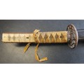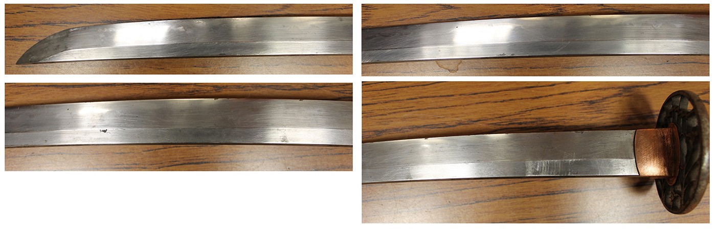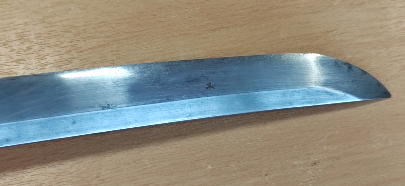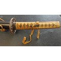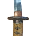 Edged weapon range with Japanese Katana with scabbard, some light pitting and discolouration to blade otherwise extremely fine, subtle Hamon line, loose tsuba, fuchi, seppa, ray skin grip with loose ito wrap, Kashira broken off but present, plus 1907 bayonet with scabbard, 1876 bayonet with leather scabbard, Gras bayonet and a Spanish Navaja, pitting to all blades, overall mixed condition plus Hitler Youth armband in near excellent condition. BUYER MUST COLLECT (B)