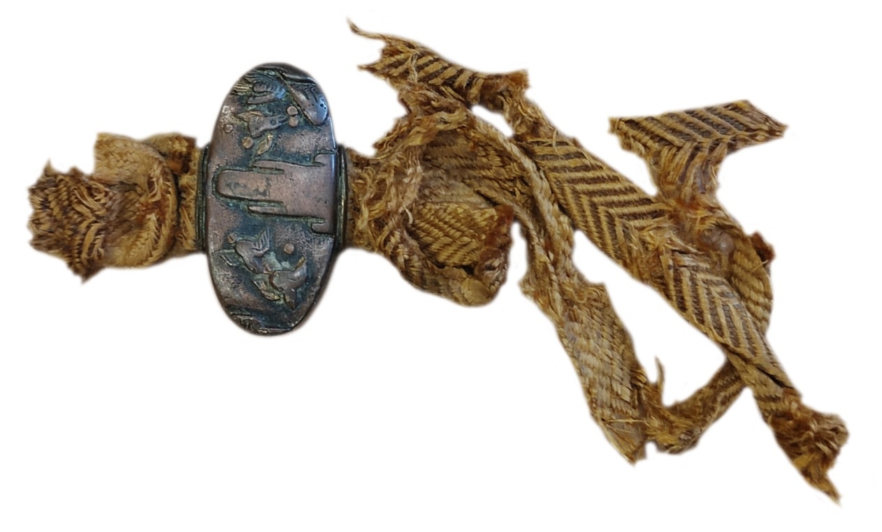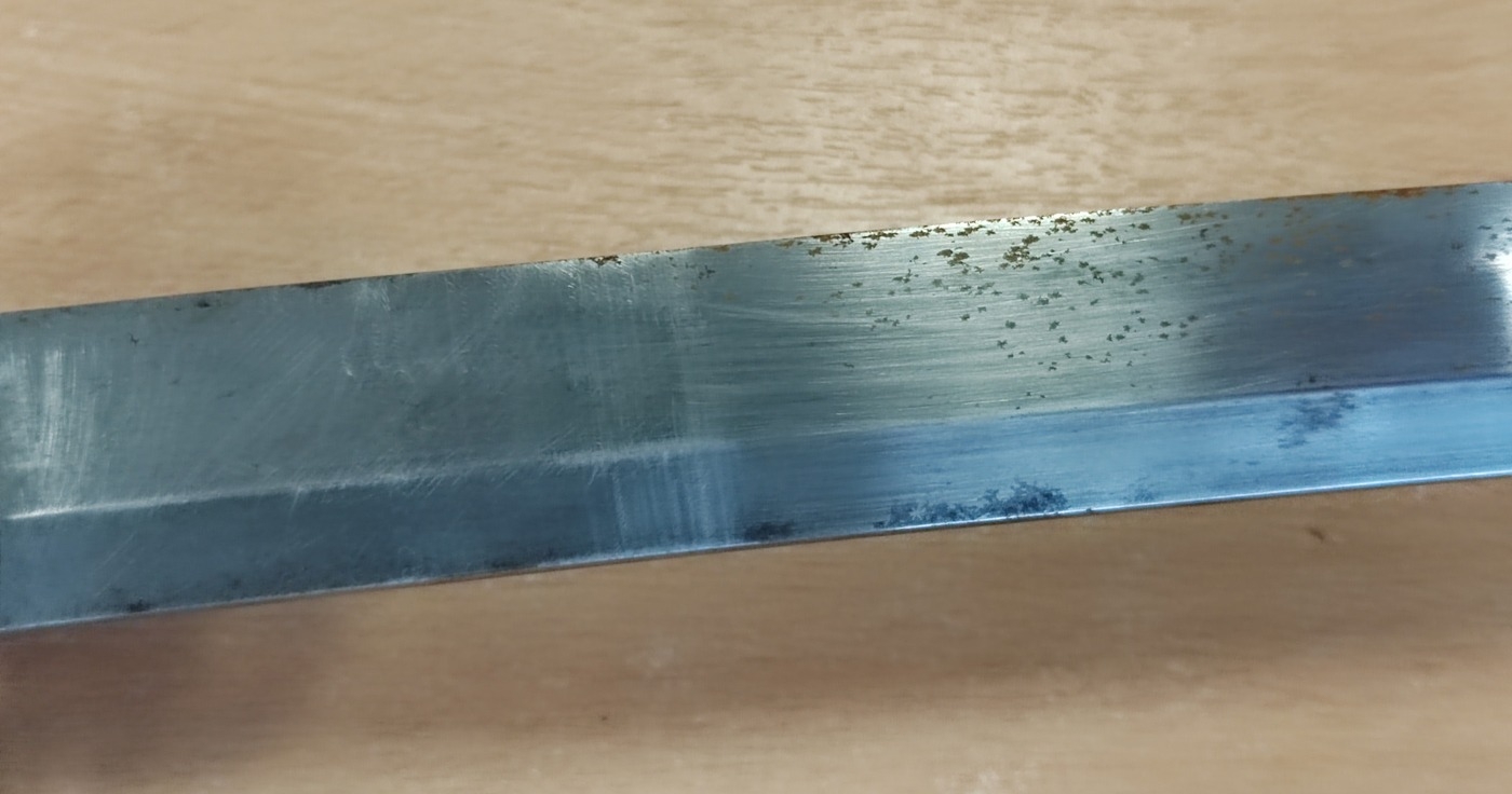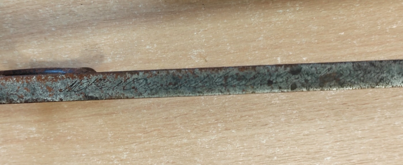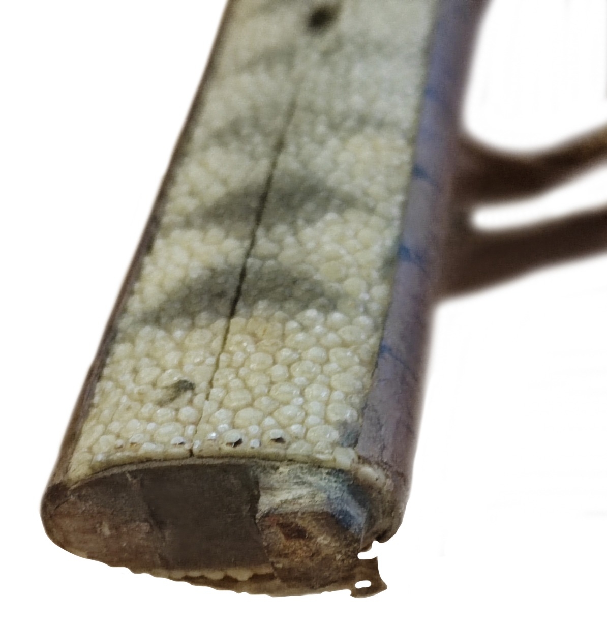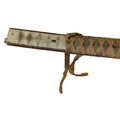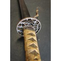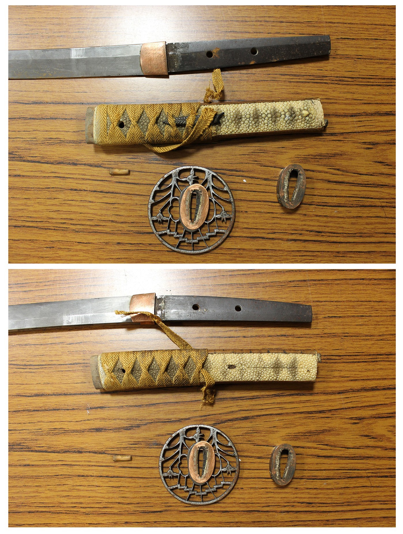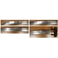 Edged weapon range with Japanese Katana with scabbard, some light pitting and discolouration to blade otherwise extremely fine, subtle Hamon line, loose tsuba, fuchi, seppa, ray skin grip with loose ito wrap, Kashira broken off but present, plus 1907 bayonet with scabbard, 1876 bayonet with leather scabbard, Gras bayonet and a Spanish Navaja, pitting to all blades, overall mixed condition plus Hitler Youth armband in near excellent condition. BUYER MUST COLLECT (B)