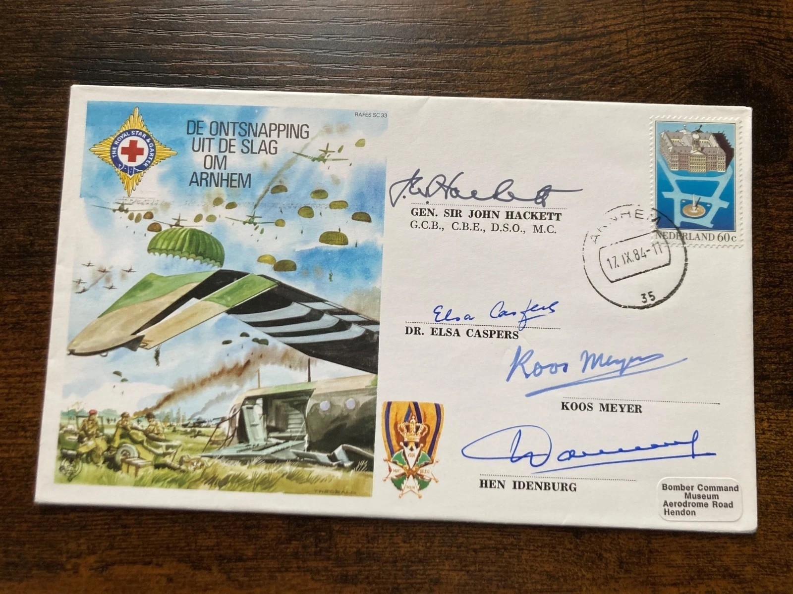 WW2 Gen Sir J Hackett DSO MC multiple signed Escape from Arnhem cover. RAF Escaping Society 'Escape from Arnhem' cover signed by British para veteran John Hackett who fought at Arnhem, plus THREE members of the Dutch resistance who helped wounded British soldiers or aided them in escaping, these are Hen Idenburg who hid Hackett in his home, Koos Meyer and Elsa Casper. . Single Vendor autograph collection. Good condition. All autographs come with a Certificate of Authenticity. We combine postage on multiple winning lots and can ship worldwide. UK postage from £5.99, EU from £7.99, Rest of World from £9.99