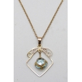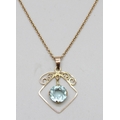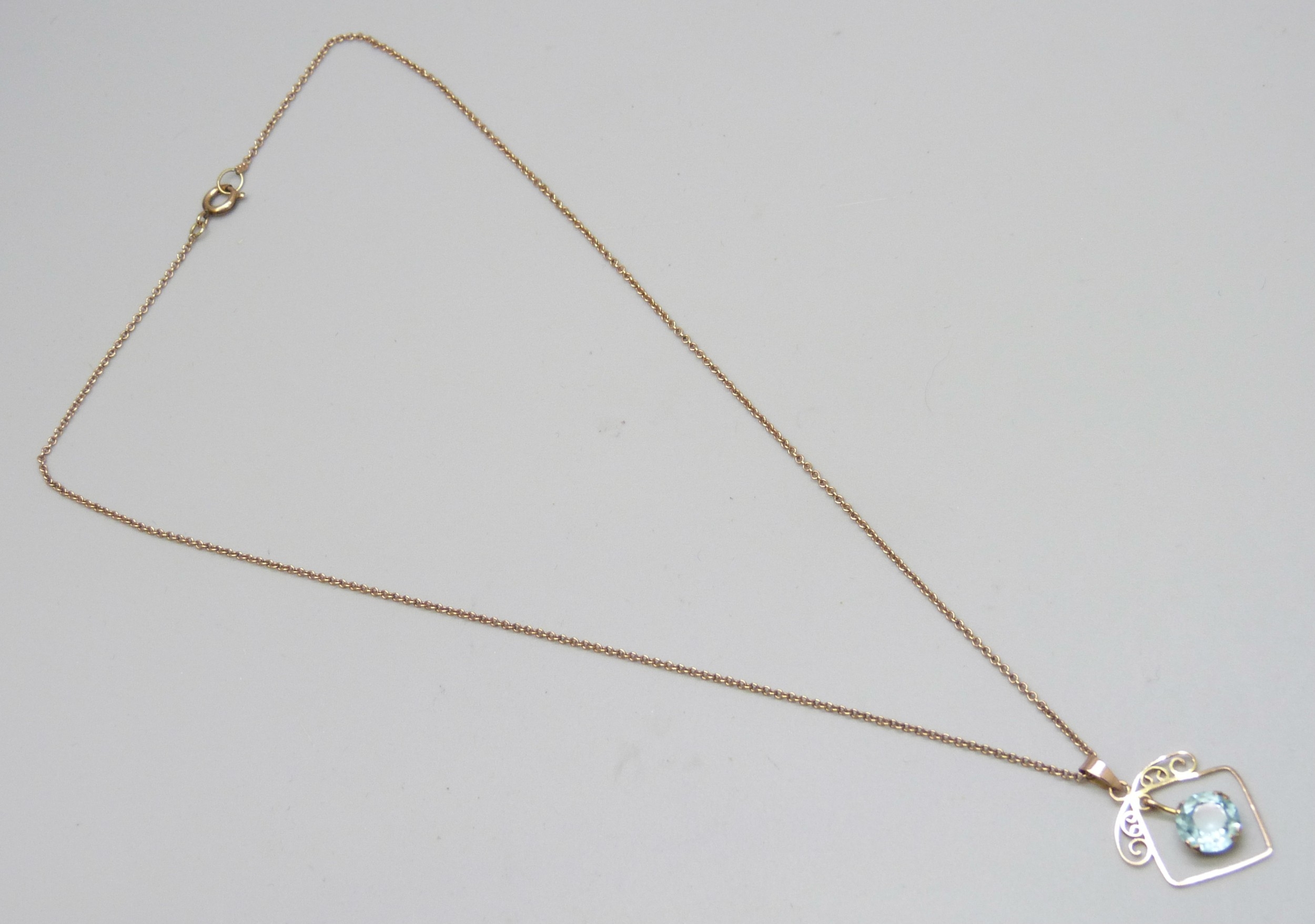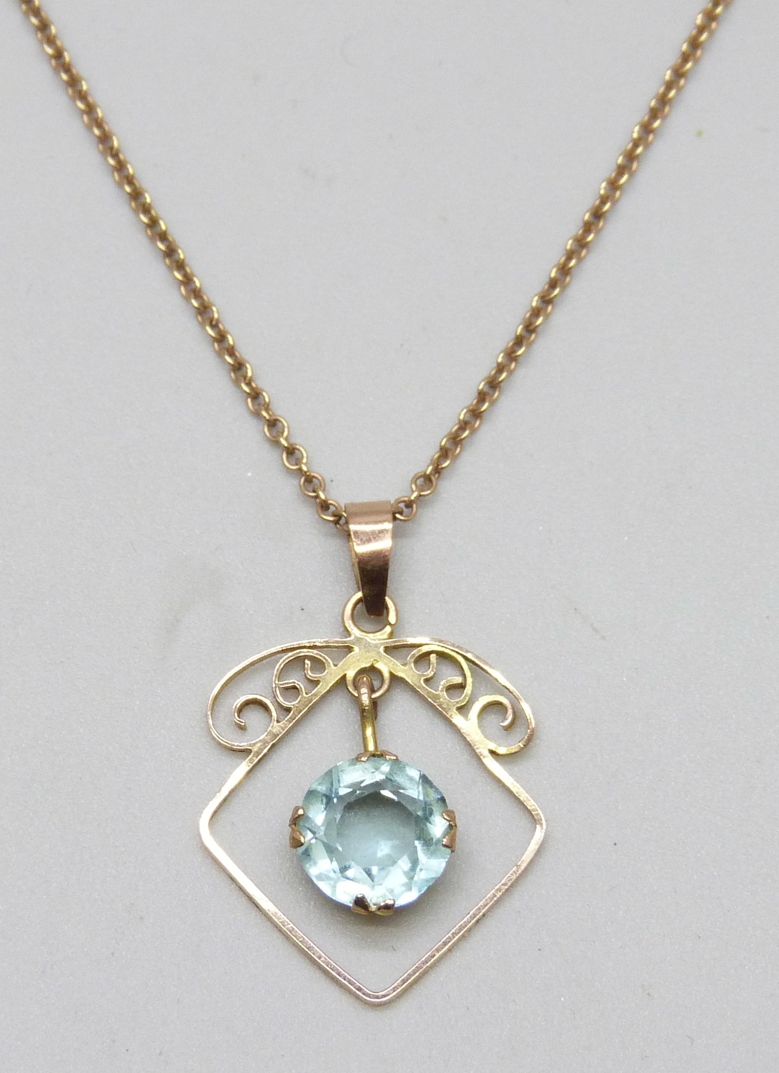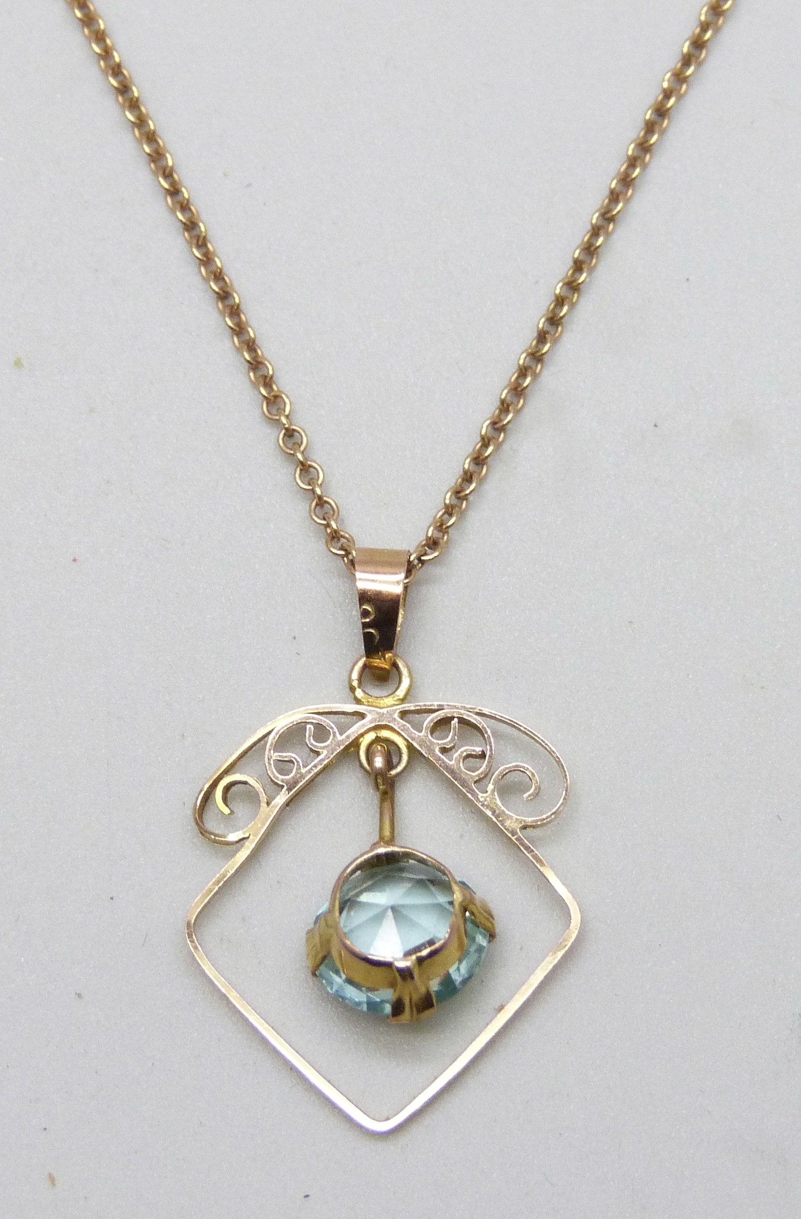 An early 20th Century yellow metal blue paste stone set pendant, 2.4cm, on a 9ct gold chain, 2.5g total
