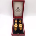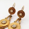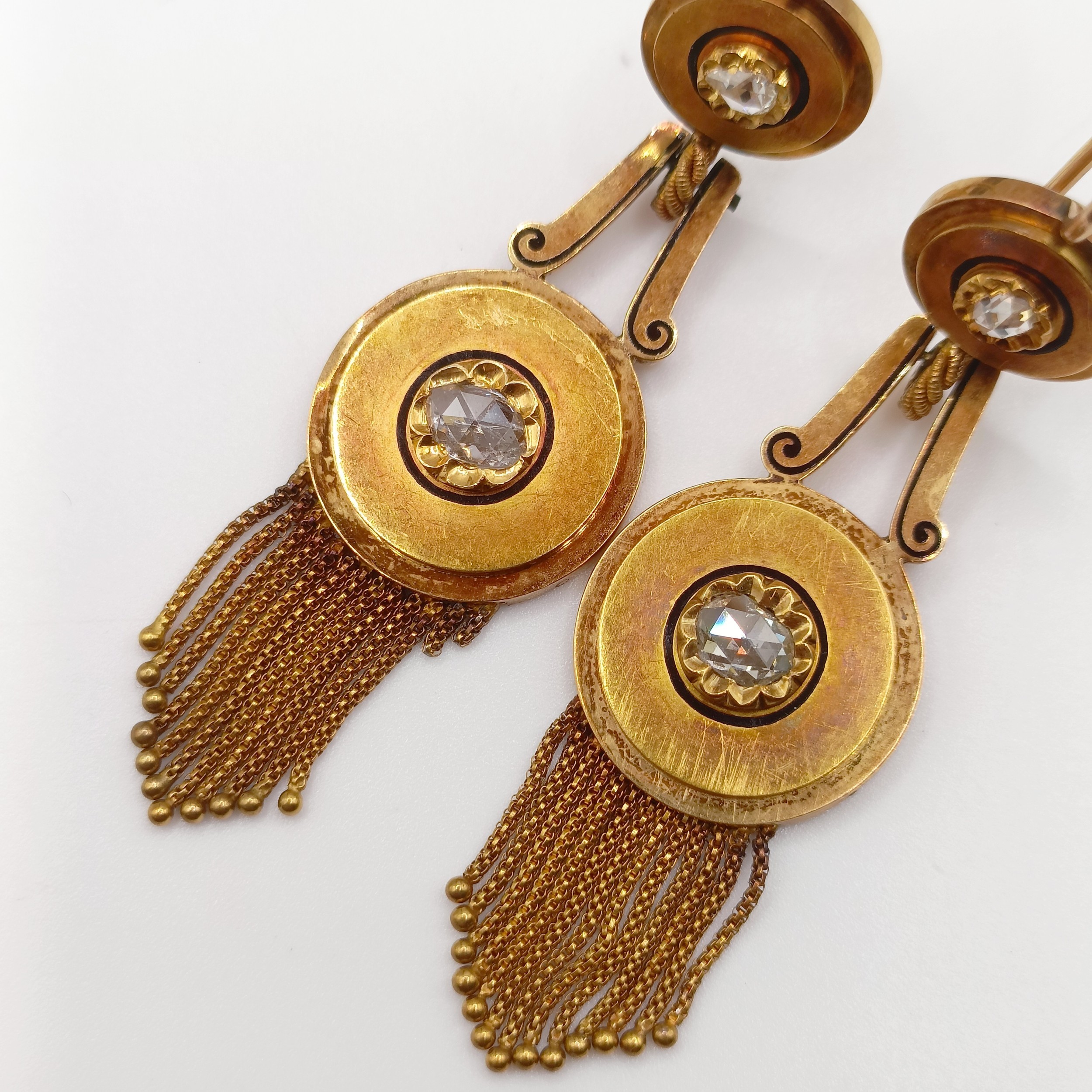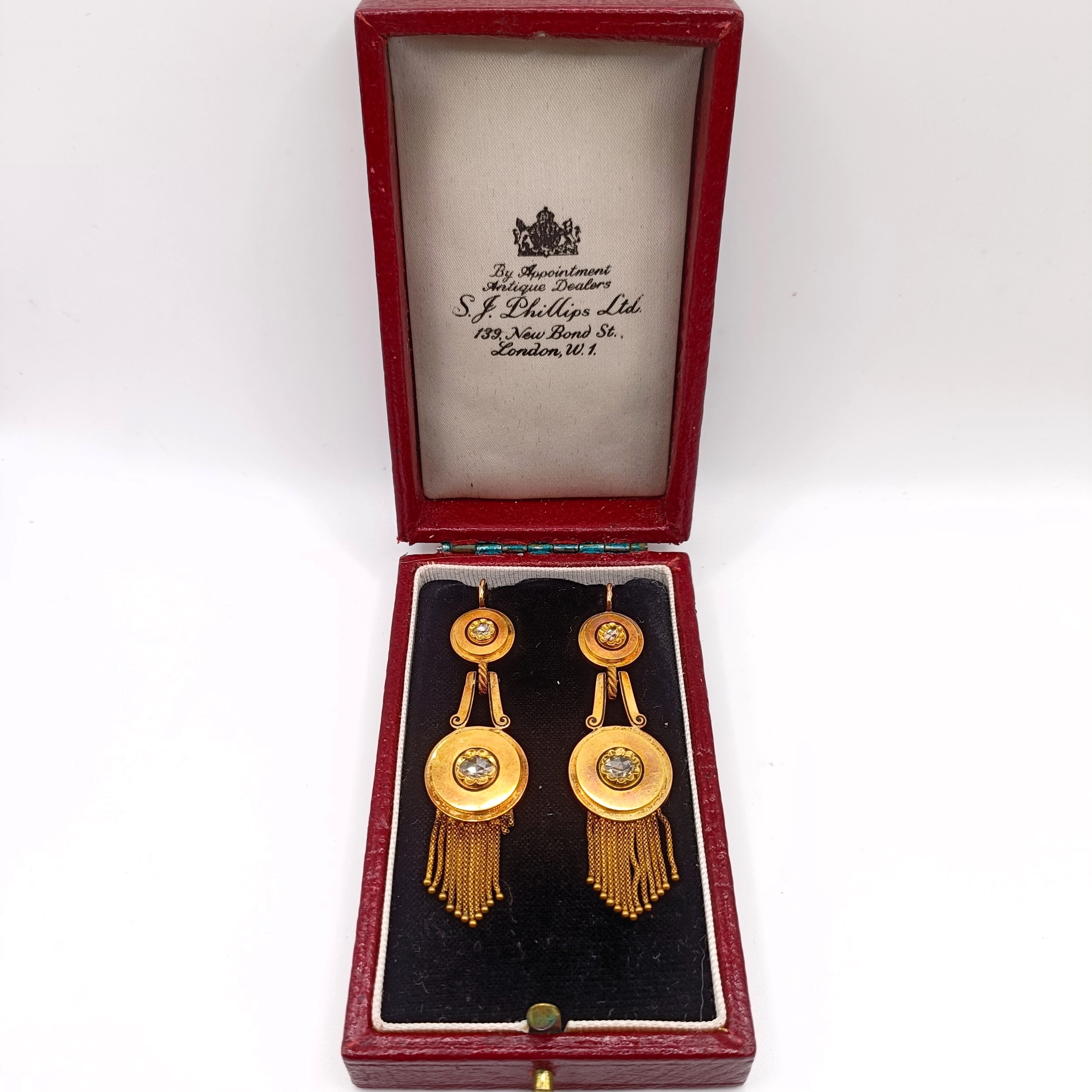 A pair of Victorian yellow coloured metal Etruscan style pendant earrings, set diamonds and terminating with tassels, each approx. 6 cm high, in an S J Phillips Ltd, 139 New Bold Street, London, W1 fitted box