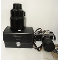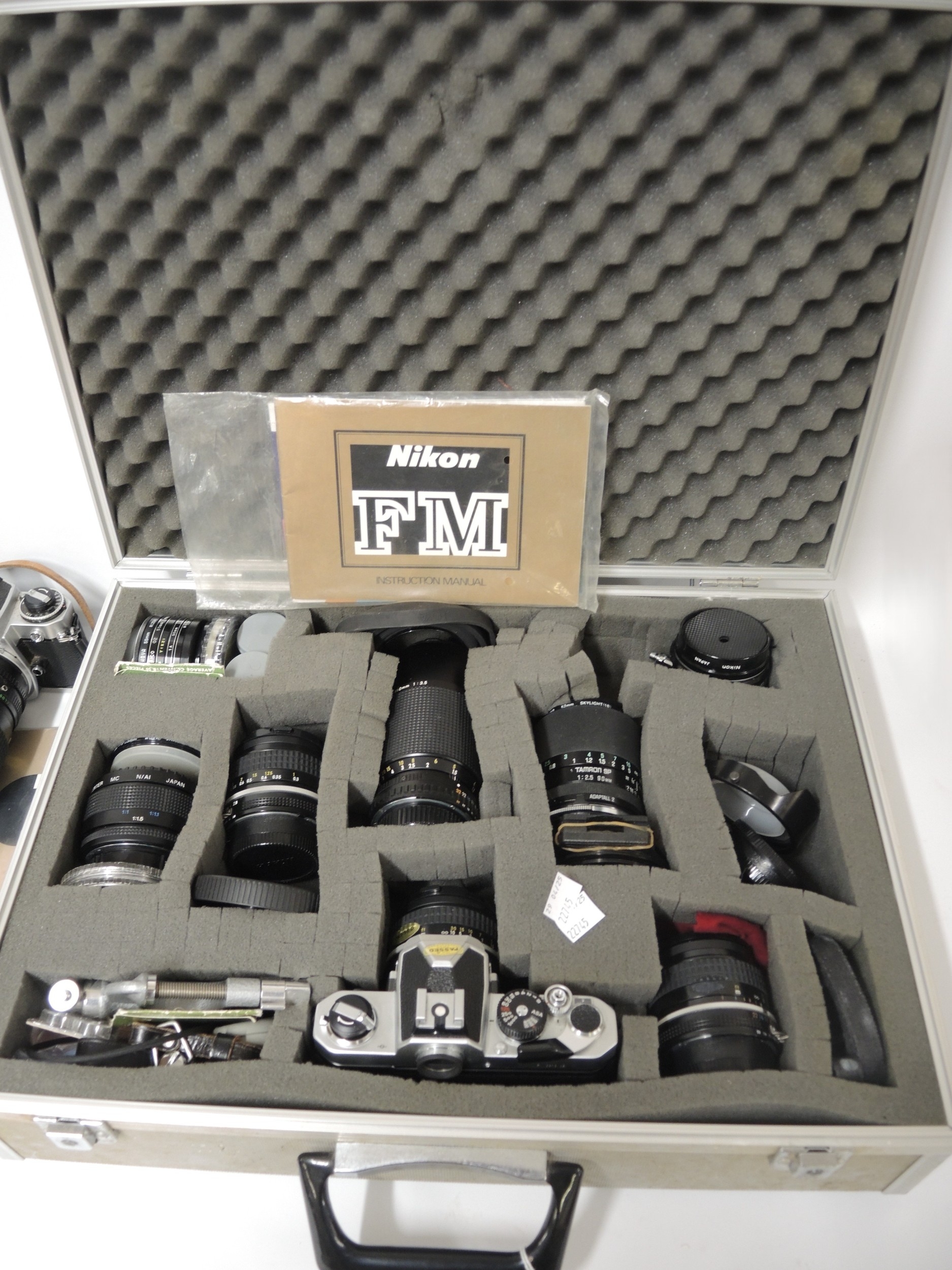 Nikon camera outfit including FM and FE bodies, with various Nikon and other lenses