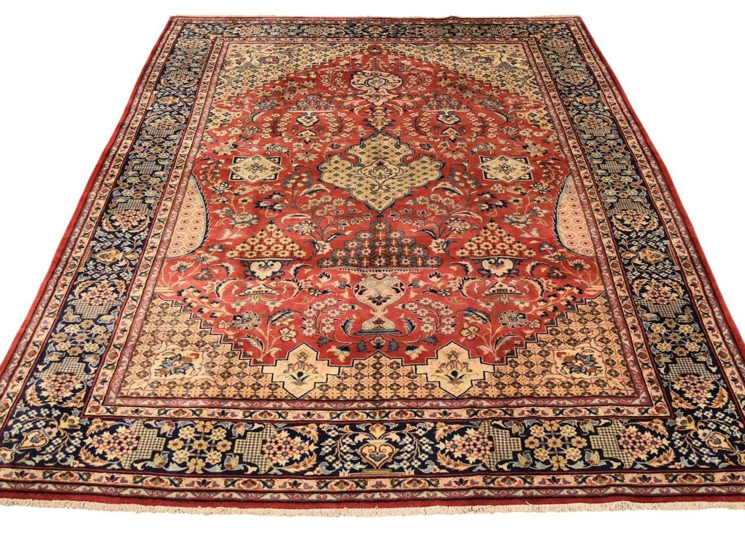 A Najafabad carpet, Central Persia With flower vases and medallions on a light red ground, beige floral spandrels and a dark blue border between guard stripes. 410cm x 300cm