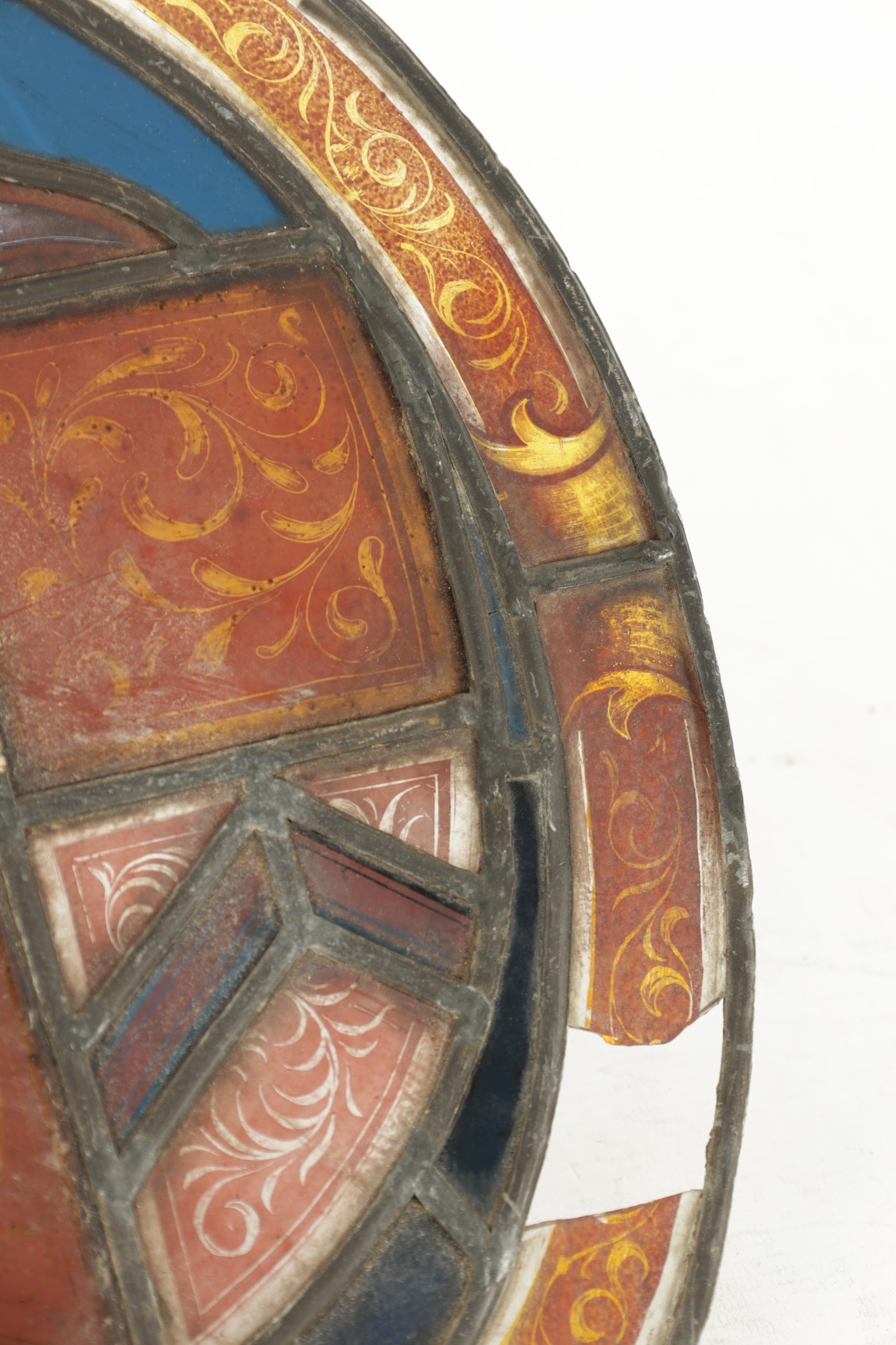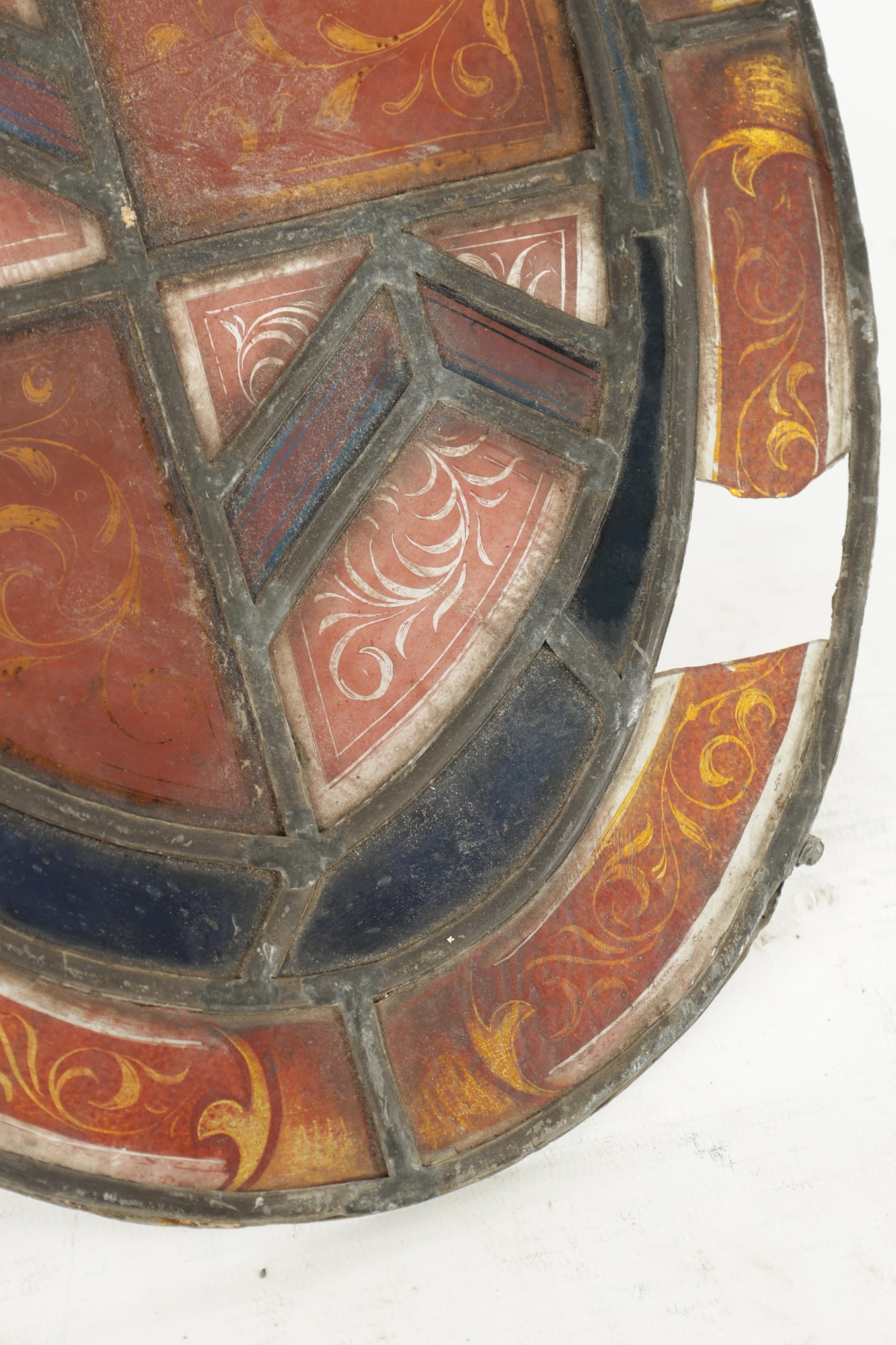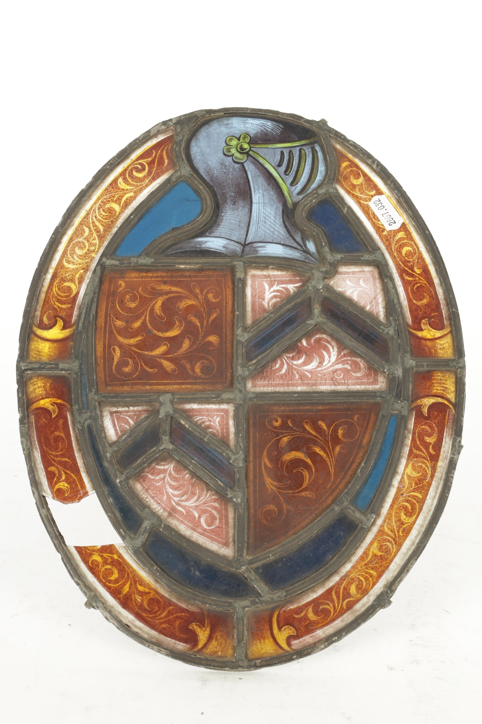 AN 18TH CENTURY ARMOURIAL STAINED GLASS WINDOW of oval form, having a blue, orange and purple stained glass with a scrolled pattern. (36cm by 27cm)