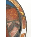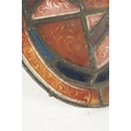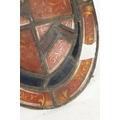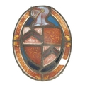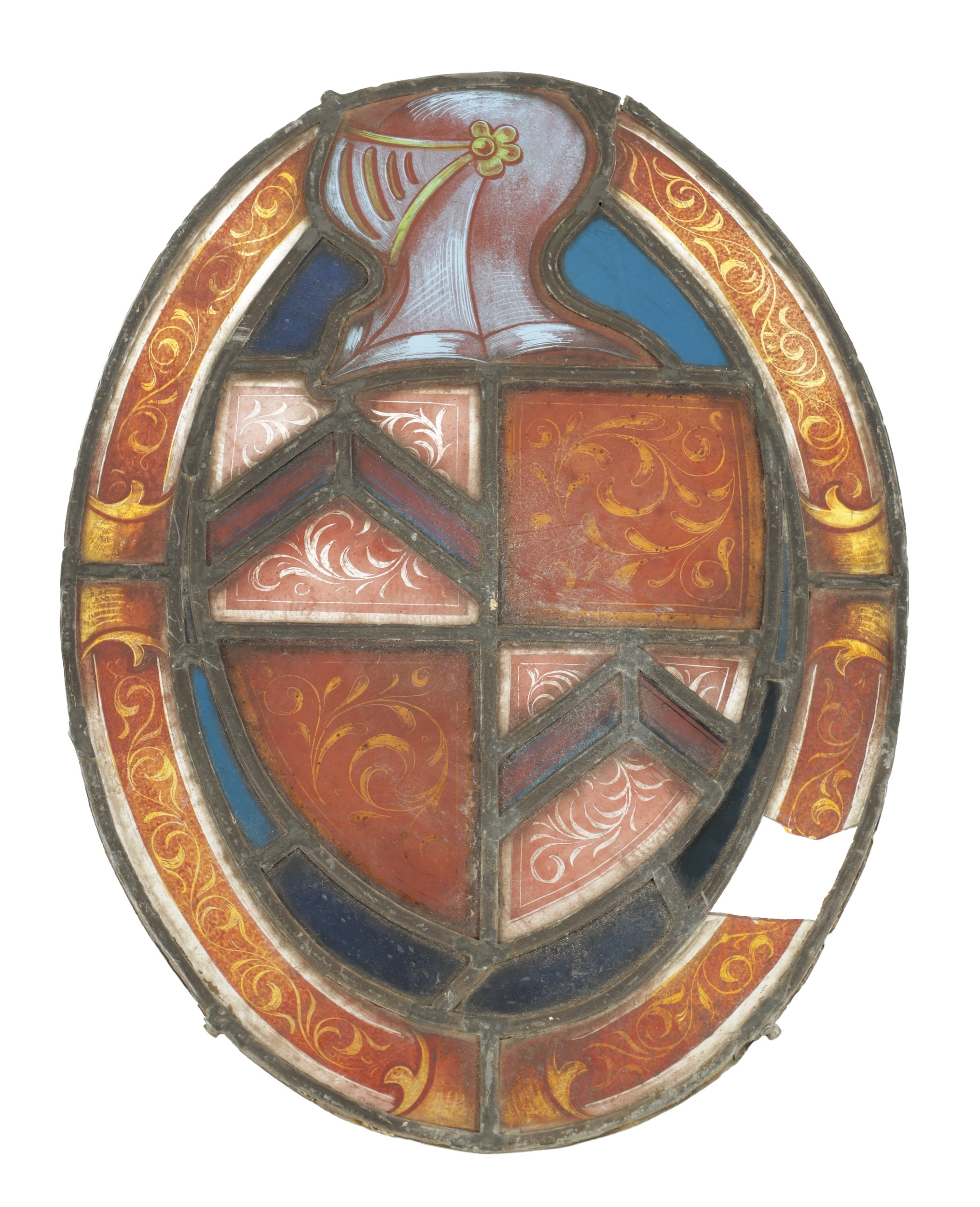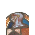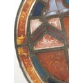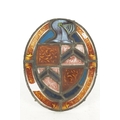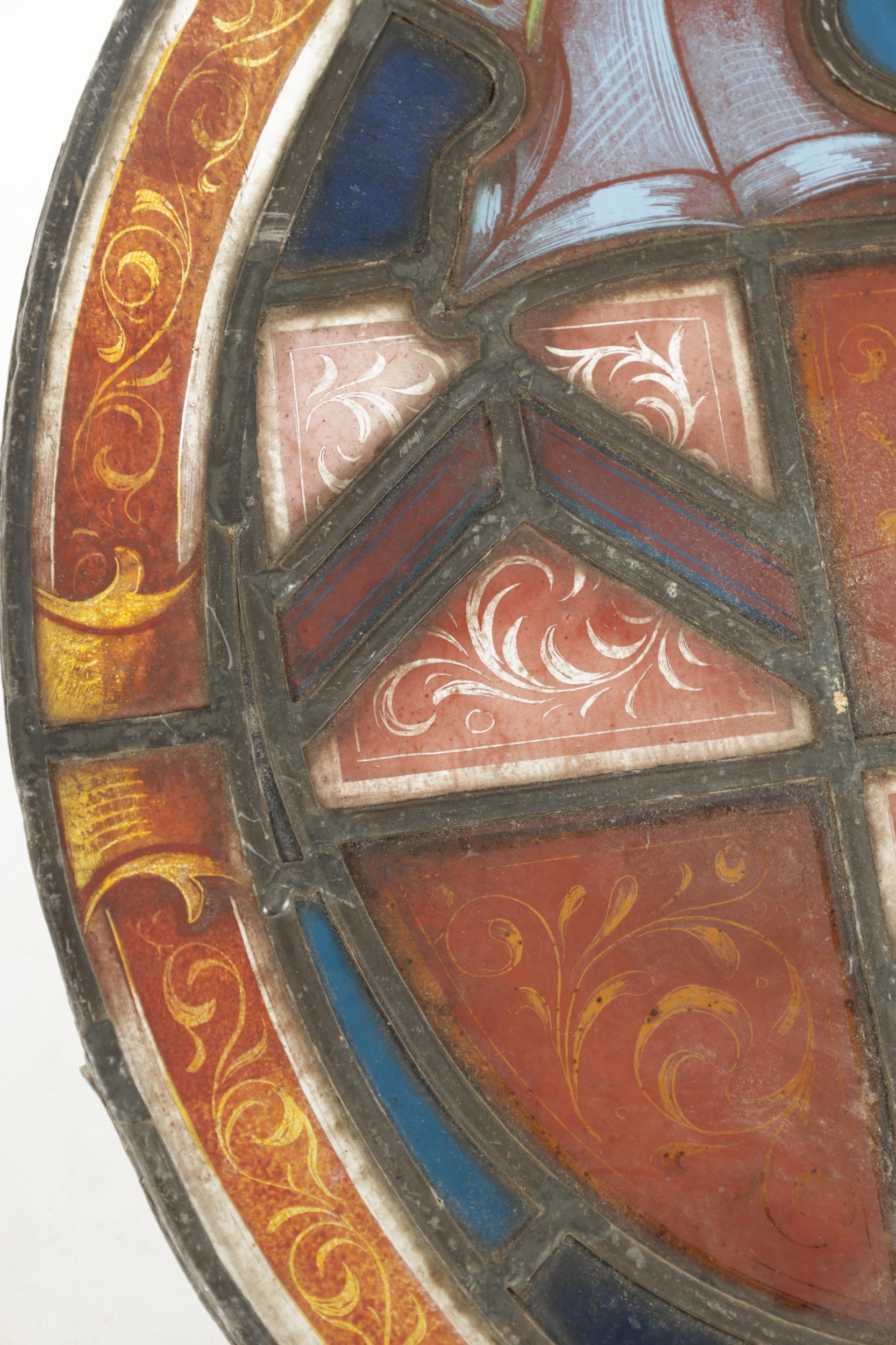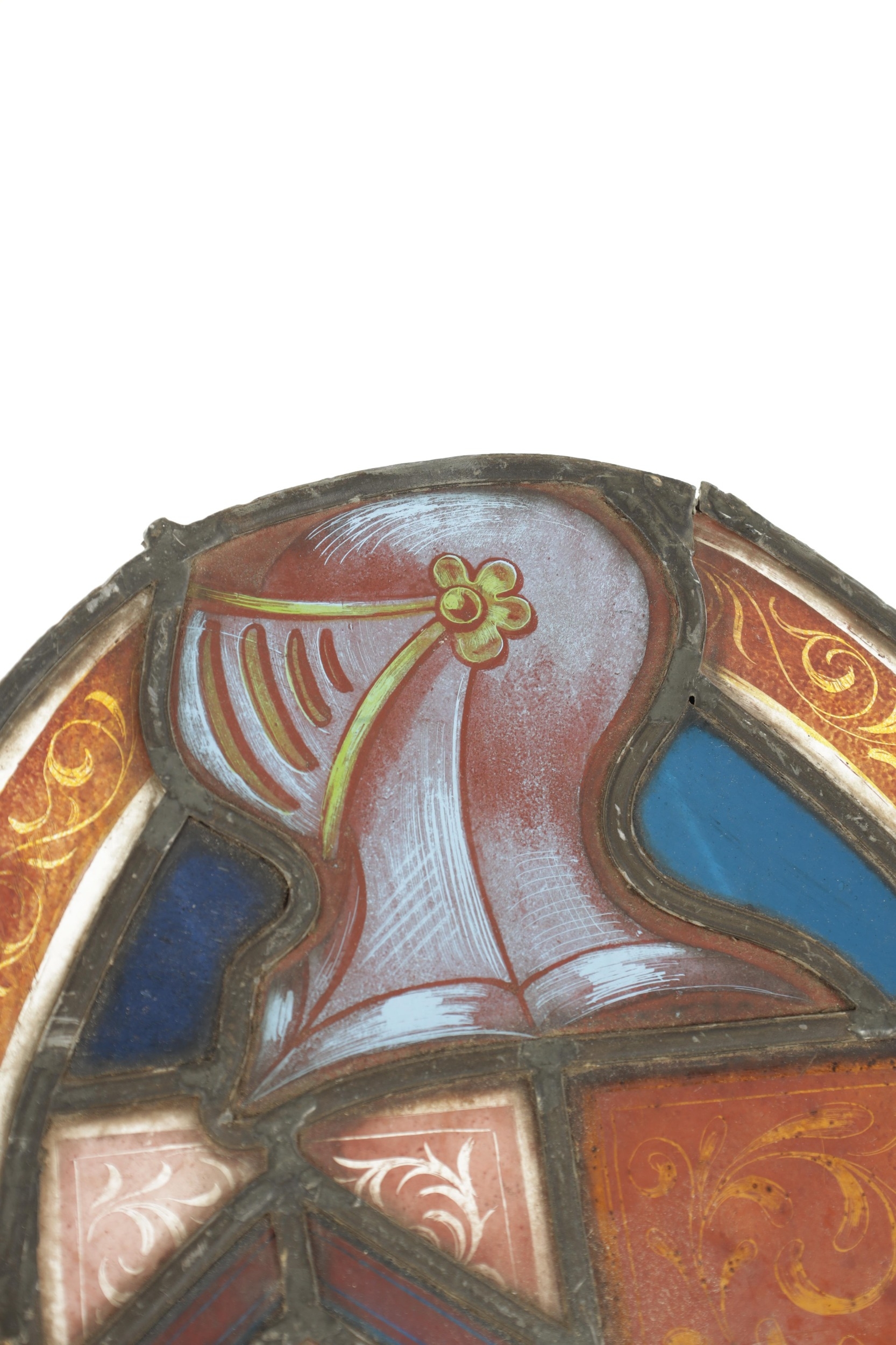 AN 18TH CENTURY ARMOURIAL STAINED GLASS WINDOW of oval form, having a blue, orange and purple stained glass with a scrolled pattern. (36cm by 27cm)