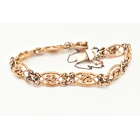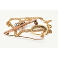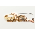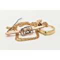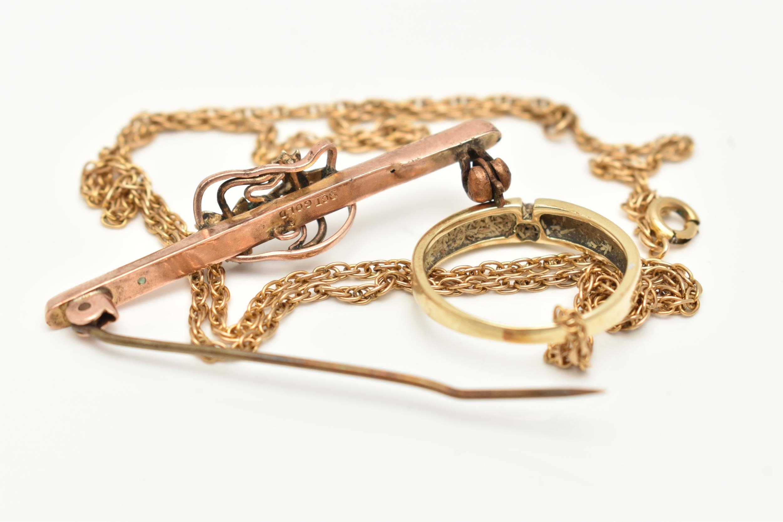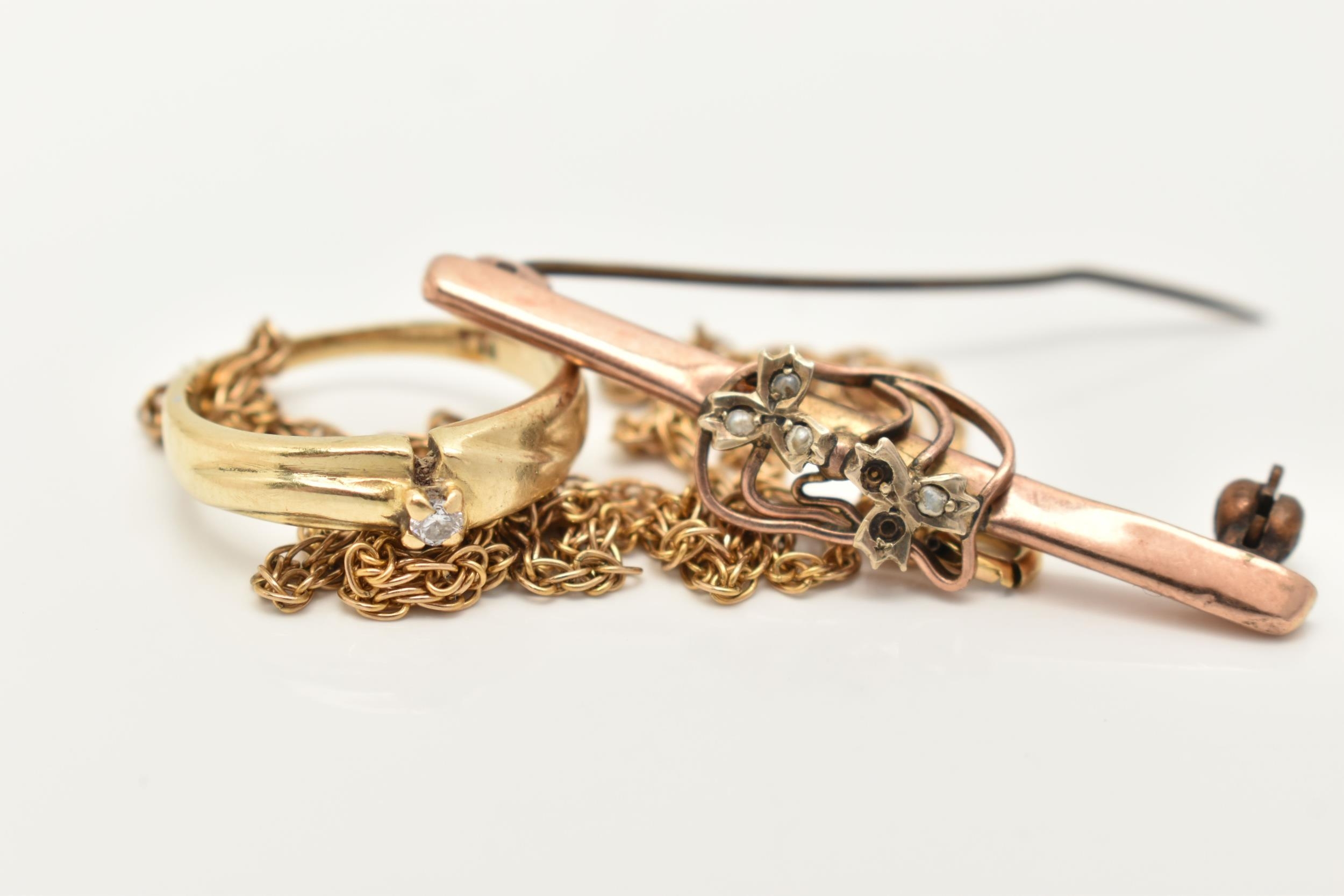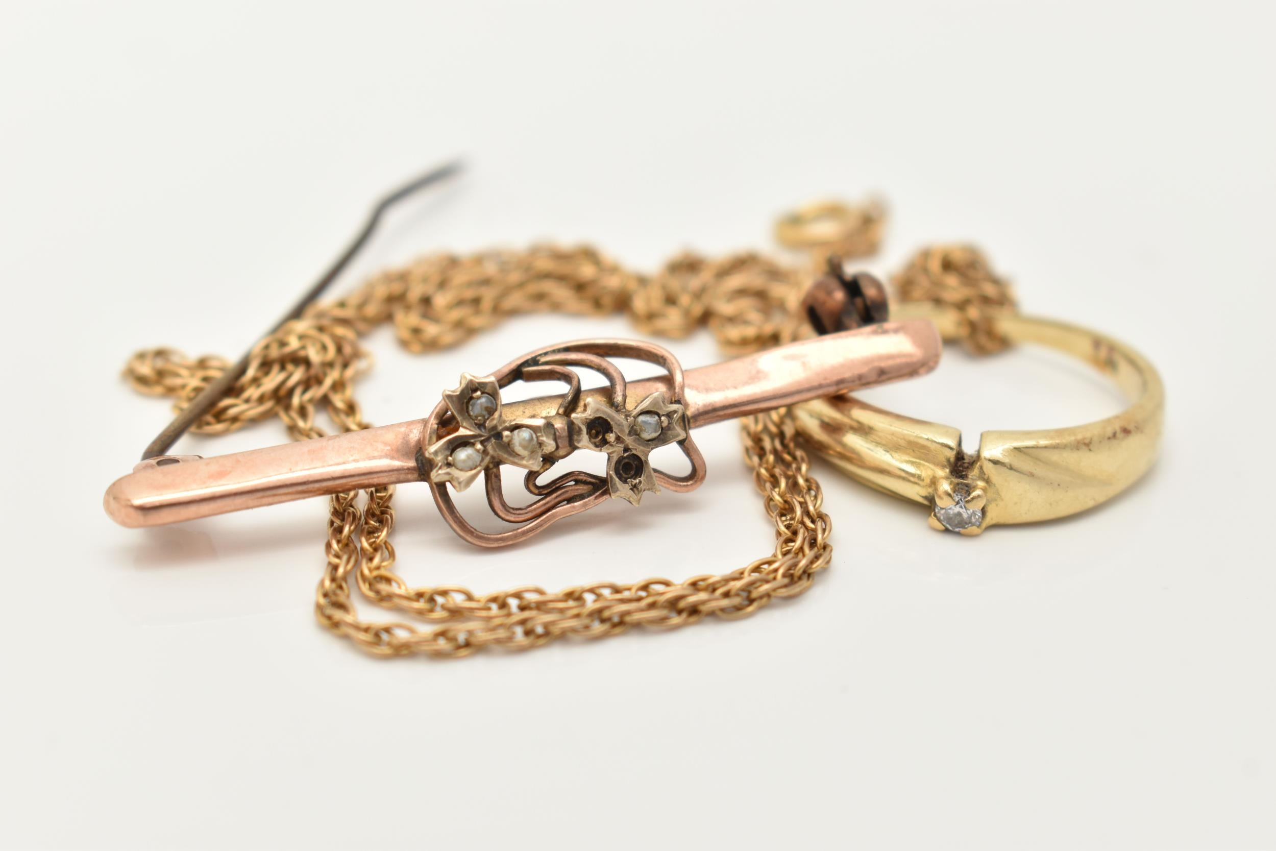 A SMALL ASSORTMENT OF JEWELLERY, to include an AF yellow metal rope twist chain (broken clasp requires attention), approximate gross weight 3.2 grams, an AF rose metal bar brooch displaying a floral pattern with split pearl accents, stamped 9ct gold, fitted with a brooch pin and C clasp, approximate gross weight 2.2 grams, together with a yellow metal diamond set ring, stamped 585, ring size L, approximate gross weight 2.8 grams (condition report: chain has a broken clasp requires attention, brooch is bent and damaged)
