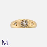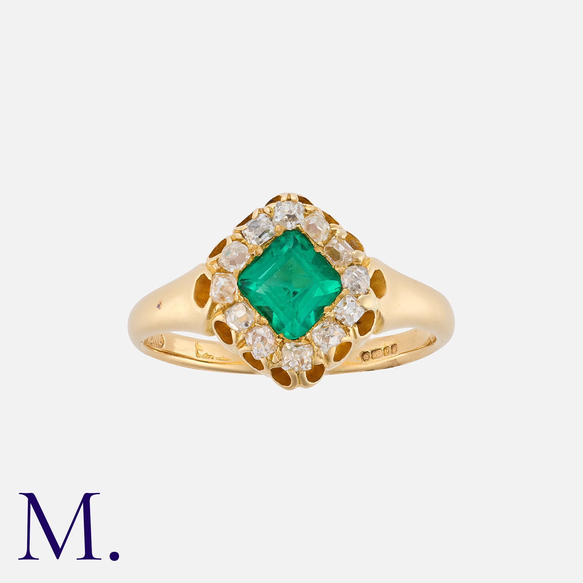 An Emerald And Diamond Cluster Ring in 18k yellow gold, set centrally with a square shaped emerald of approximately 1.05ct, within a border of old cut diamonds totalling approximately 0.25ct. Hallmarked for 18ct, London, 1869.