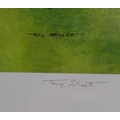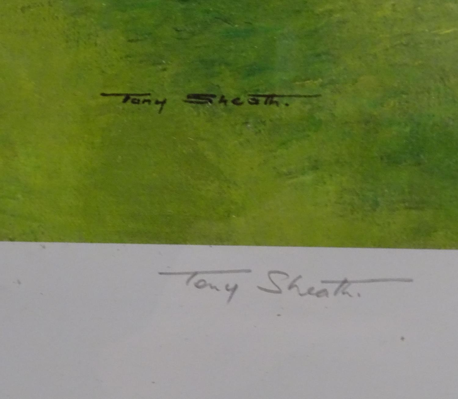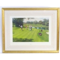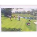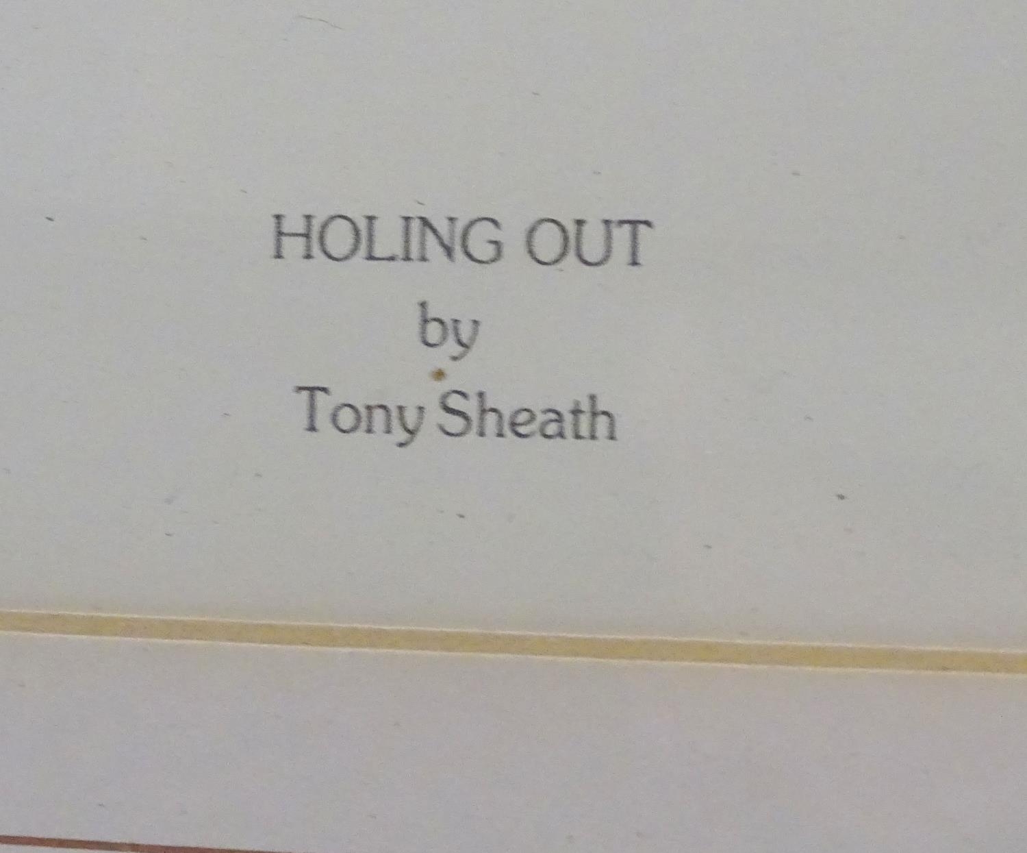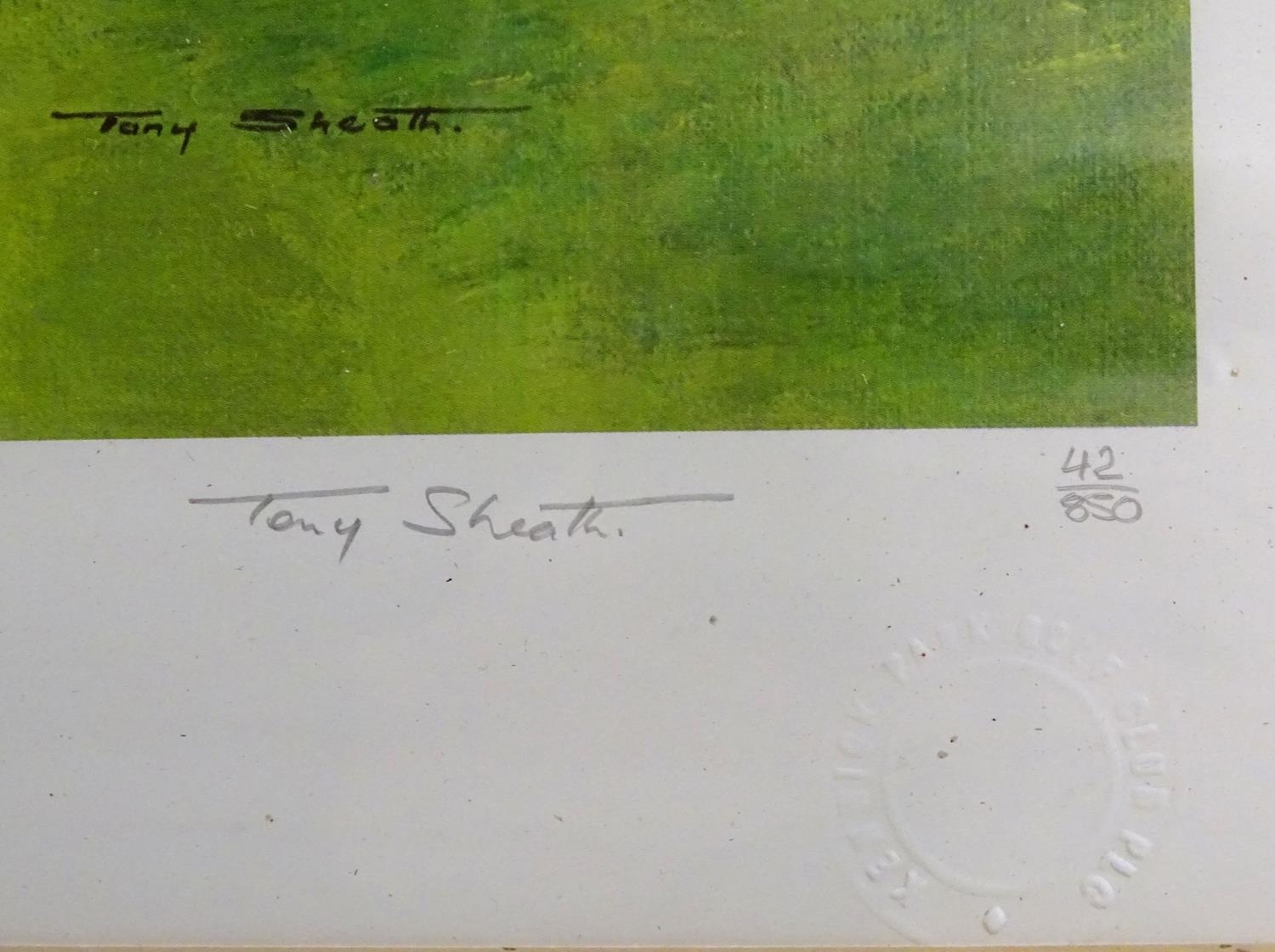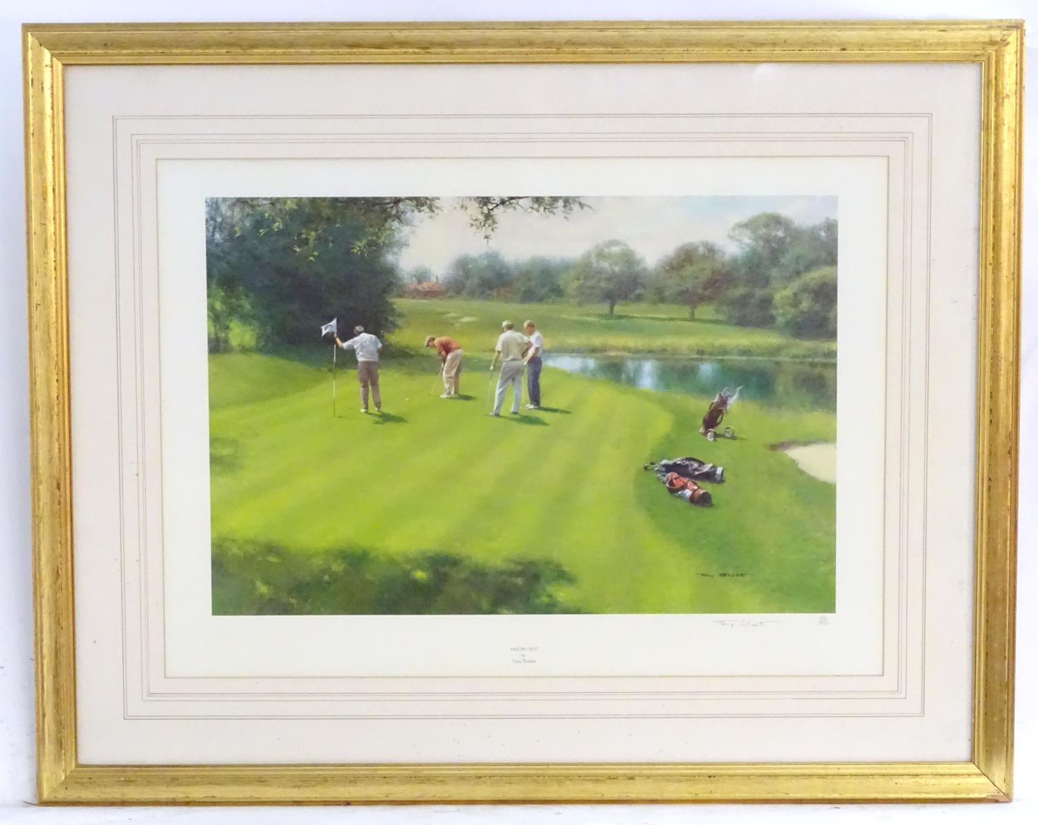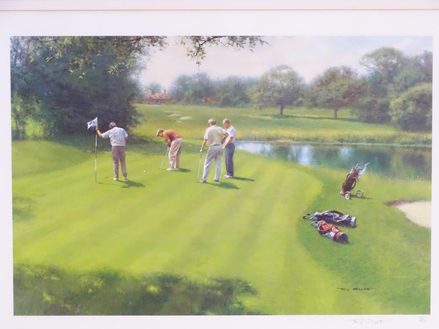After Tony Sheath (b. 1946), Limited edition lithographic print, no. 42/850, Holding Out, A golf course scene with golfers on the green. Facsimile signature within, titled under, signed and numbered in pencil lower right and stamped by the Fine Art Trade Guild lower left. Approx. 13 1/4" x 20"