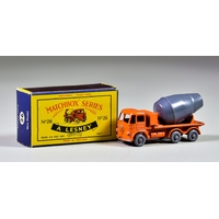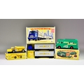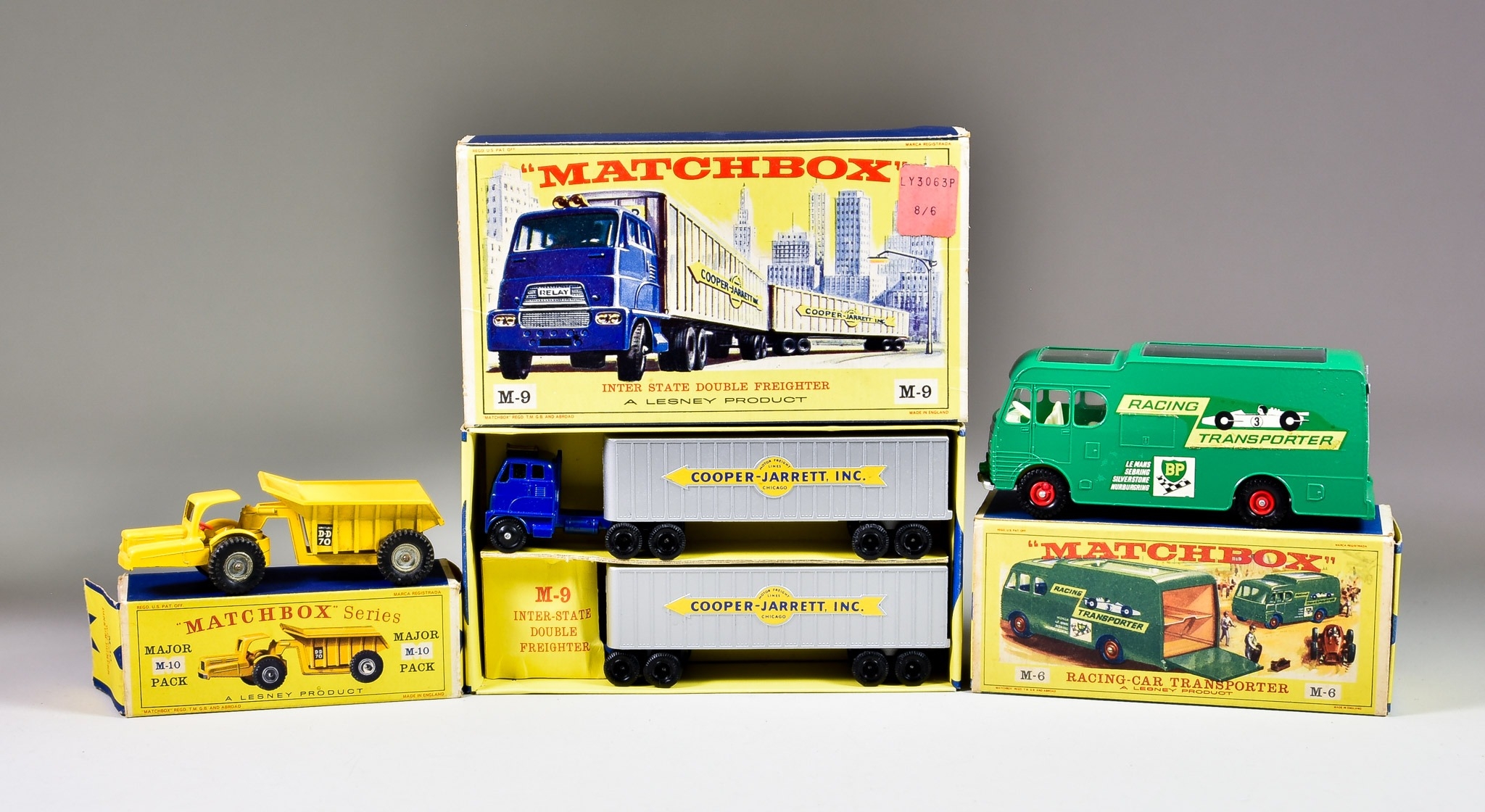 Three Lesney Matchbox Major Series Diecast Model Cars, comprising - No. M-6/ M6-B "Racing Car Transporter", green body, red hubs, cream interior, a No. M-9/ M9 "Hendrick Tractor Unit with Cooper Jarrett Interstate Double Freighter Trailers", blue hubs, plastic wheels, metallic trailers and chassis, and No. M-10/ M10 "Whitlock Dinkum-Dunker", yellow body, bare metal hubs, yellow body trailer, in E1 and D1 type boxes
