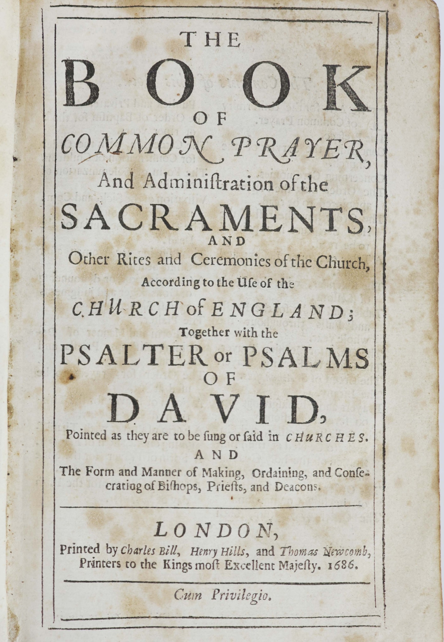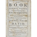 17th CENTURY BOOK OF COMMON PRAYER WITH CONTEMPORARY ANNOTATIONS. The Book of Common Prayer. London: Printed by Charles Bill, Henry Hills, and Thomas Newcomb, Printers to the King most Excellent Majesty, 1686. Bound in brown morocco with raised bands and border tooling. Gilt edges, mostly faded. Marbled endpapers. Front cover loose, rear cover and several rear leaves detatched.