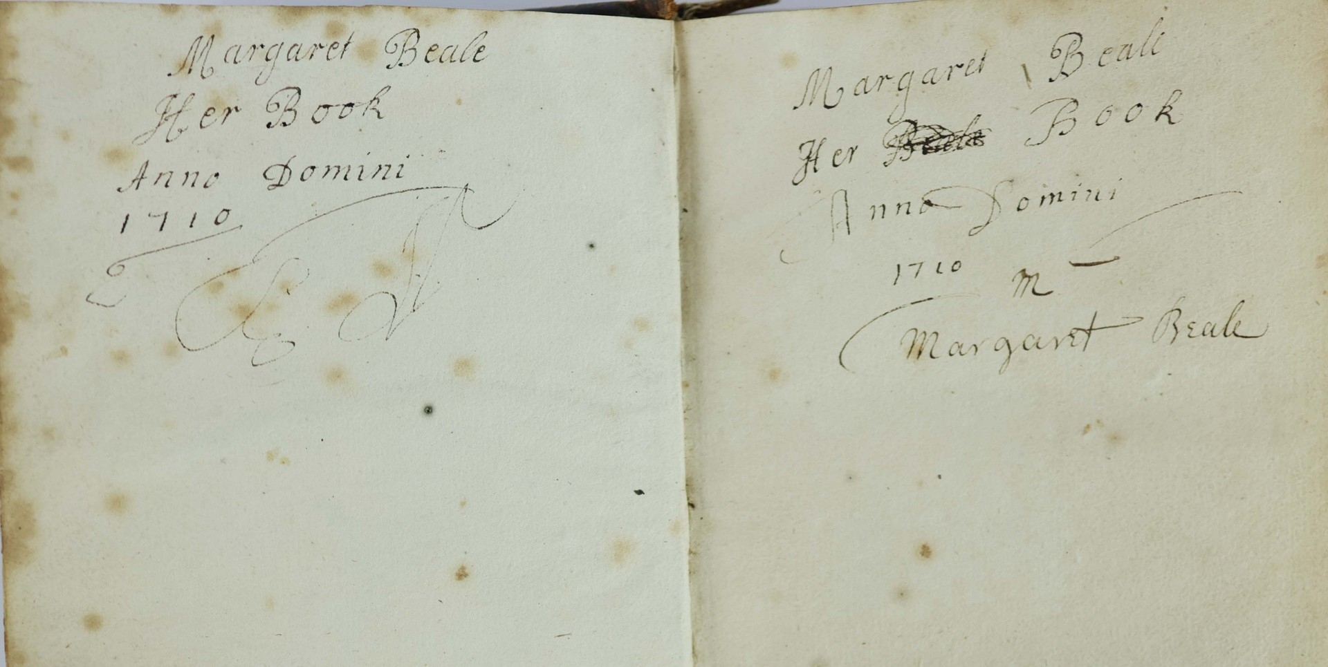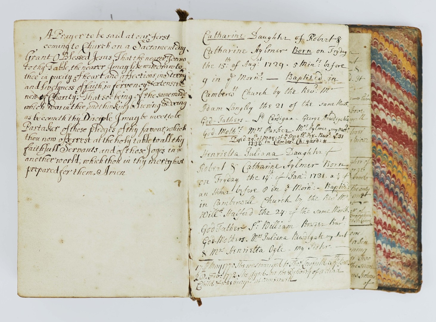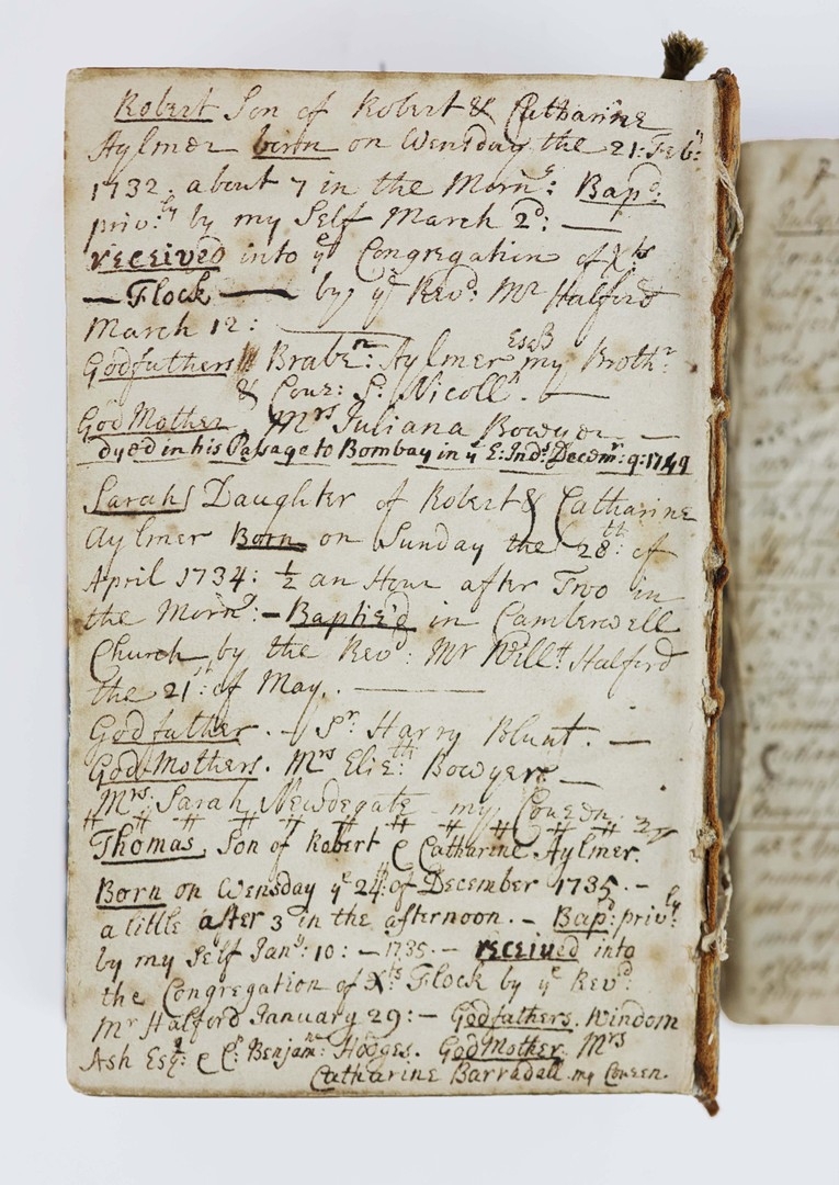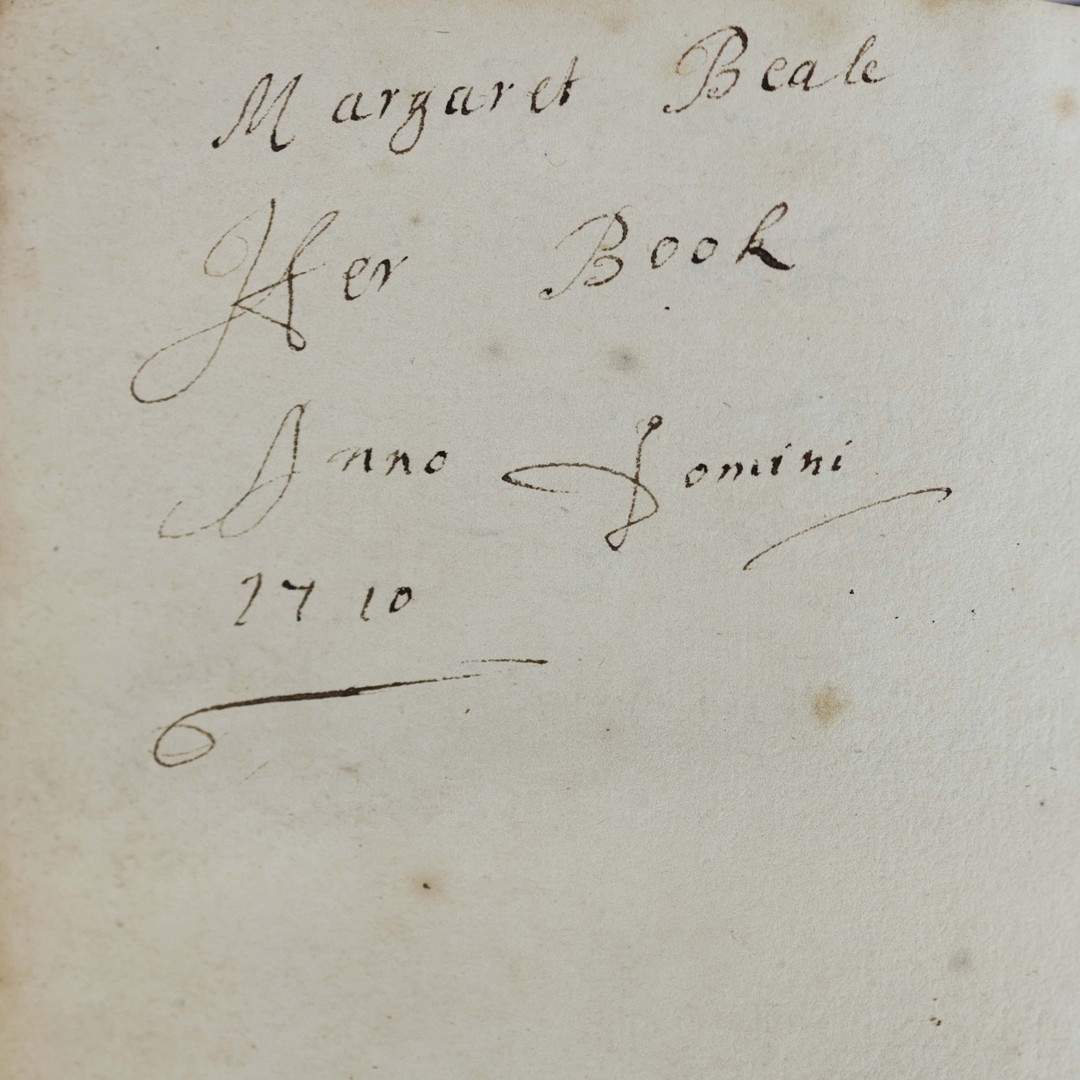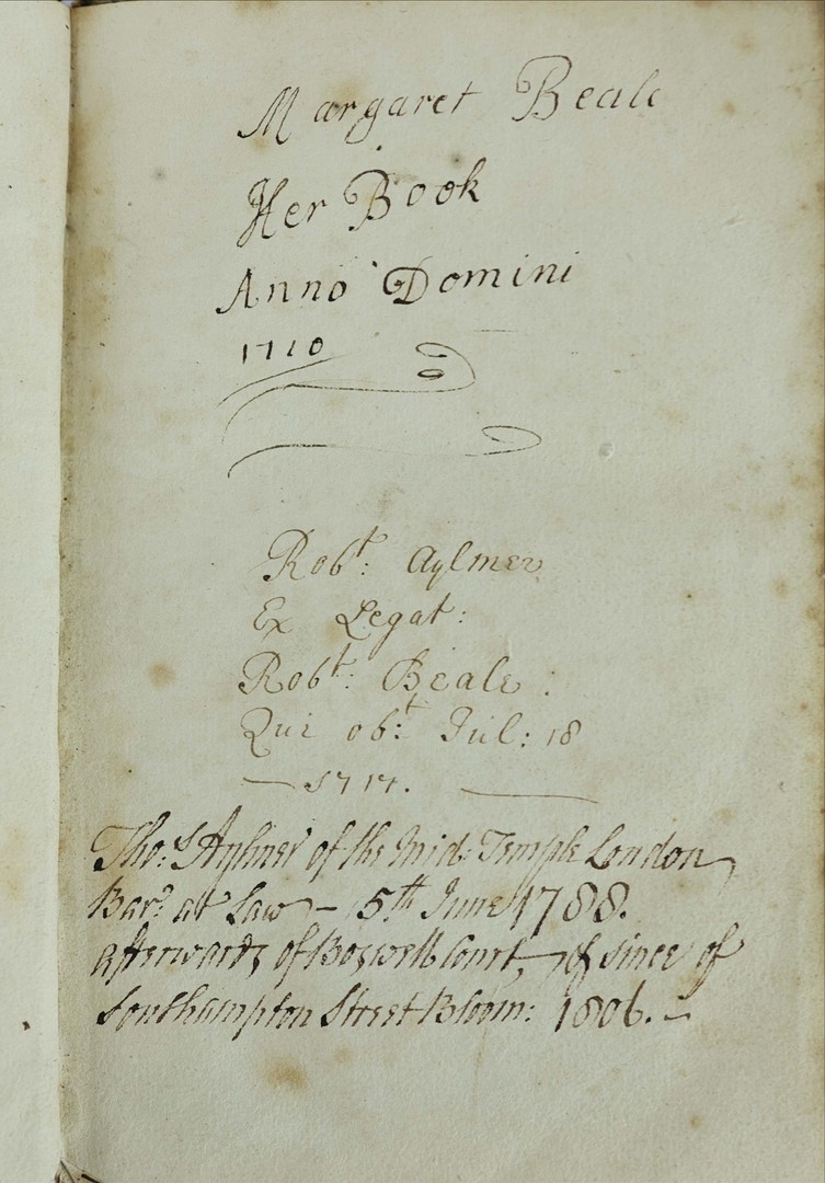 A typical example of a late 17th century book of common prayer. What makes this copy unique is the large number of annotations made to the front flyleaves and rear blanks in a neat, contemporary hand. It traces a family genealogy from the first owner, Margaret Beale in 1710 through her descendents, Robert Aylmer and wife Catherine, to the last entry dated 1878. A lovely example of a religious text being passed through generations of family.