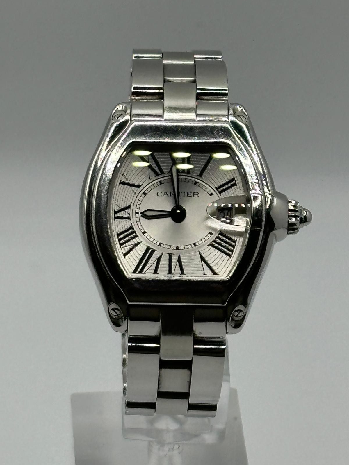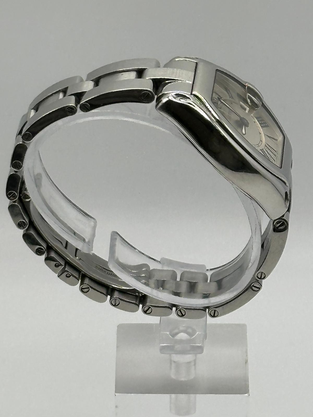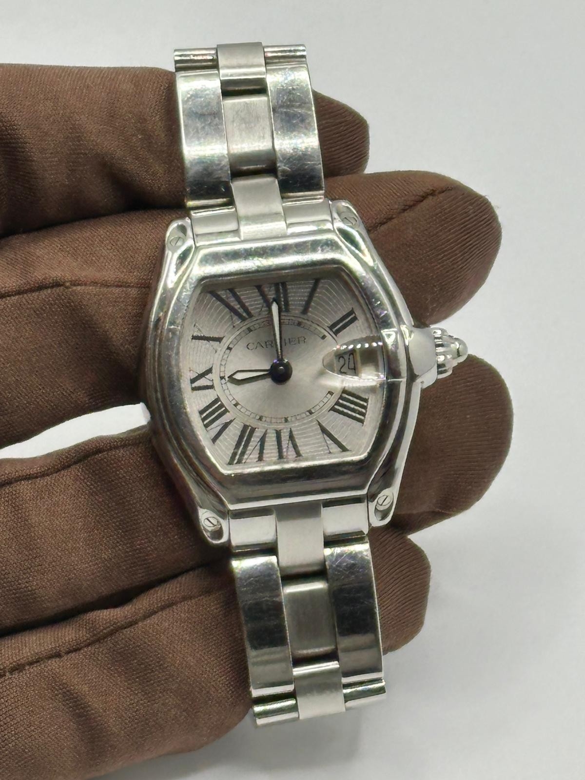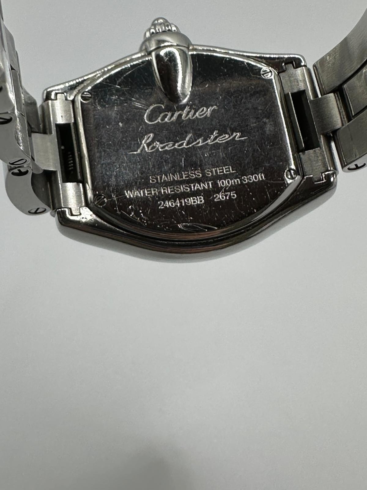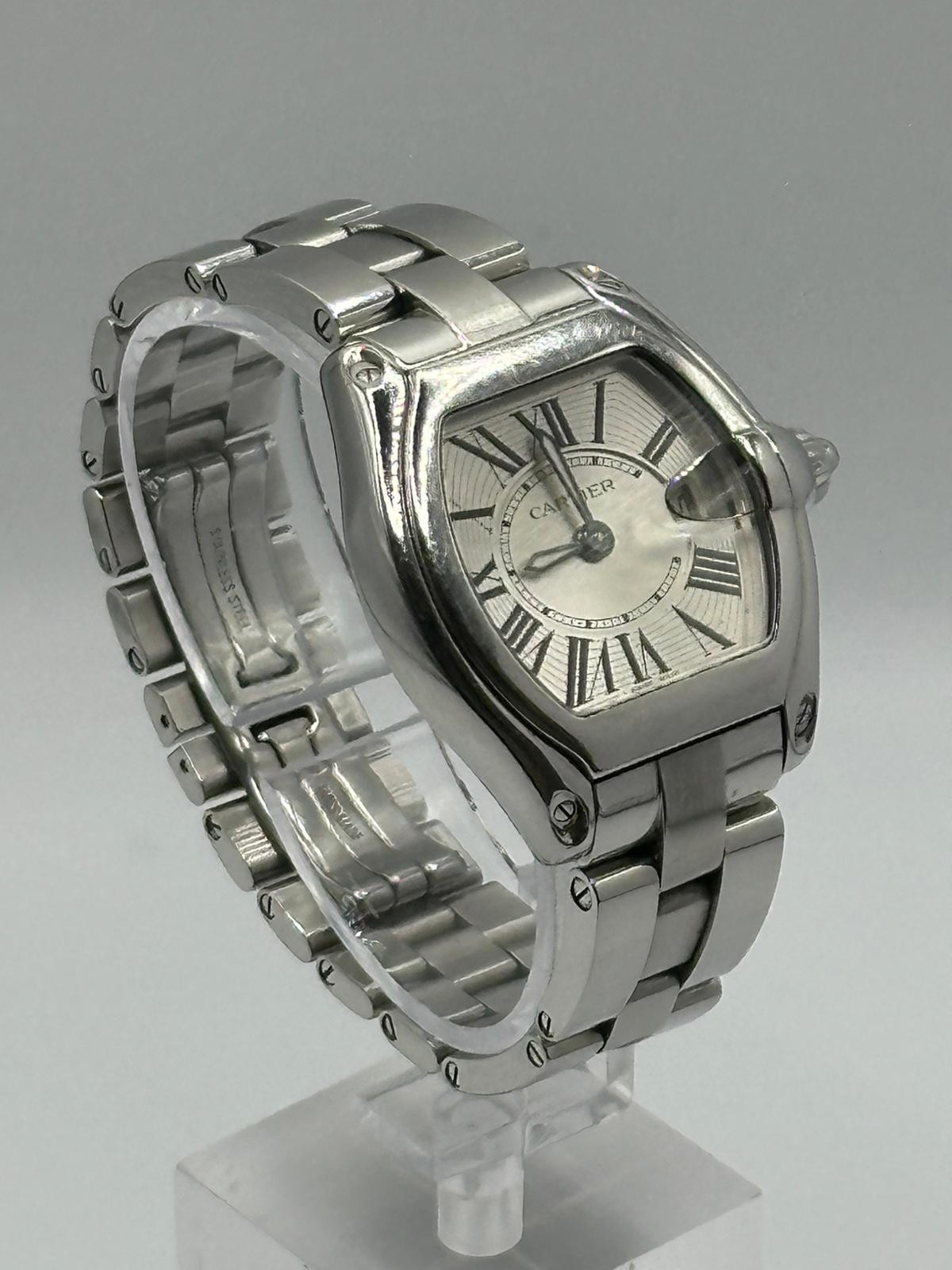 A Cartier 2675 Stainless Steel Roadster watch. 33mm case, white dial with Roman numerals, year 2005. In good working condition, please see photos. Ref 551