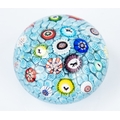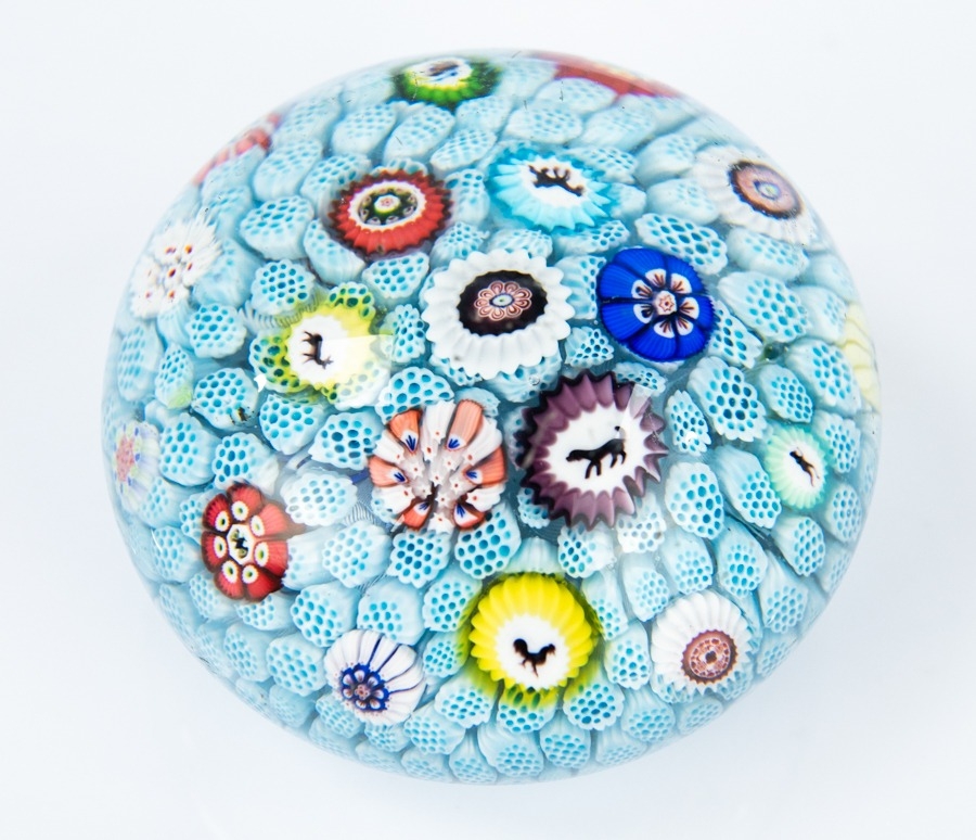 BACCARAT SCATTERED MILLEFIORI GLASS PAPERWEIGHT WITH SILHOUETTE CANES ON A TURQUOISE CARPET GROUND, 2 ¼” (5.7cm) high, 3” (7.6cm) diameter, B1848 cane, the base etched No 32 and with red and white sticky label 109 C/R- numerous minor scratches and nicks, glass uneven in places