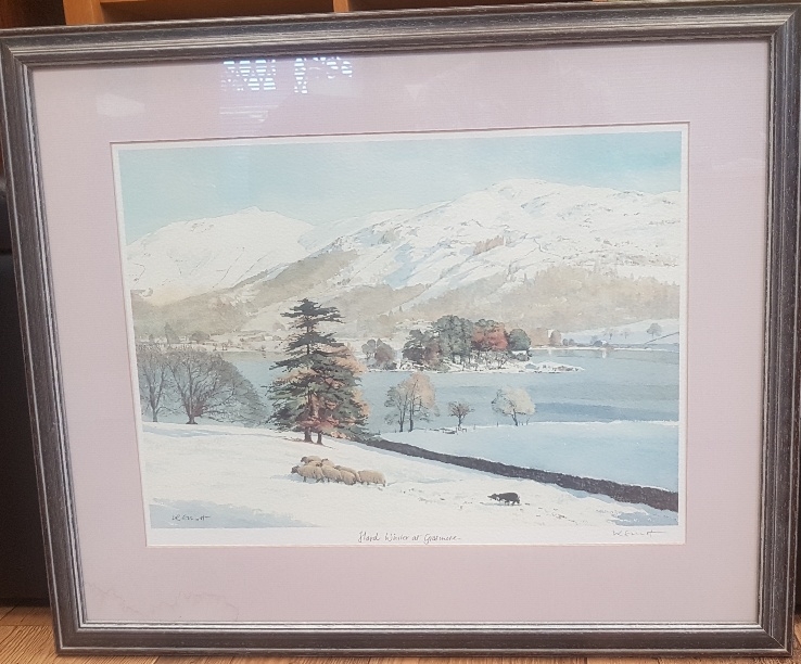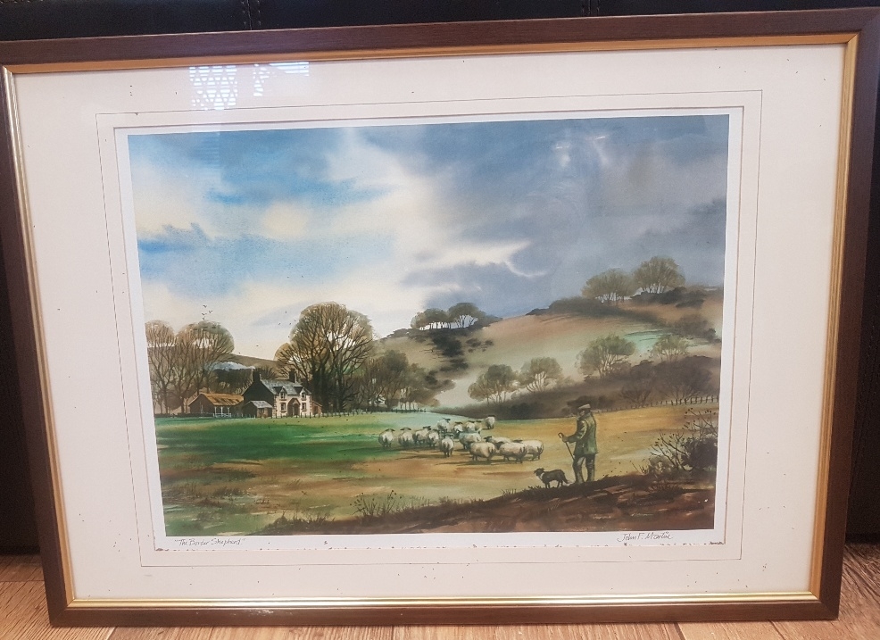Two framed, glazed and signed Shepherding Prints. The Border Shepherd by John F Martin (22 inches x 16 inches) and Hard Winter at Grasmere by D R Ellioit (27 inches x 22 inches)