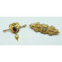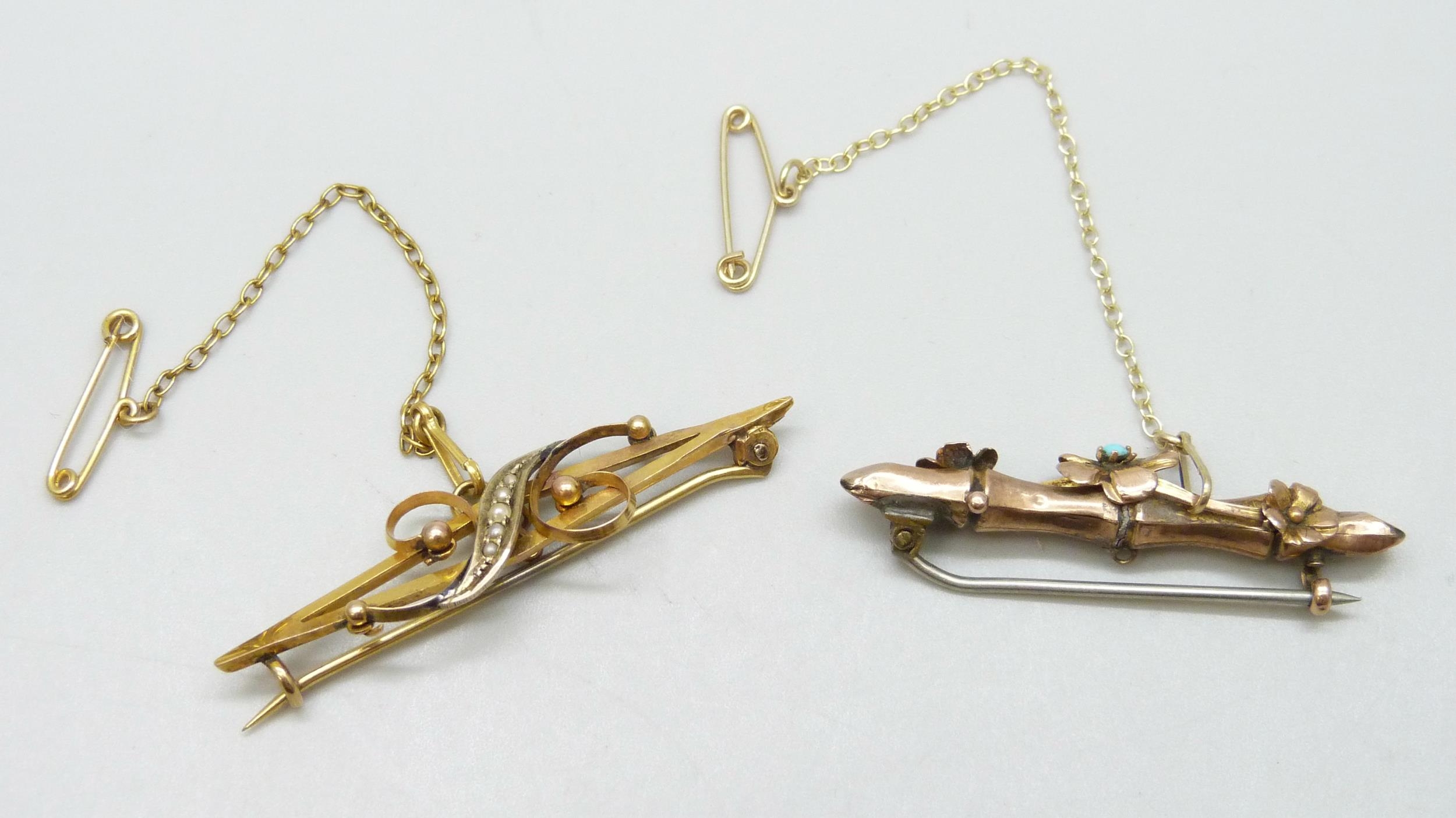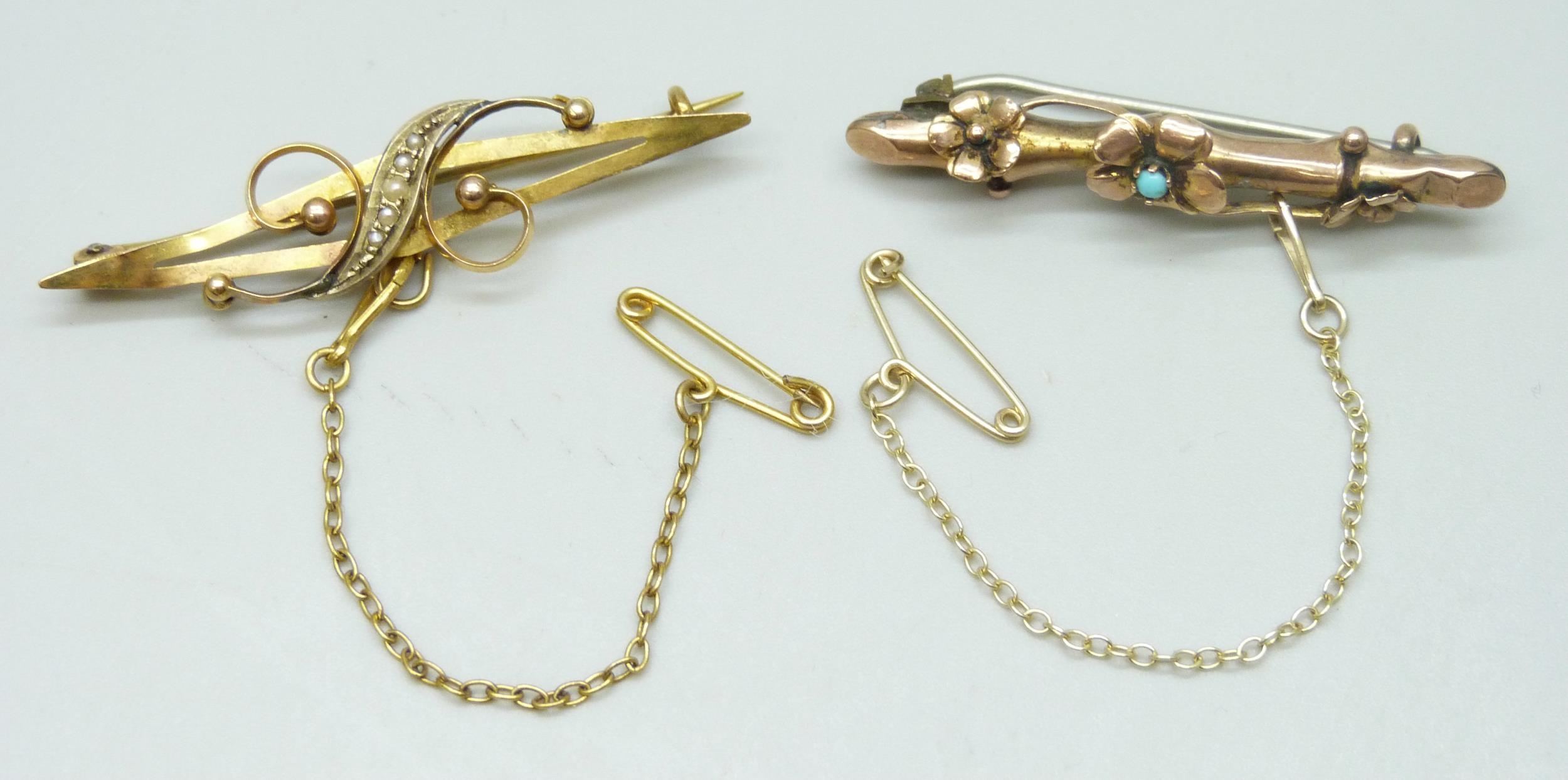 Two Victorian 9ct gold bar brooches including an Aesthetic Movement example set with turquoise, 5.9g