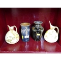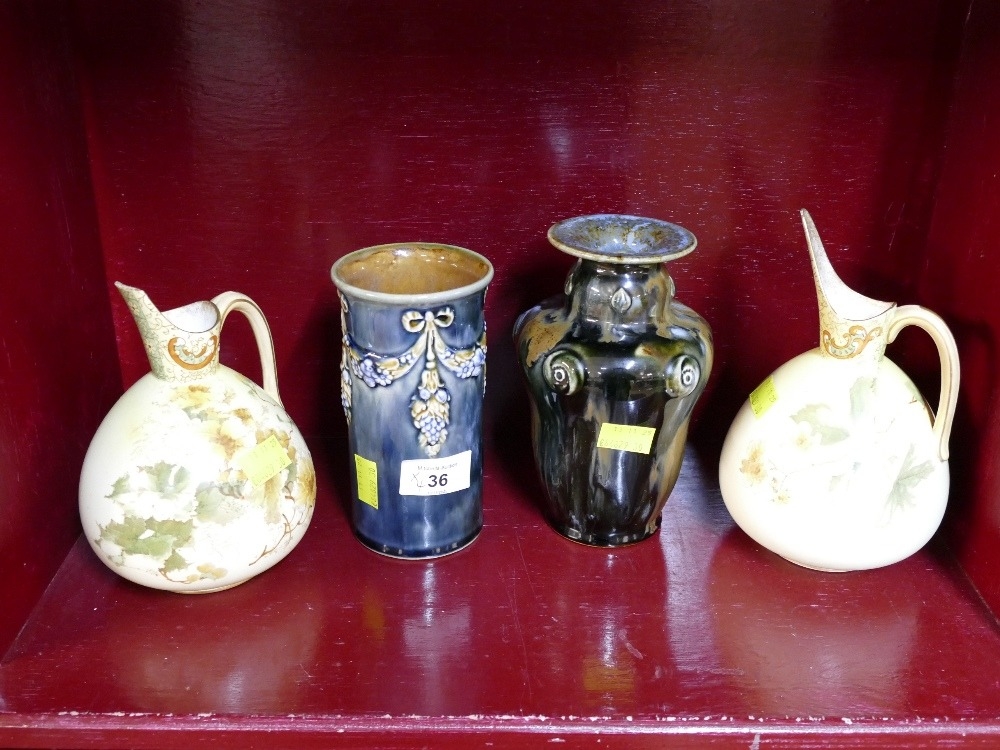 Two Royal Doulton Lambeth stoneware vases, 17 cm high, and pair of Royal Doulton Art Nouveau jugs (AF)