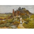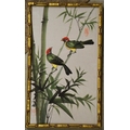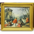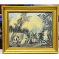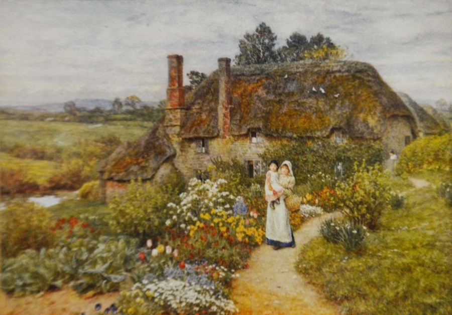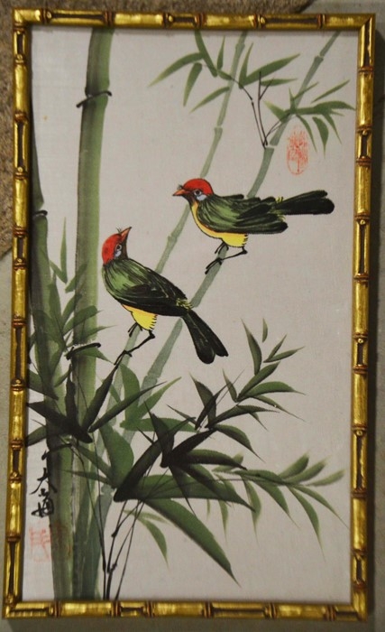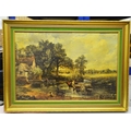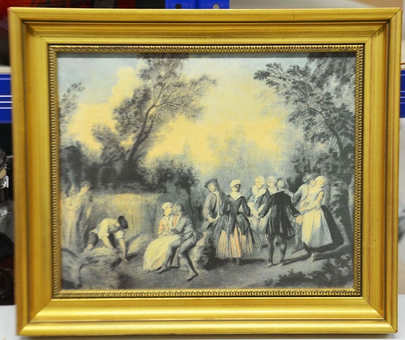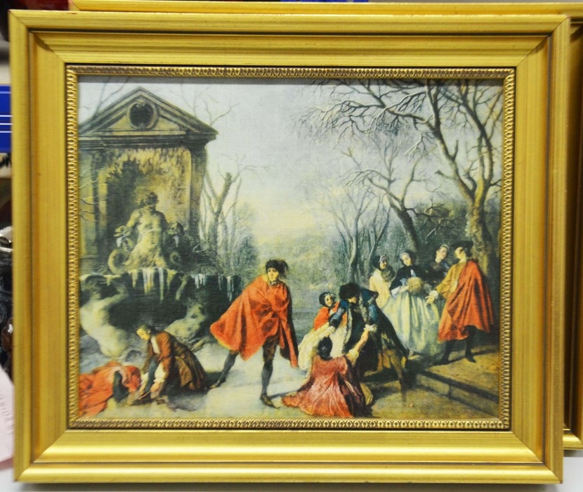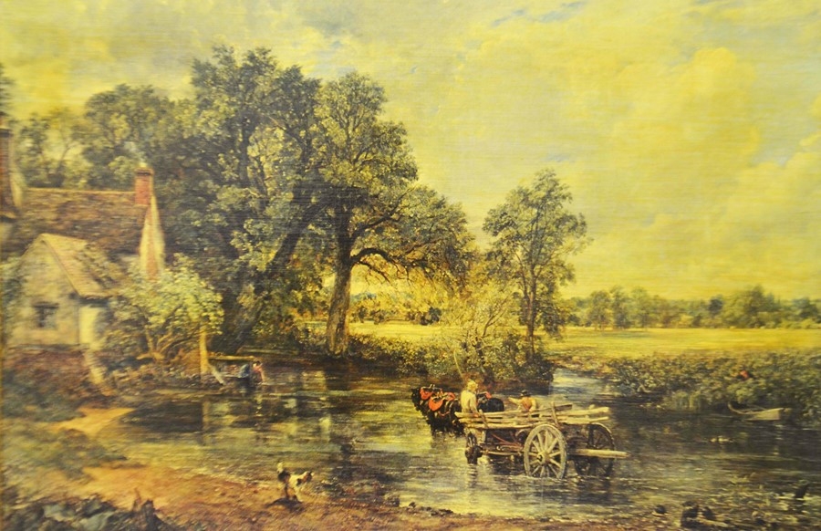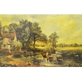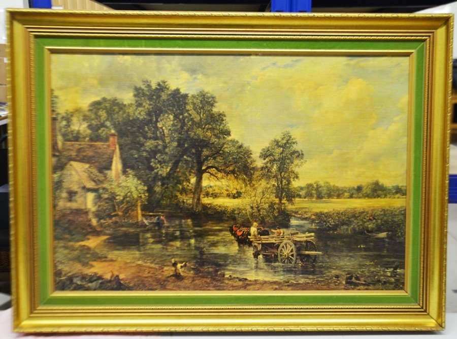 Four prints and a Chinese silk embroidery; a Fiehl Art print of the Haywain by Constable, 42cm x 62cm, framed; Helen Allingham, The Dairy Farm Nr Crewkerne Somerset, 11cm x 15cm, framed; a pair of oleographs of 17th century scenes, 25cm x 32cm, framed, a Chinese silk embroidery of two birds on bamboo, artist's mark, 23cm x 31cm, framed (5)