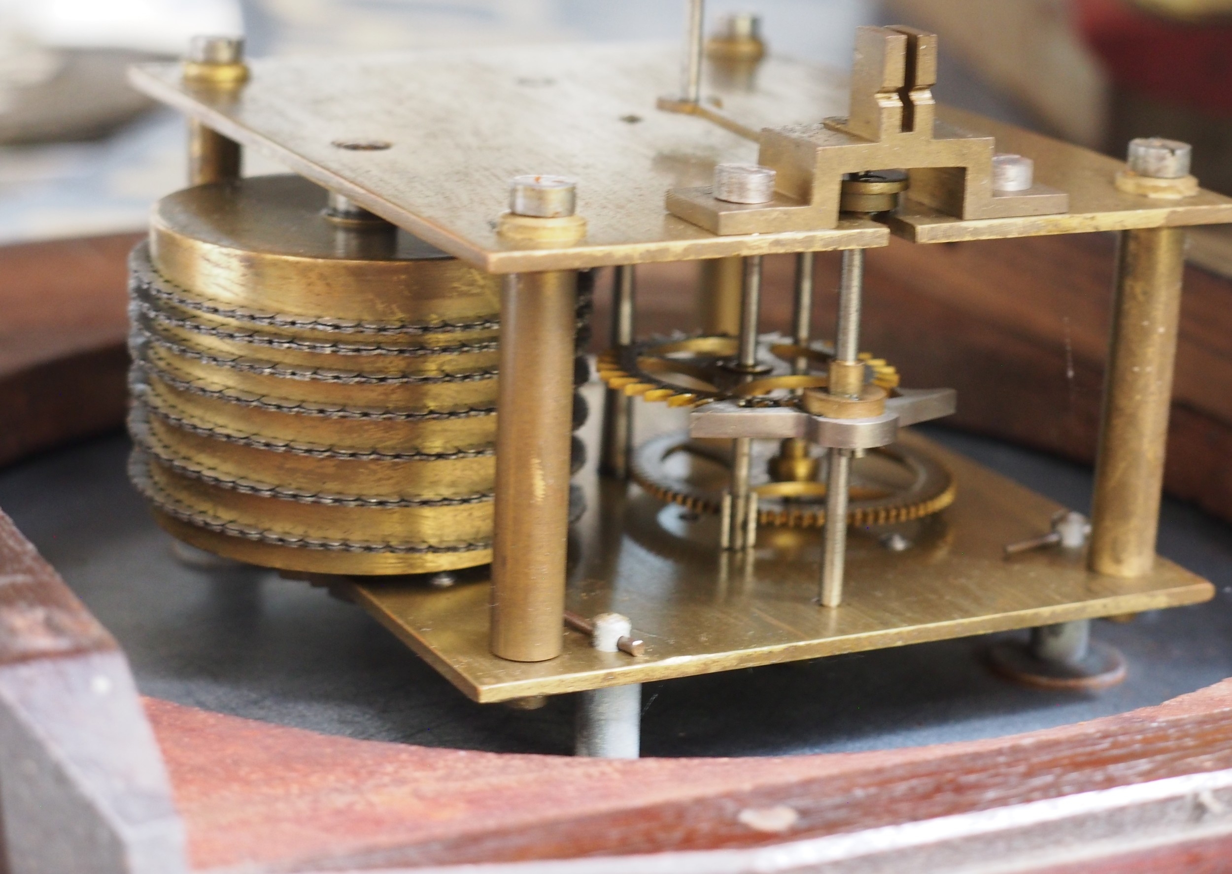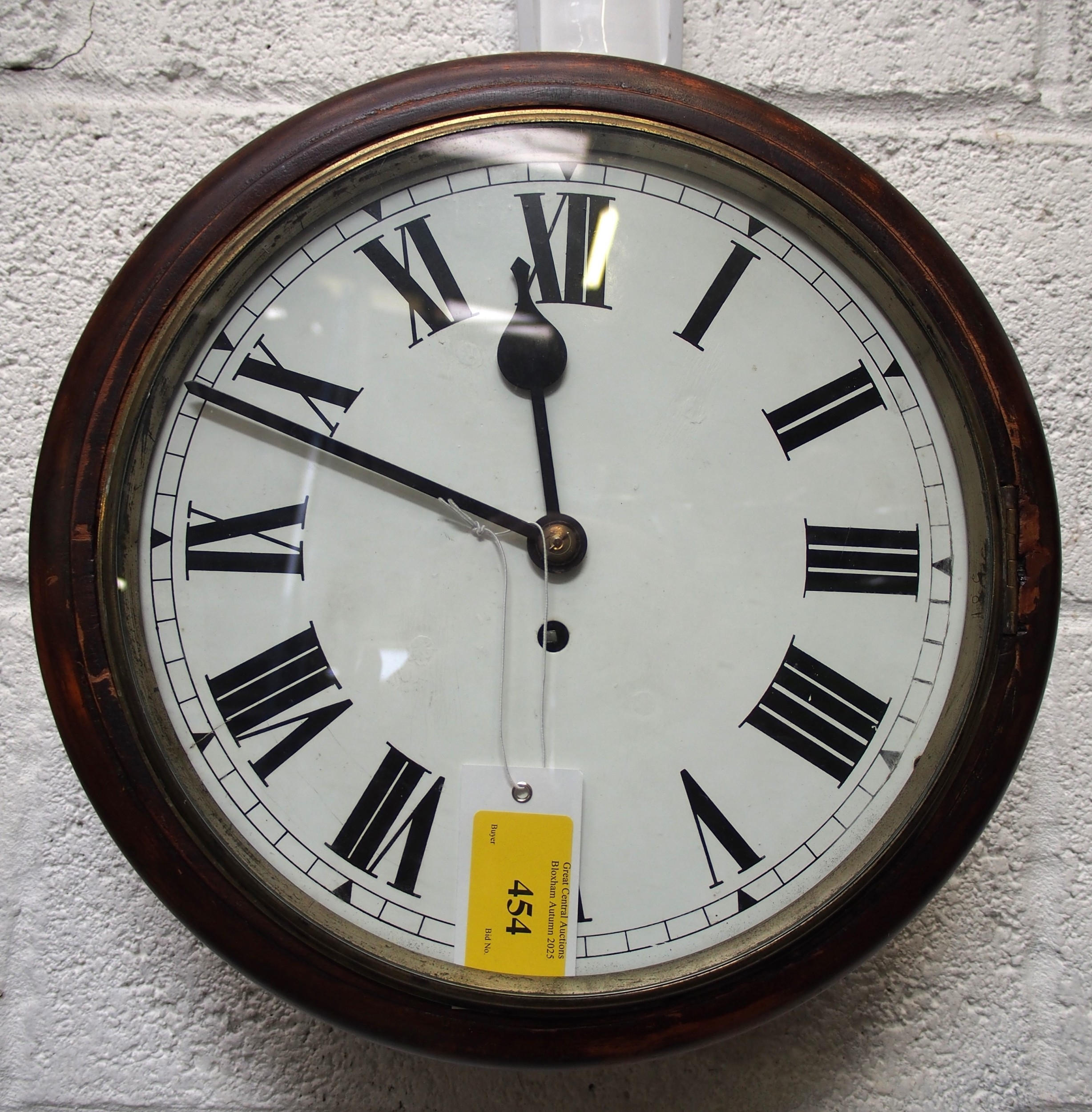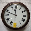 Domestic 12" face wall clock, cast brass bezel with ground glass, chain driven single Fusee movement held between square plates stamped 01910 LONDON LCC, mahogany case with right hand case door & rear drop door with lock, pendulum & bob but no key, working condition. (WBCK) (Dispatch by Mailboxes/Collect from Banbury Depot)