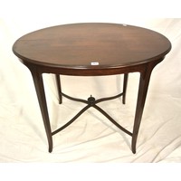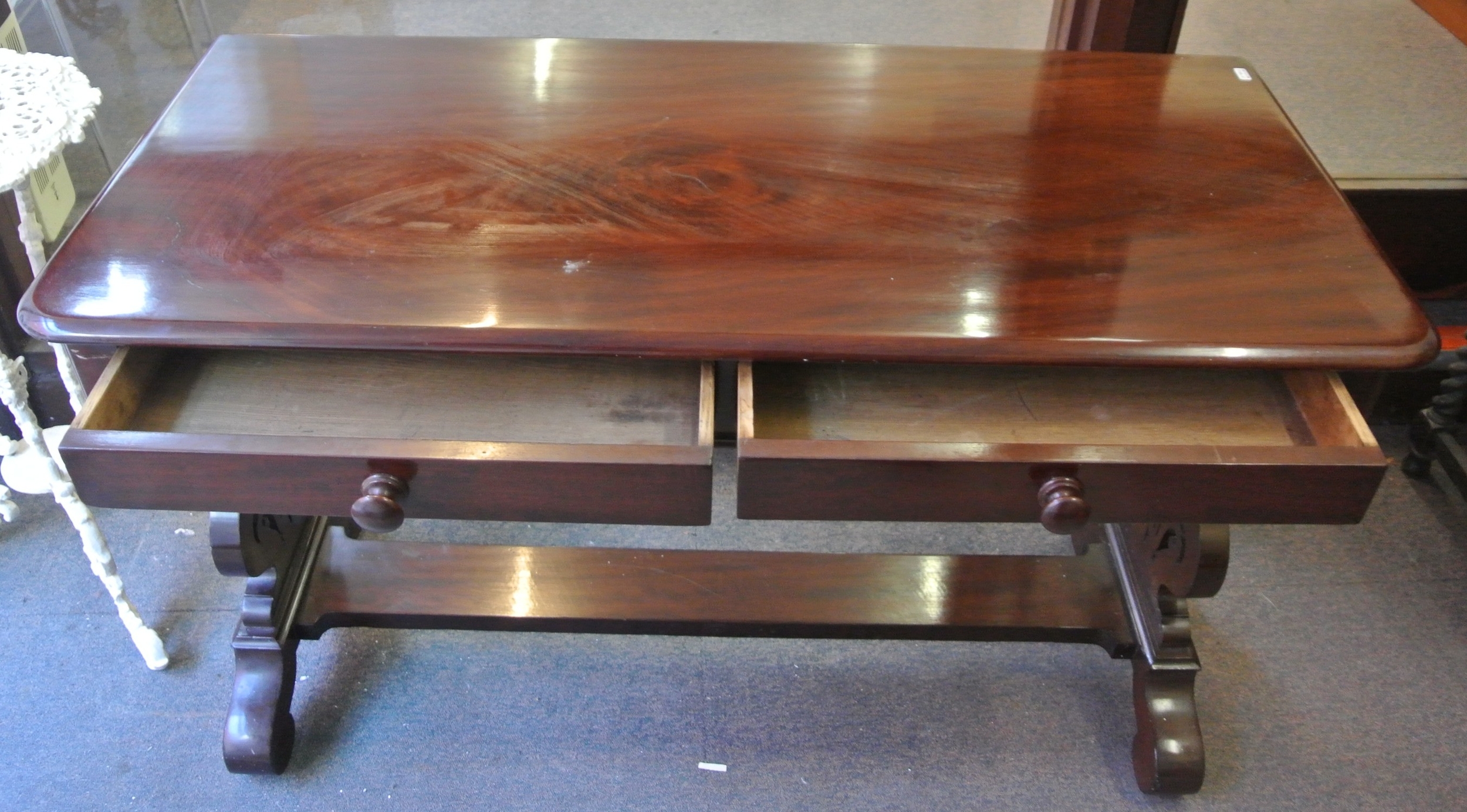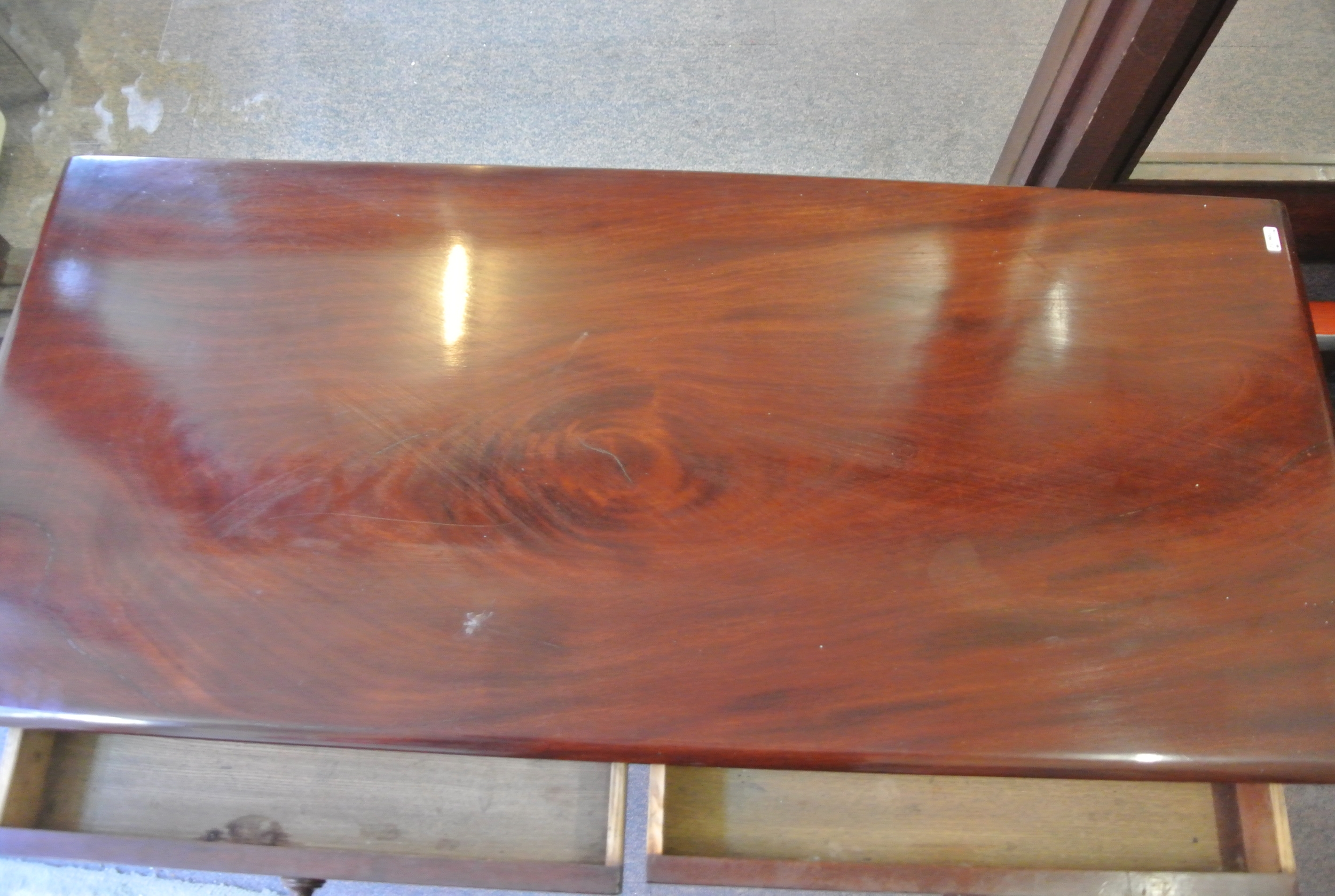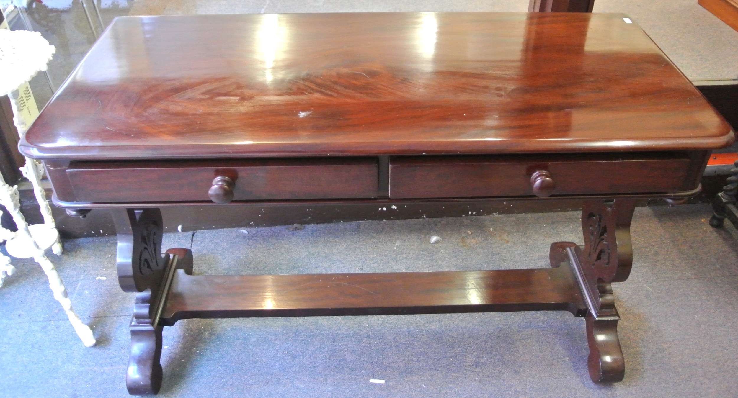 Victorian style mahogany hall or side table with 2 frieze drawers, bun handles, shaped columns, oblong stretcher, on scroll feet with castors