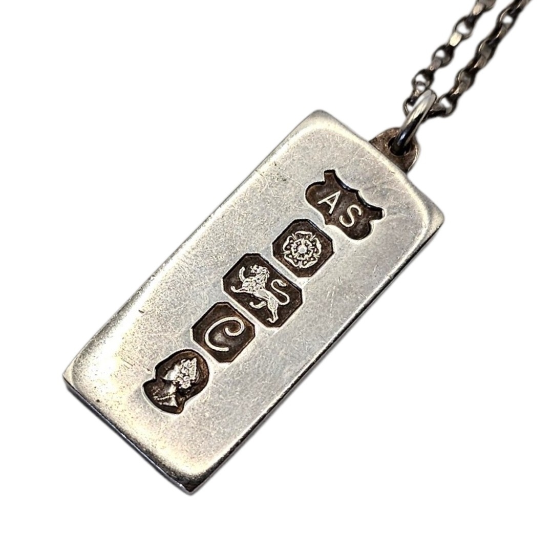 Plain form, hallmarked Sheffield, 1977, on a fine link necklace chain.