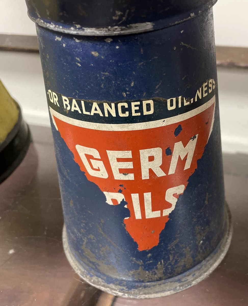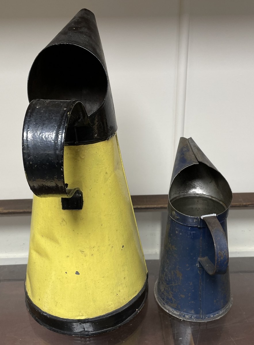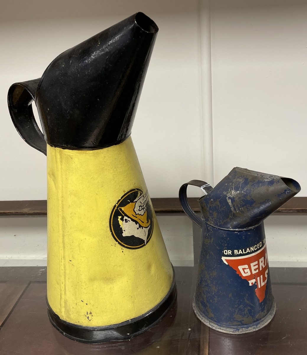 A Germ Oils jug, 23.5 cm high, and another similar, re-painted, 42 cm high