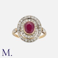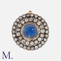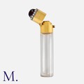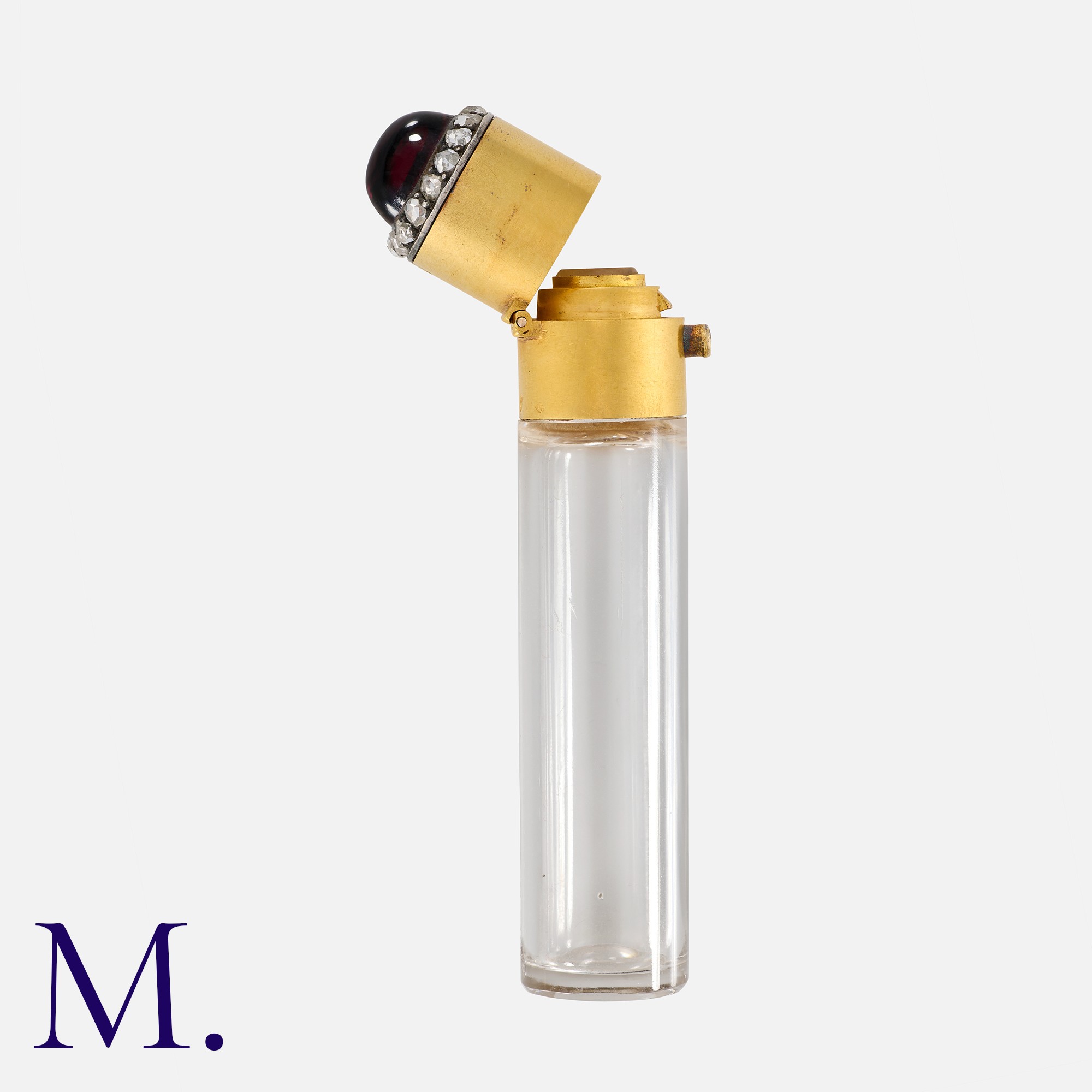A Fine Antique French Perfume Bottle in 18 carat yellow gold, the cylindrical glass scent bottle, with a rose cut diamond set push button. The lid composed of a circular cabochon garnet within a border of rose cut diamonds. French Assay Marks.