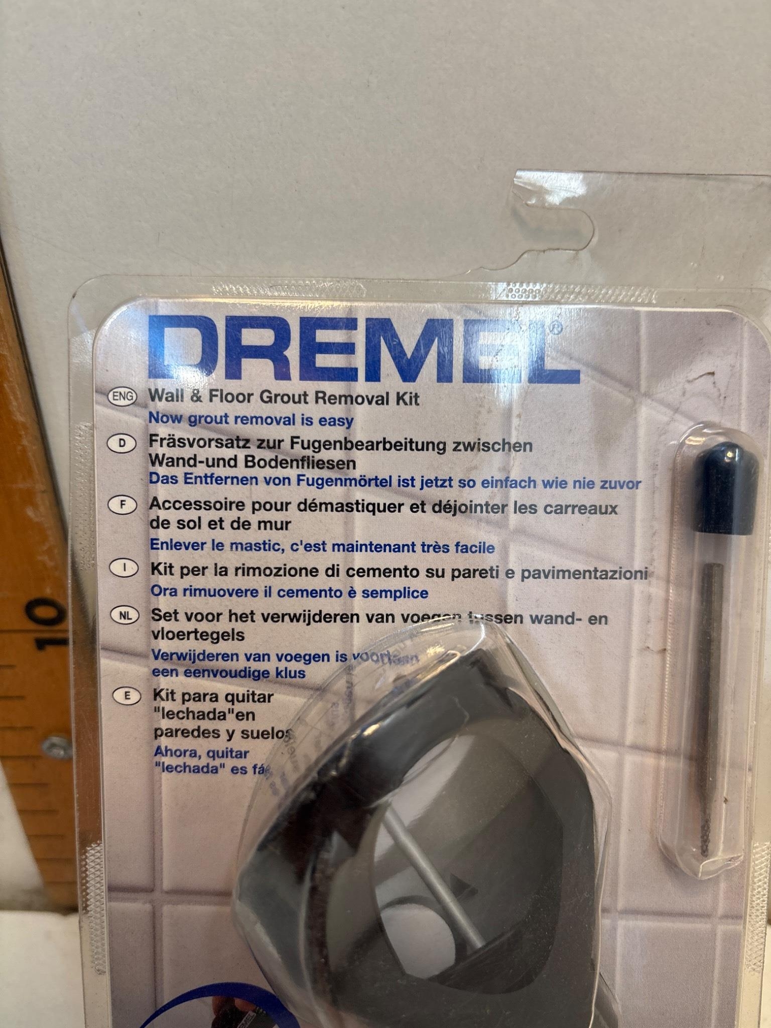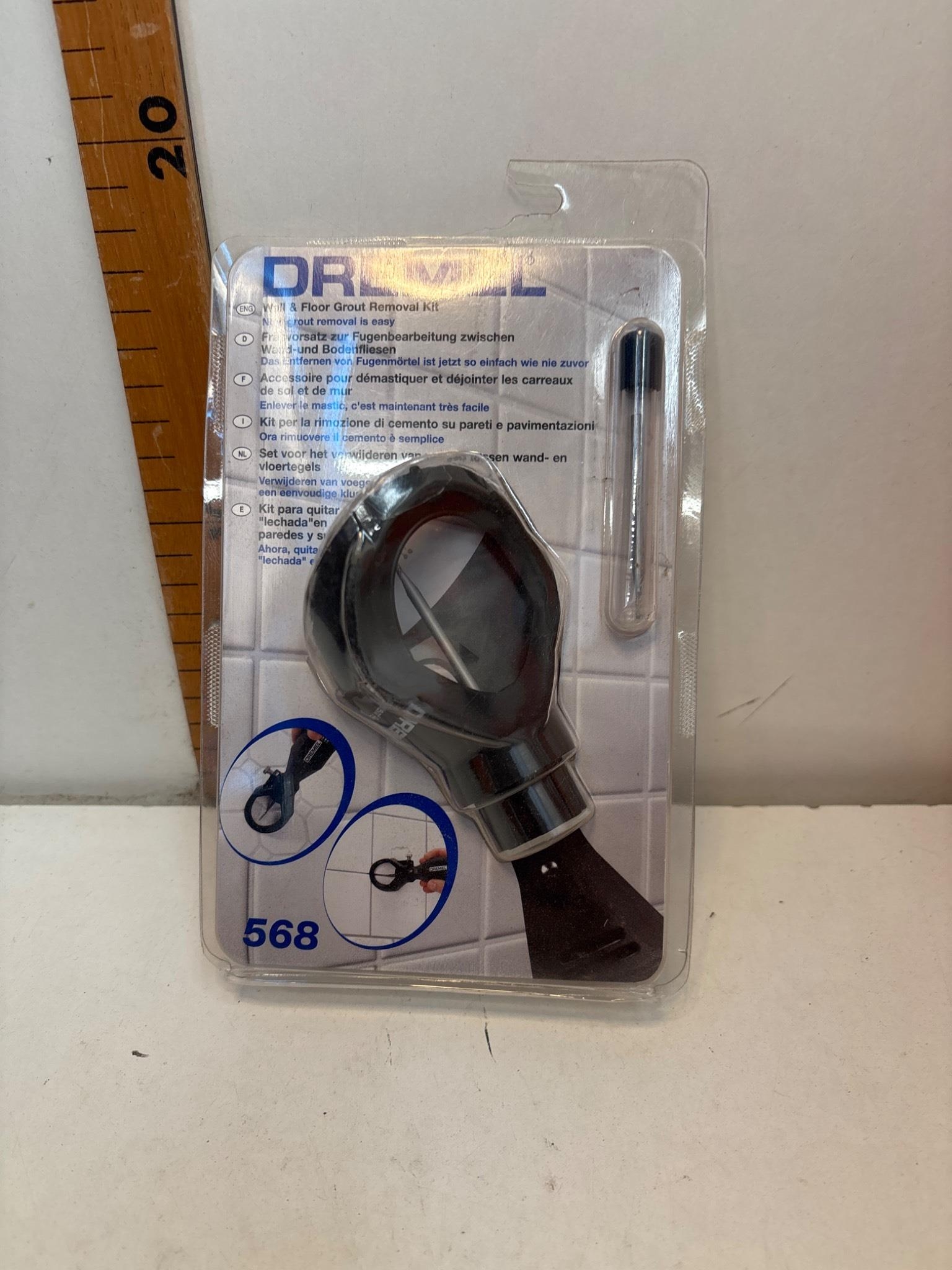 Dremel wall and floor grout removal kit, model 568, includes an attachment and one bit, in original packaging.