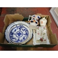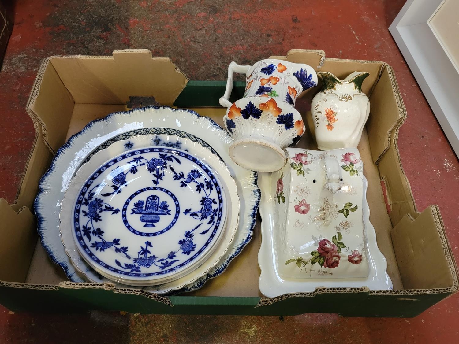 Box to Include Blue & White Plates, Cheese Dish with Cover & Jugs.