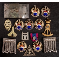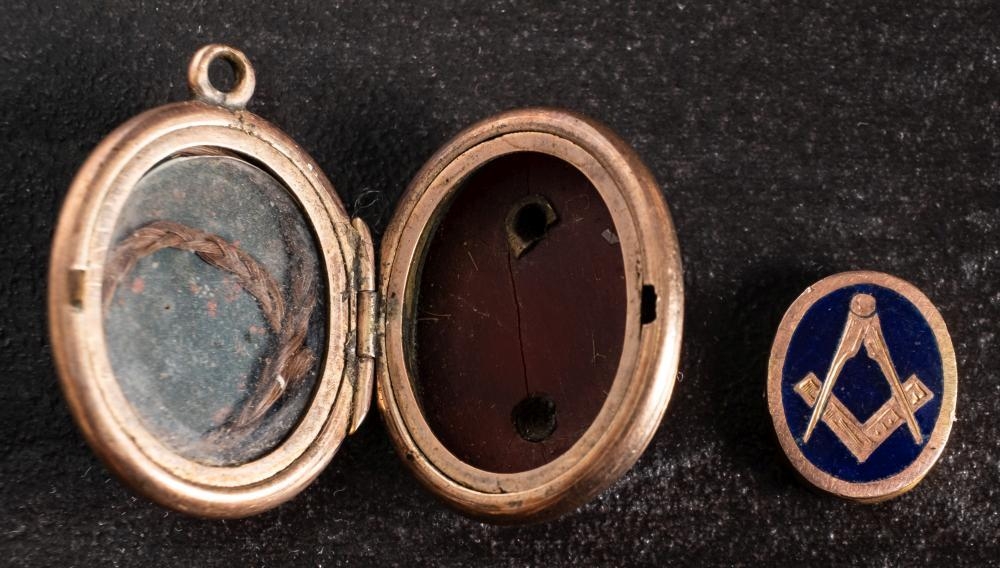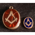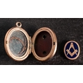 A yellow metal oval Masonic cameo pendant: one side set with compass and square the other with vacant bloodstone seal, together with a yellow metal Masonic ring reversible platform. (2)