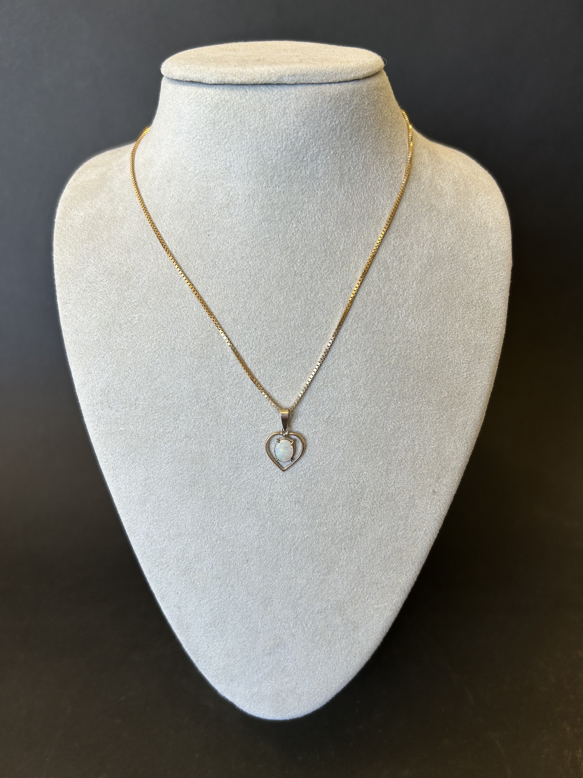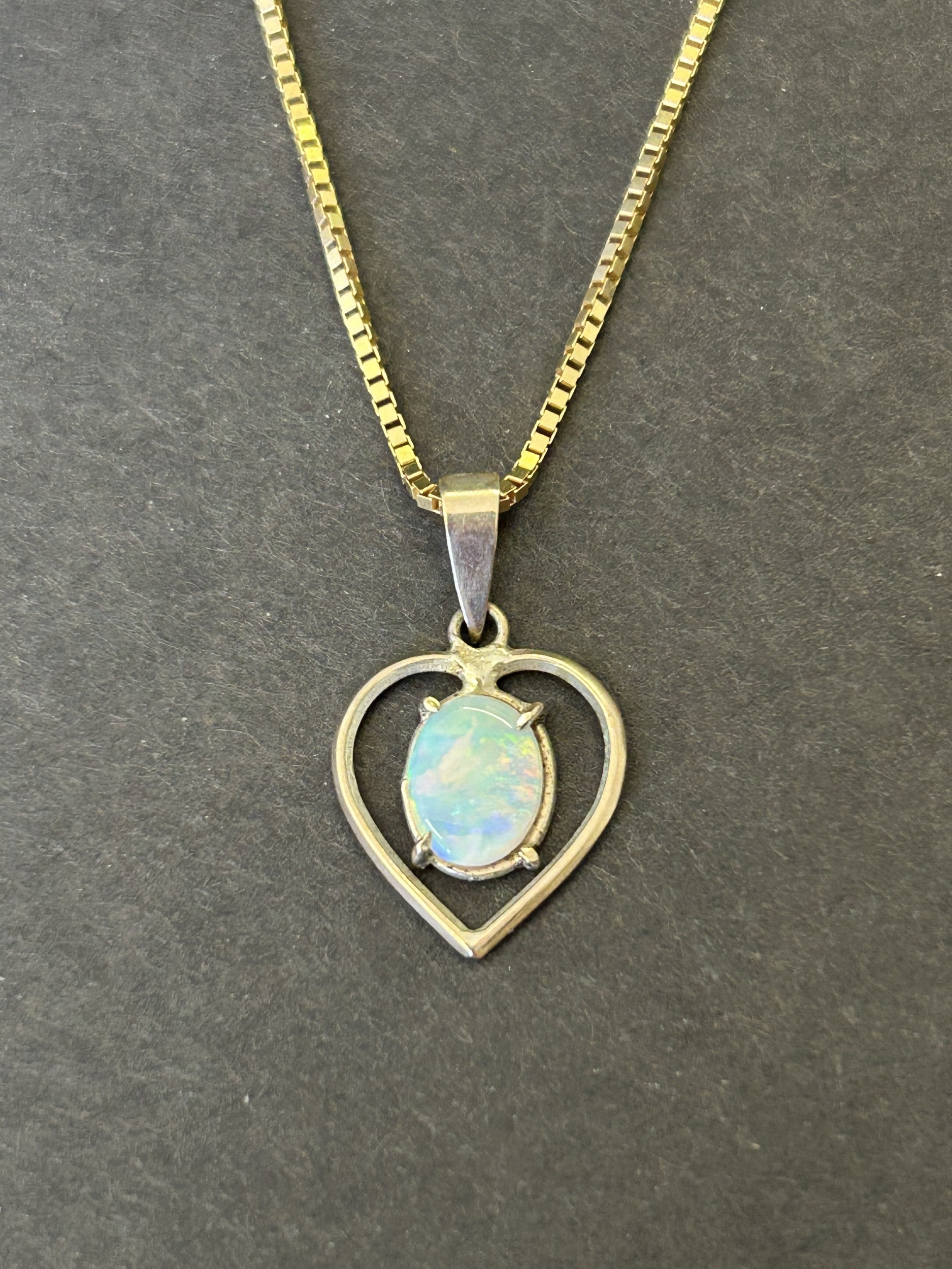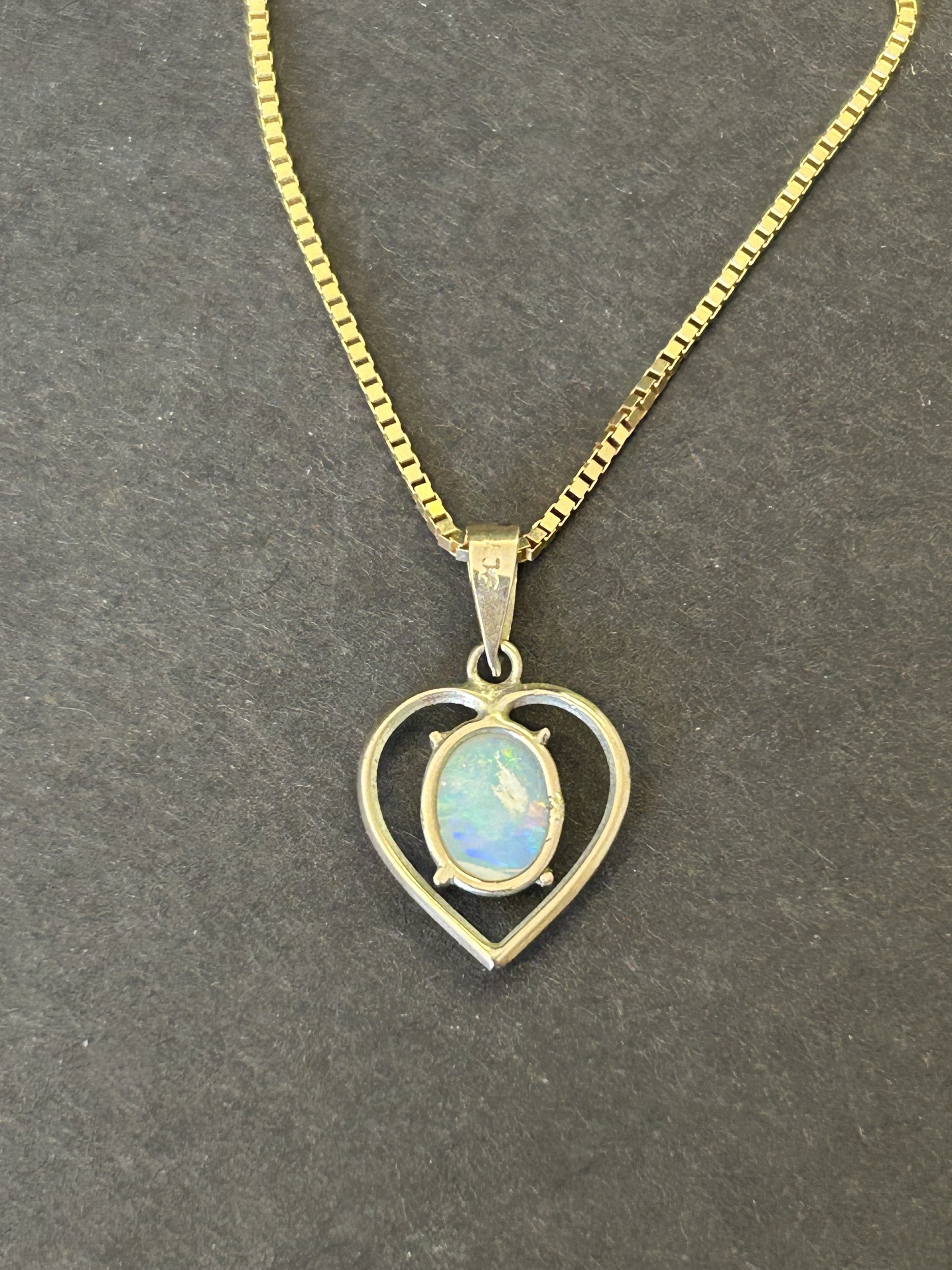 A 9ct gold and opal set heart shape pendant and chain, total weight approx. 3.4g