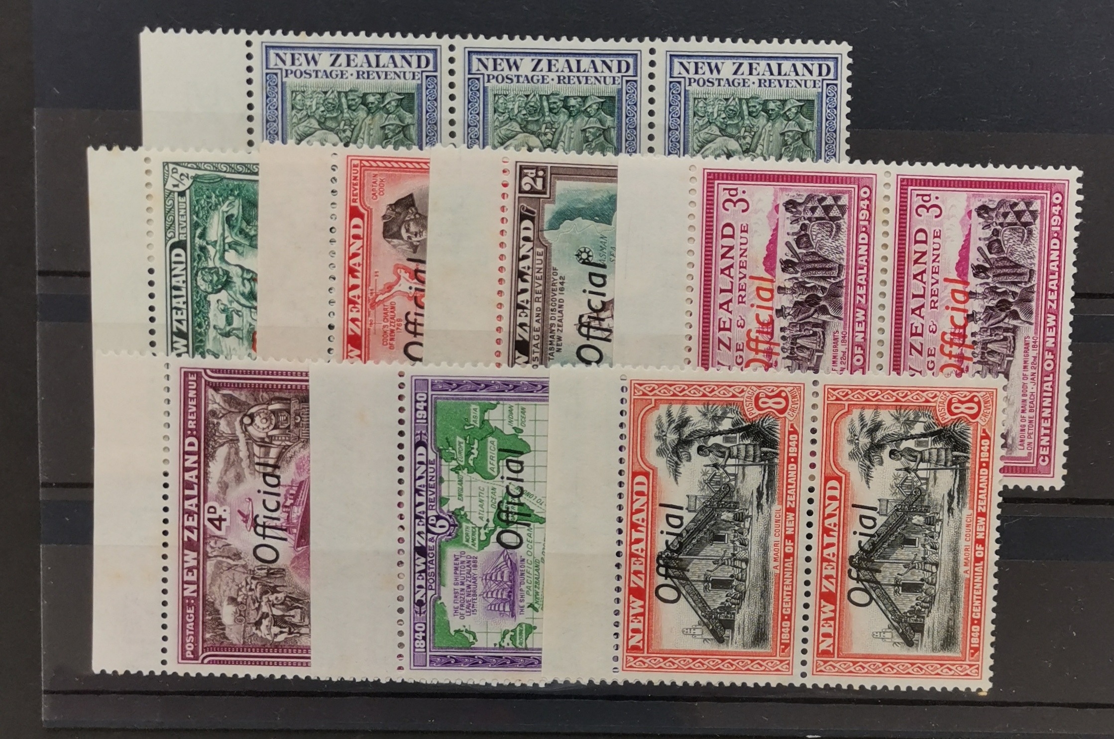 NEW ZEALAND. OFFICIALS. 1940 Centennial ½d to 8d set of 8 values in marginal M pairs (2½d in strip of 3) showing "ff" jointed varieties. The 2½d strip is mounted on central stamp otherwise stamps unmounted. Cat. £697. (17)