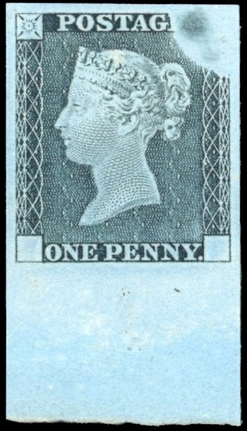 1840 1d Rainbow trial (State 3) lower marginal, in black on white wove paper, dipped in prussiate of potash, fine and scarce. Spec. DP20(C)a cat £7500
