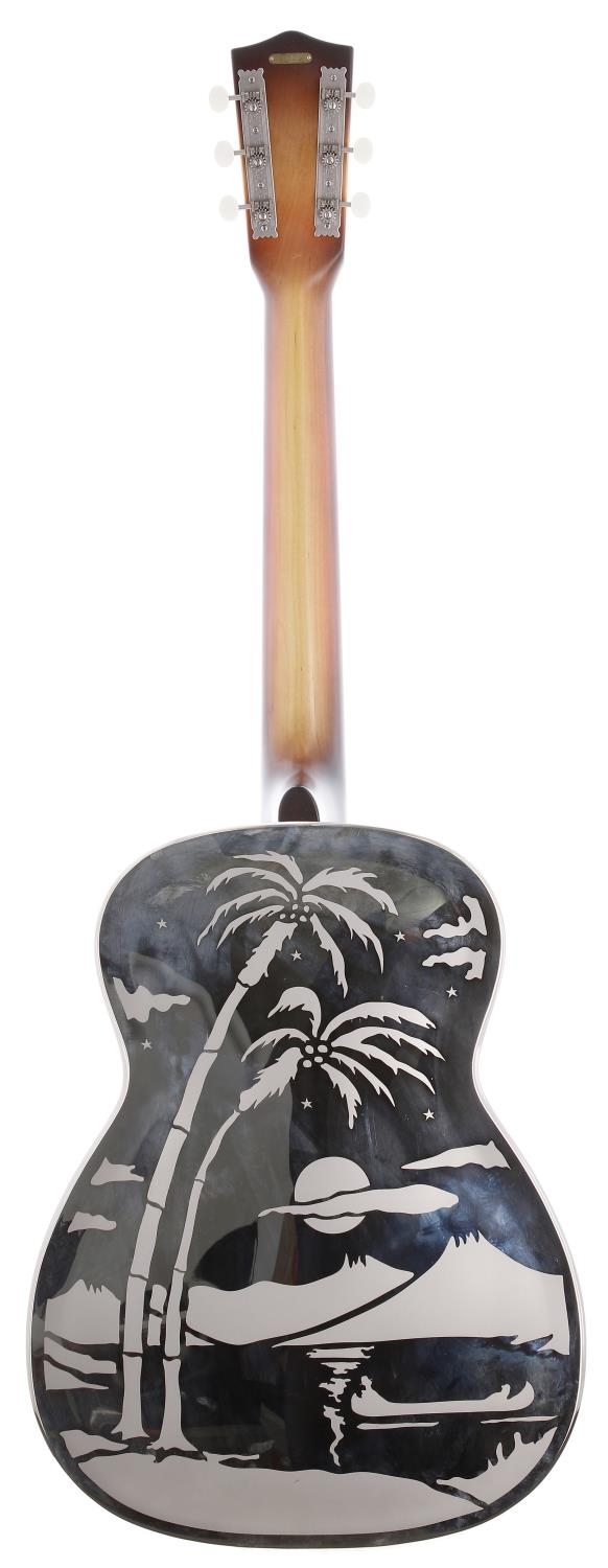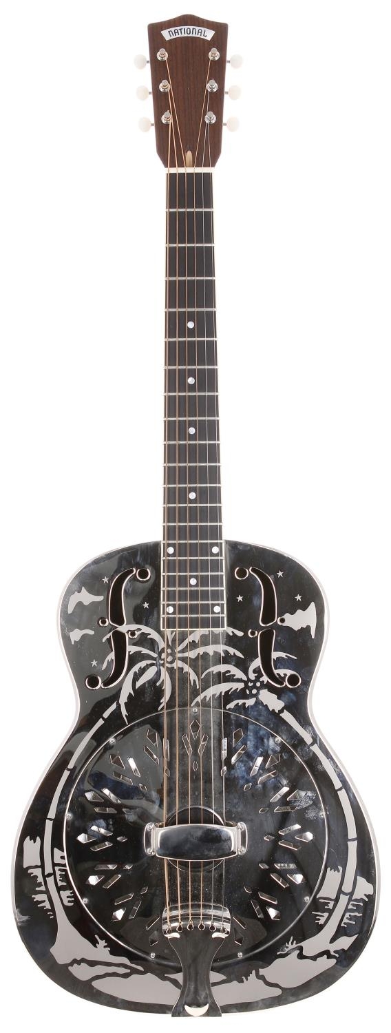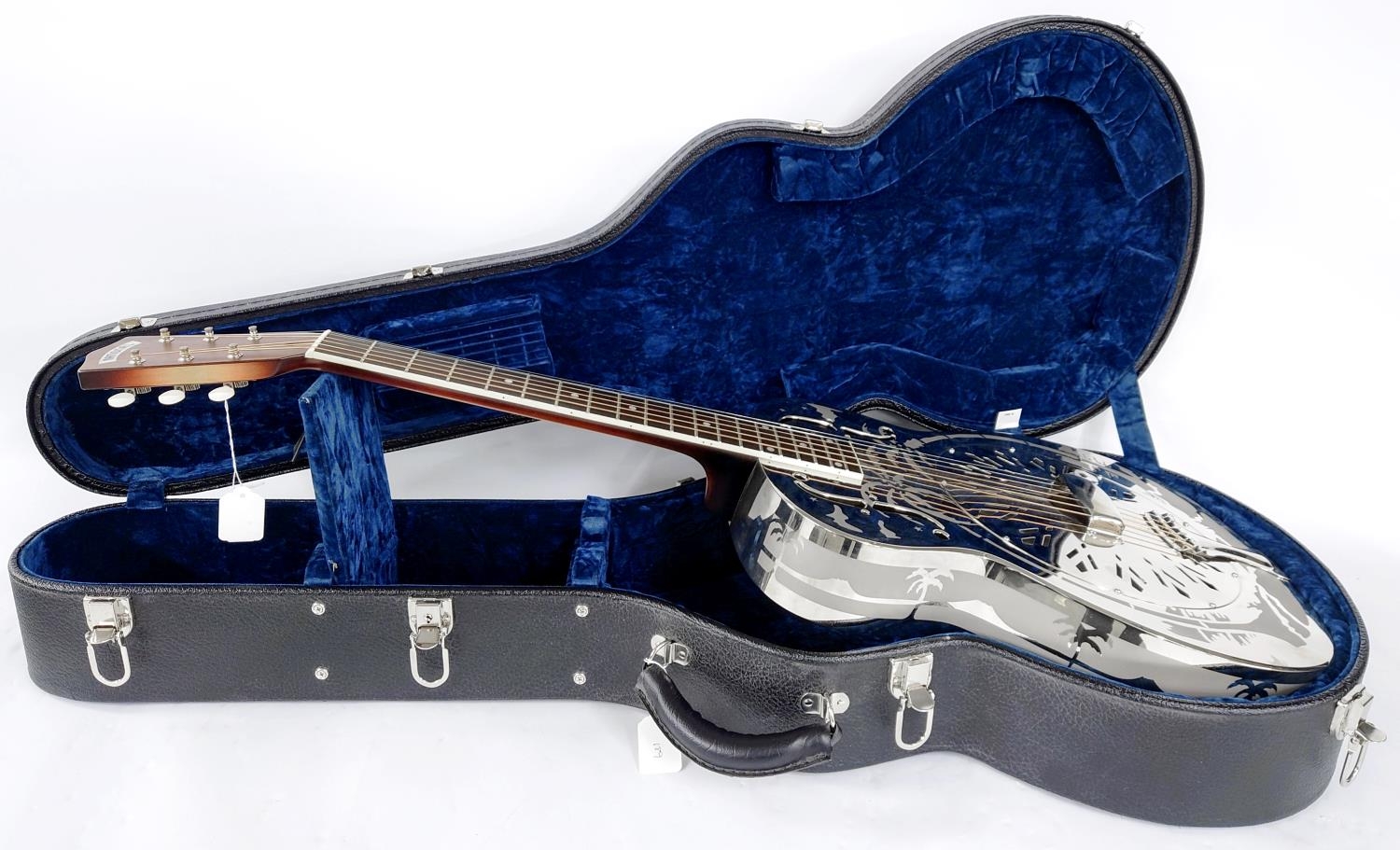 2018 National Reso-Phonic 0-14 single cone resonator guitar; Body: polished plated brass body with Hawaiian etching; Neck: sunburst finished maple; Fretboard: ebony; Frets: good; Hardware: good; Case: original hard case; Overall condition: very good