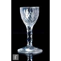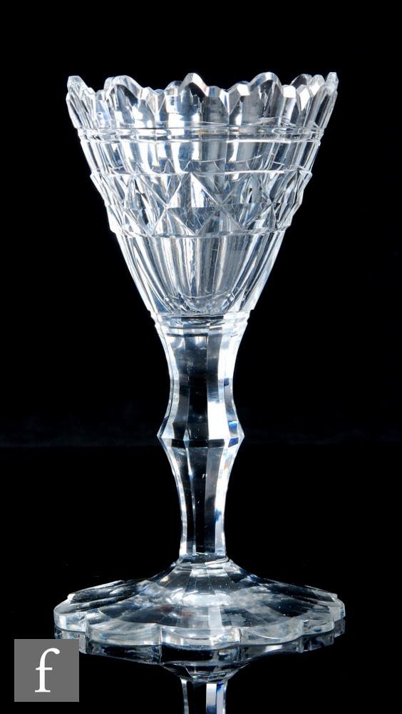 An 18th Century sweetmeat, circa 1785, the conical bowl with a Van Dyke style rim above flat cut decoration and slice cut medial knopped stem, raised to a petal edge, facet cut conical foot, height 17cm.