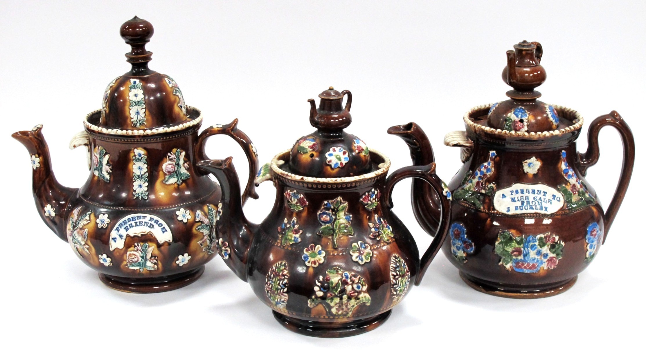 A Mid XIX Century Pottery Barge Teapot and Cover, the brown treacle glaze ground applied with flowers and inscribed "A Present From a Friend", 33cm high; Two Others, 27cm and 30cm high. (3)