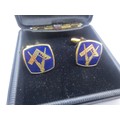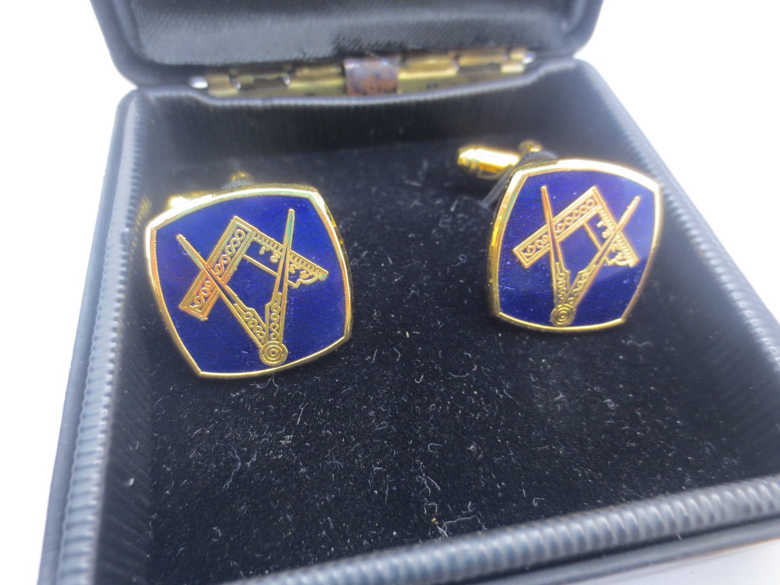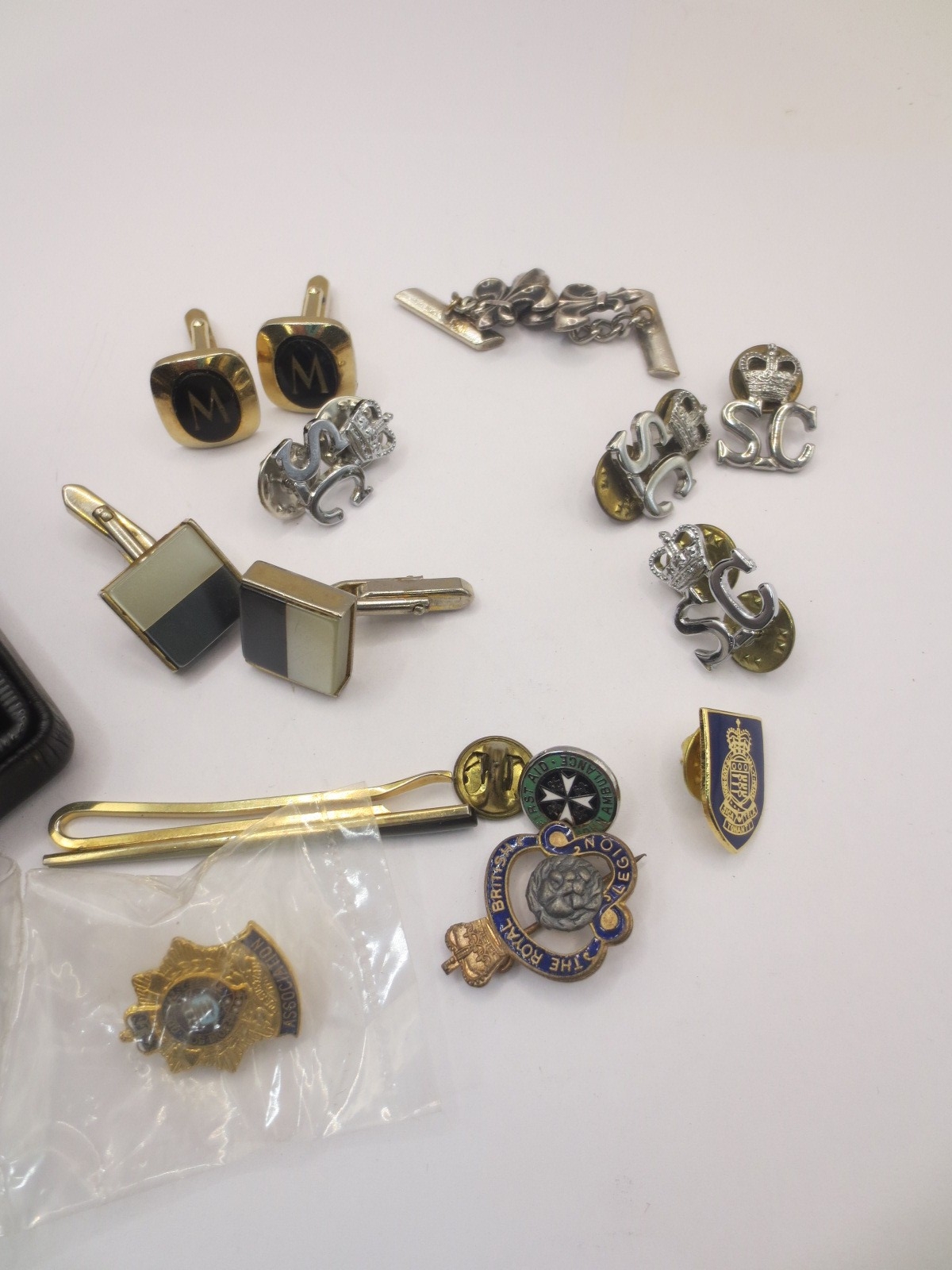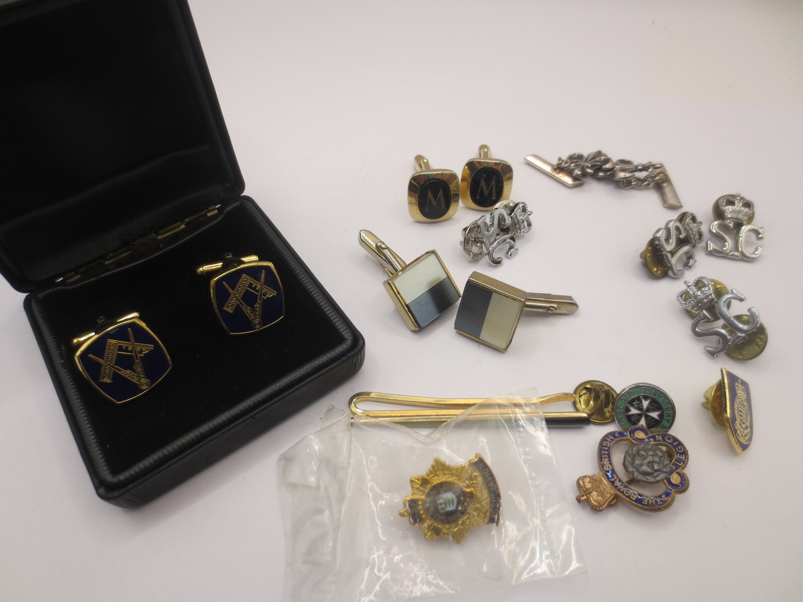 A pair of Masonic cufflinks in case, together three pairs of other cufflinks, a tie clip, RAOC button, Special Constabulary buttons, and a Royal British Legion enamel badge
